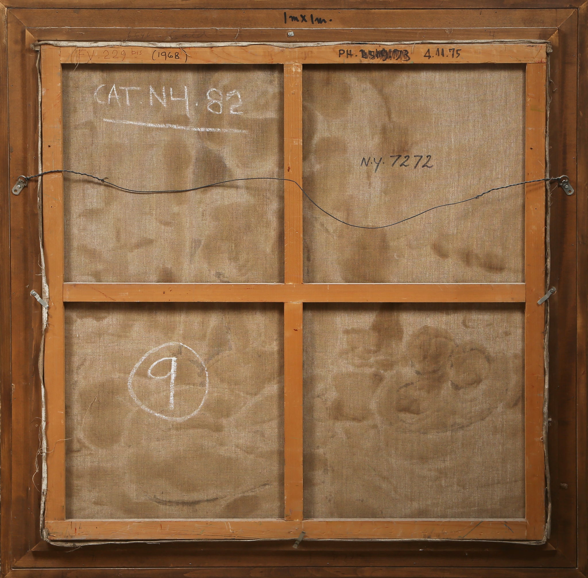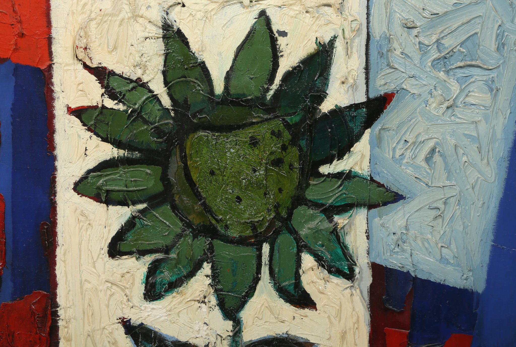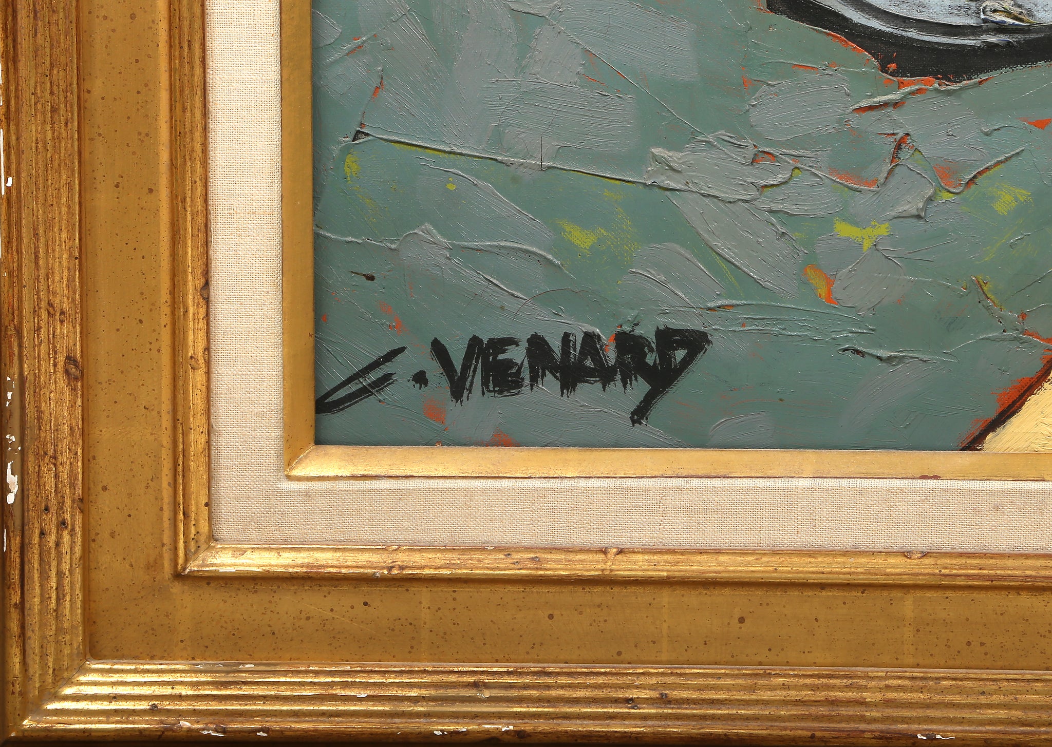 French artist Claude Vernard uses a technique called impasto to create physical texture and visual dimension to his paintings. This Cubist depiction of a still life with a sunflower in a vase and a bowl of fruit is simple on its own, but the textured paint adds new dimension to what would be an otherwise flat composition. Vernard has used color very selectively to imply that the vase and flower are alone illuminated by a single beam of sunlight. Provenance: Galerie Felix Vercel, New York.