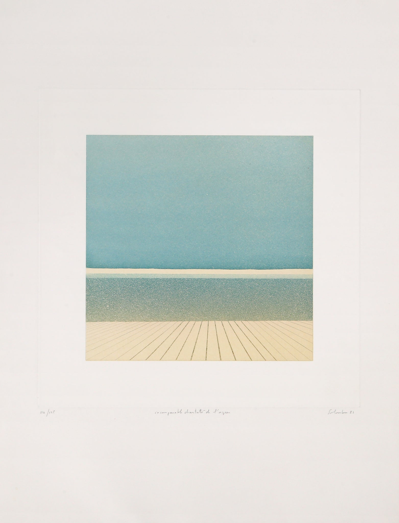 Immerse yourself in this numbered, hand-signed etching that celebrates the azure summer sky through Modern Art and Landscape movement influences. Jean Solombre captures the essence of a boardwalk horizon with poetic sensibility. The Landscape movement's tradition of finding transcendence in nature creates a deeply moving artistic experience. This exceptional etching transforms the simple beauty of summer sky into a profound meditation on light and space.