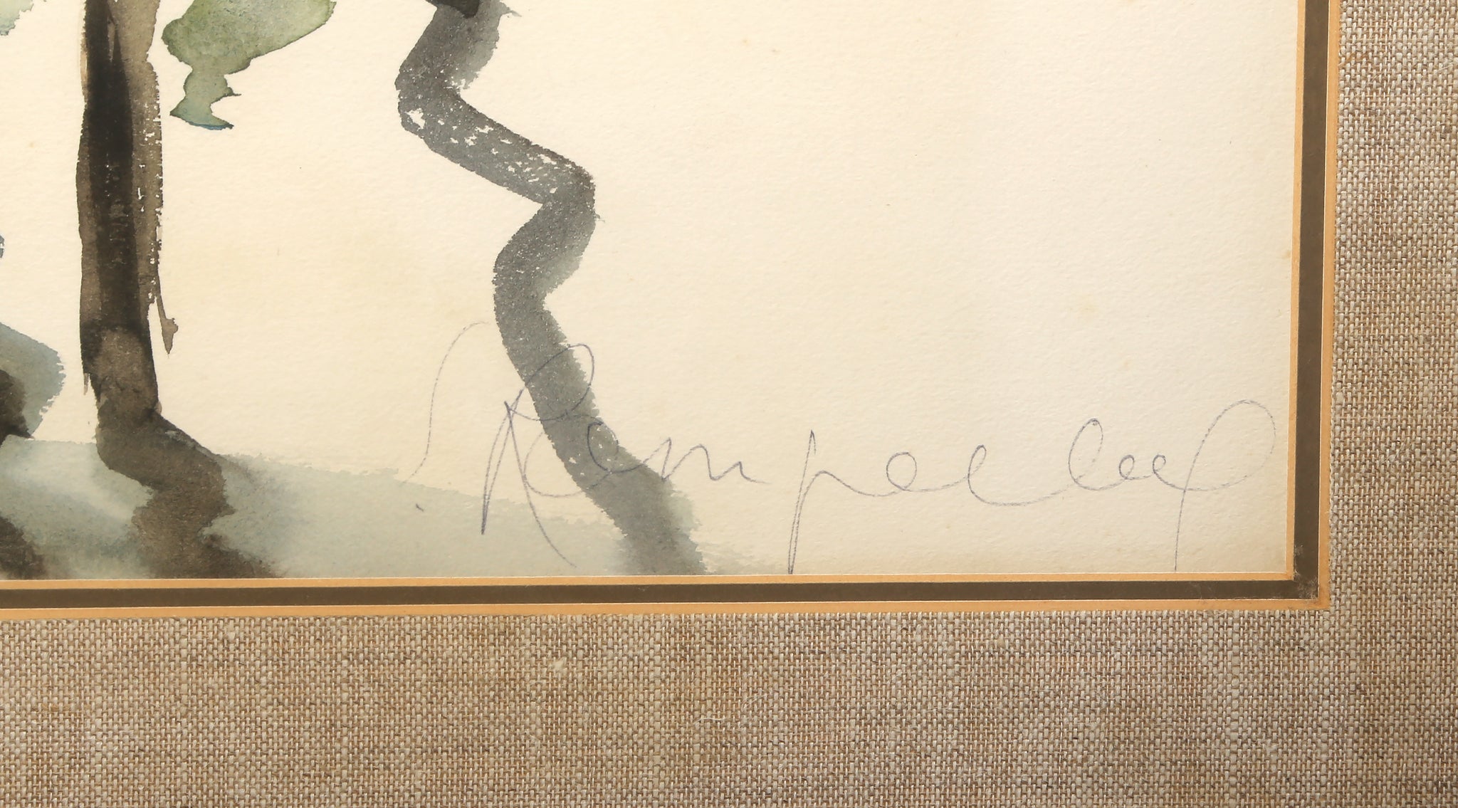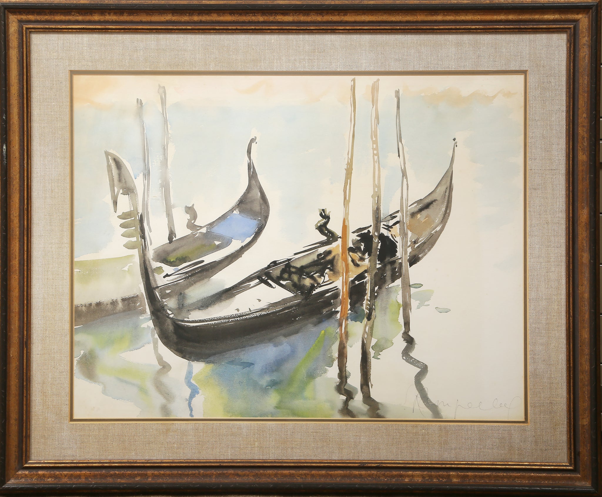In a glimpse of a moment that could only have been caught on the canals of Venice, Italy, Emile Rampelberg focuses his attention on two gondolas bobbing on the water. There are no figures or towering feats of architecture to impede on the composition as there would be in typical depictions of the floating city. Instead, Rampelberg creates a moment of peace free of the noise of the world around him. Even the water fades to white in the distance, centering the focus and importance of the work solely on these two solitary boats. Provenance: Galerie Felix Vercel, New York.