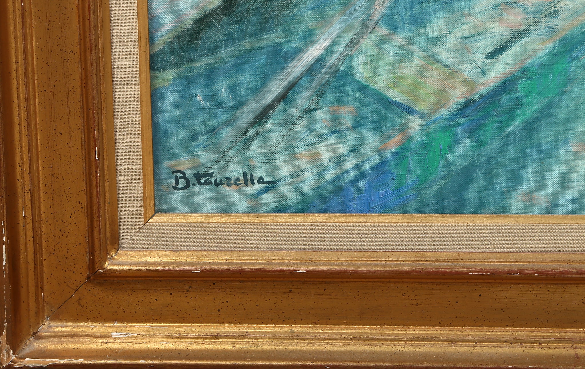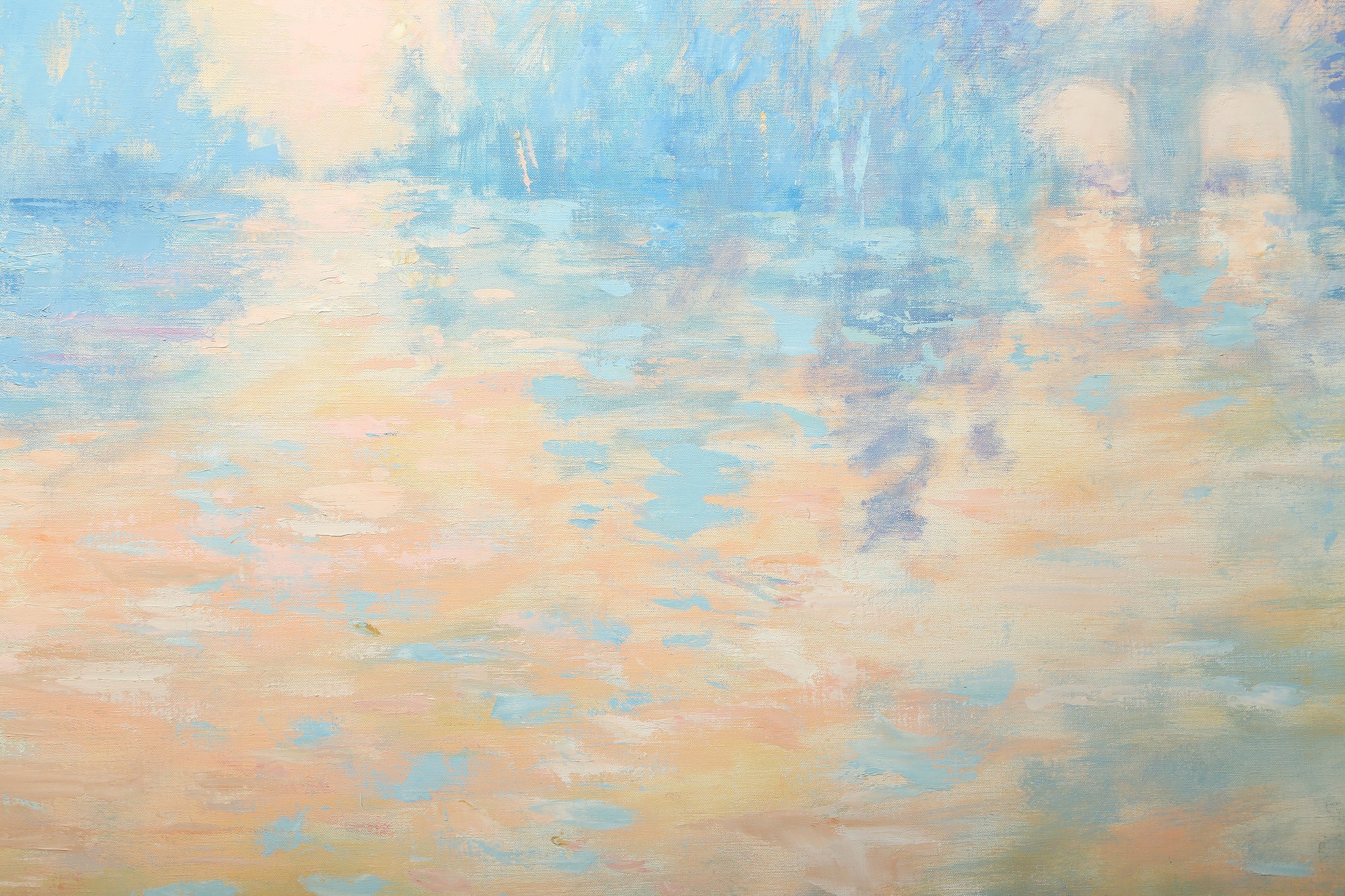 This pastel scene is reminiscent of many of the riverside compositions created by French Impressionism pioneer, Claude Monet. Here, artist Bernard Taurelle uses color sparingly in only the darkest and most concentrated areas, giving the illusion of fog or gossamer cloaking the area. The large painting is signed in the lower right, titled and dated on the verso, and framed in a nice gold leaf frame. Provenance: Galerie Felix Vercel, New York.