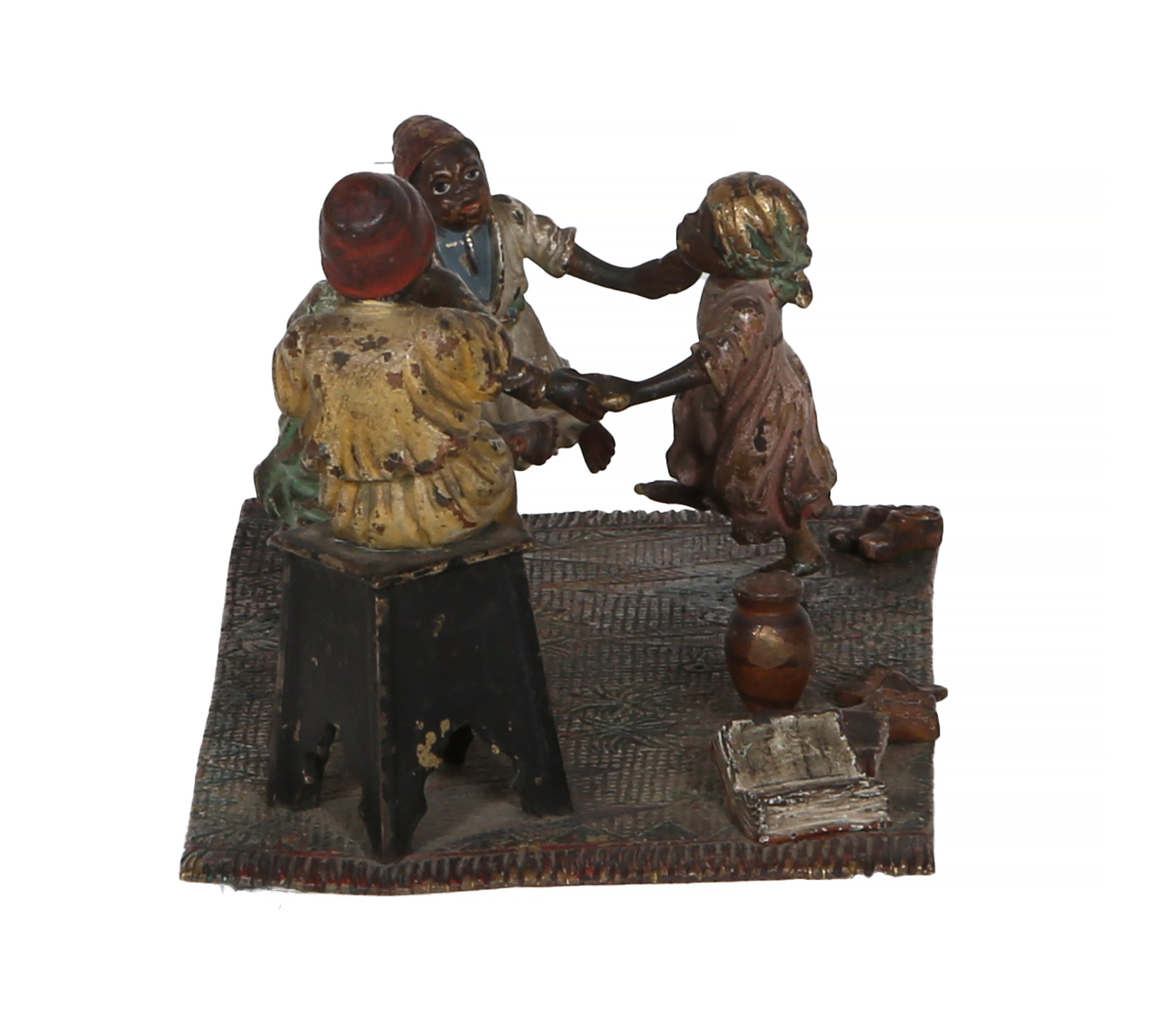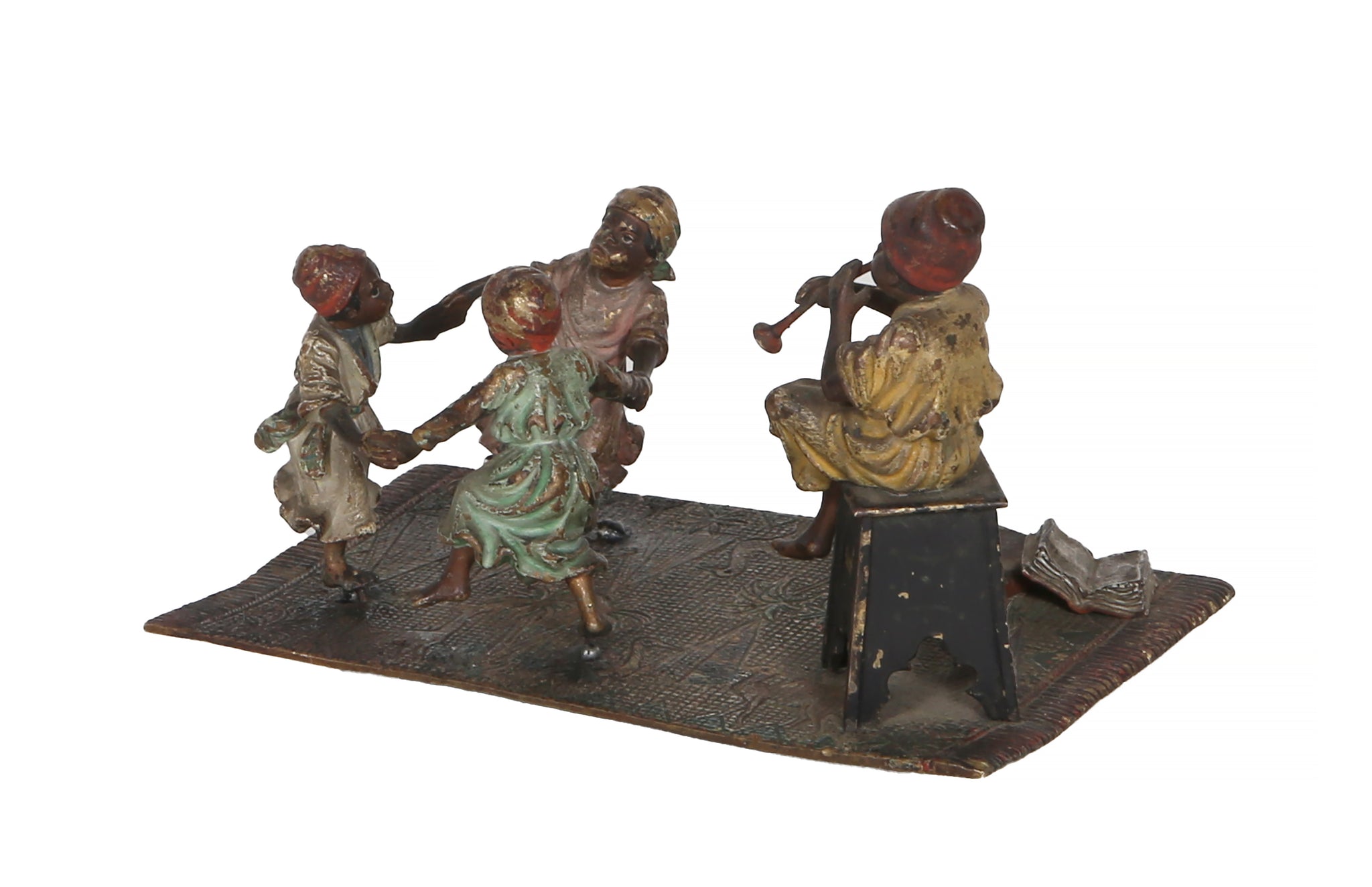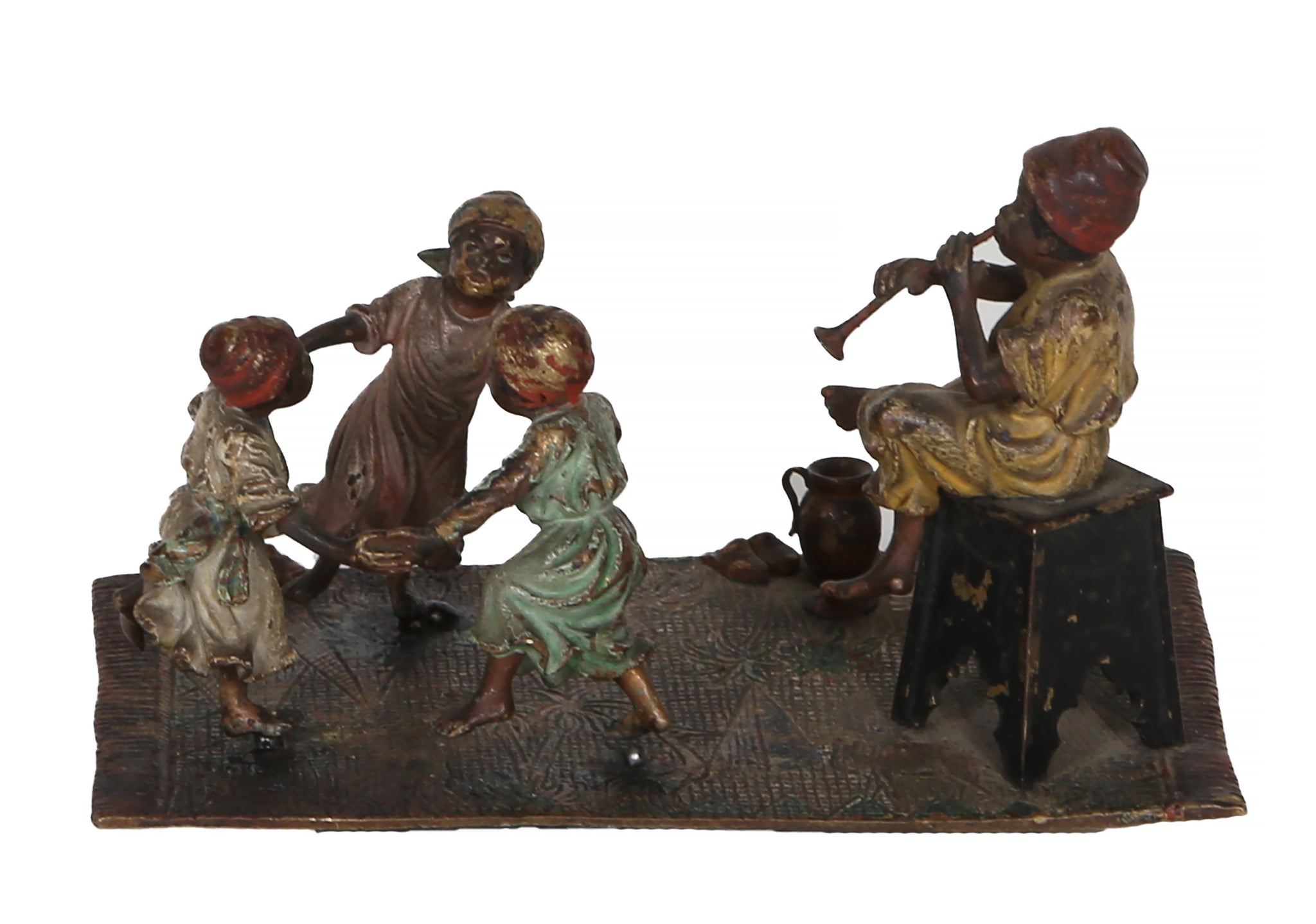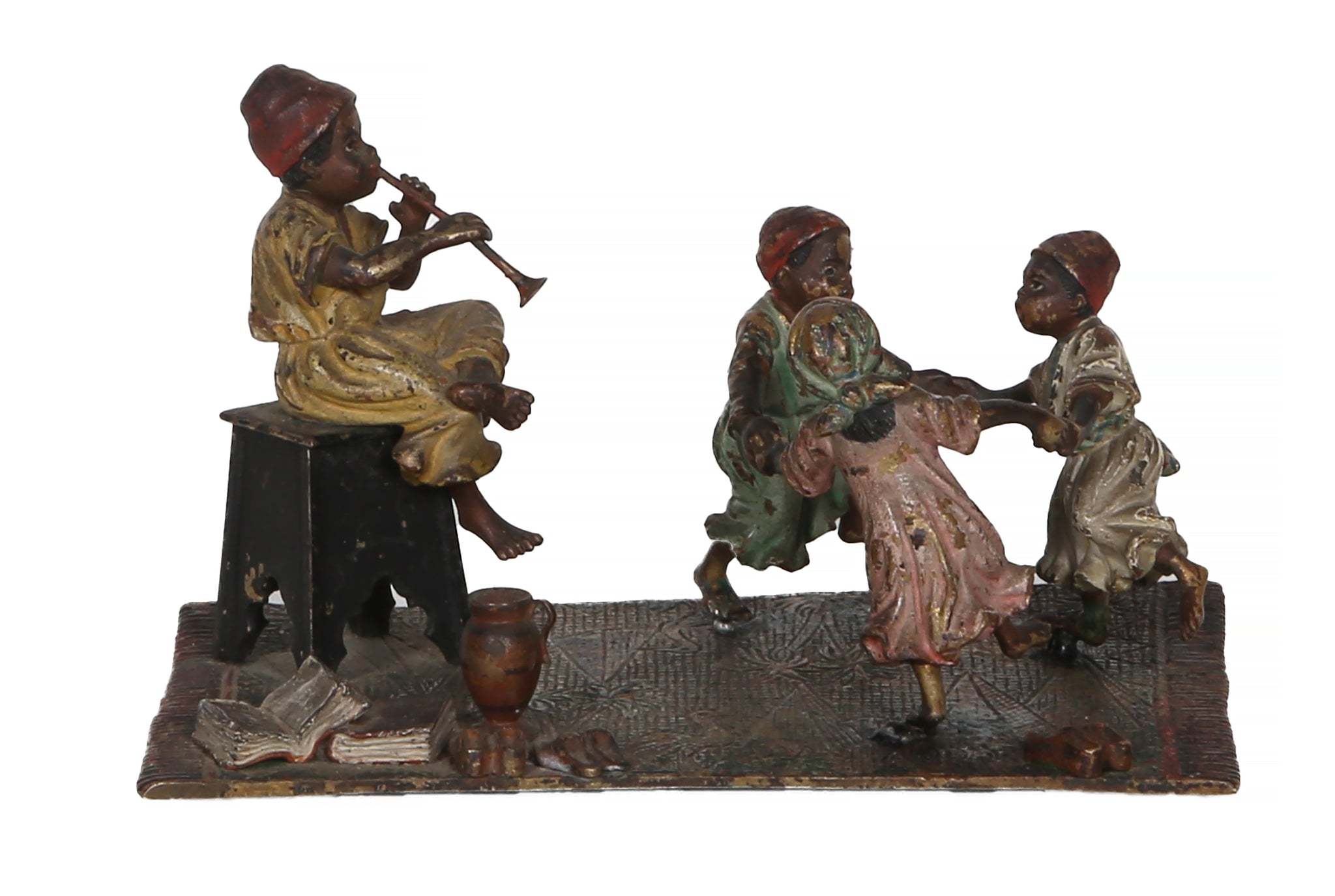 Franz Bergman, Austrian (1861 - 1936) - Piper and Dancers. Year: circa 1900, Medium: Cold painted bronze sculpture, Size: 3.5 x 5 x 3 in. (8.89 x 12.7 x 7.62 cm)