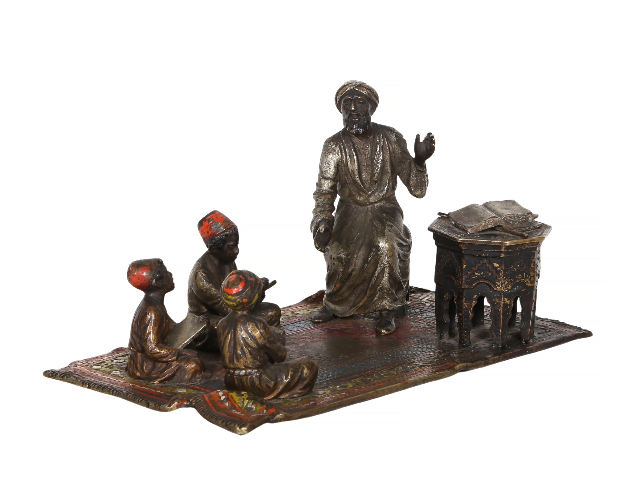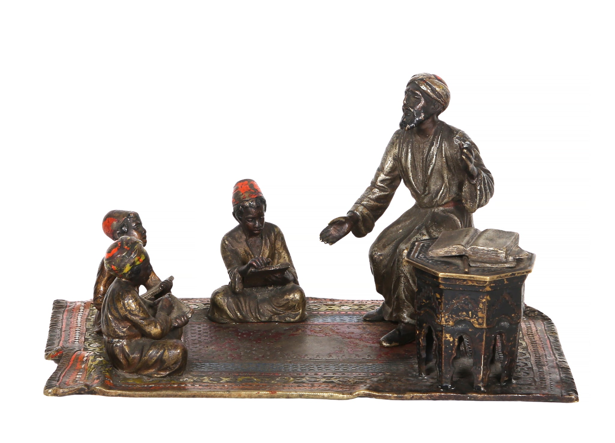 Anton Chotka, Austrian (1881 - 1955) - Quran Teacher With Pupils. Year: circa 1900, Medium: Cold painted Bronze sculpture, stamped Austria, Size: 4.5 x 8 x 5 in. (11.43 x 20.32 x 12.7 cm)