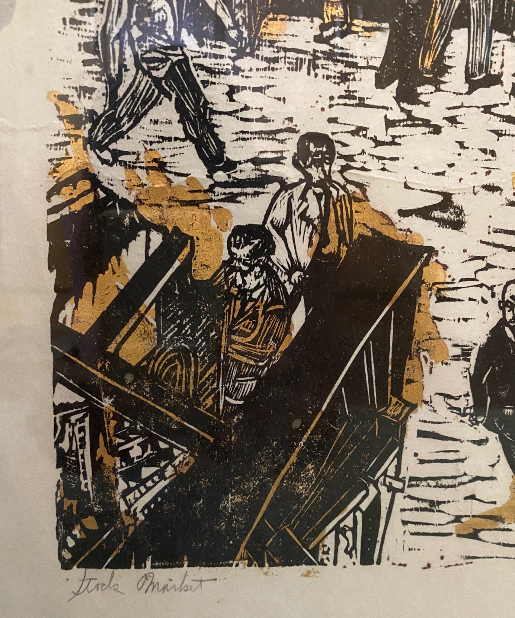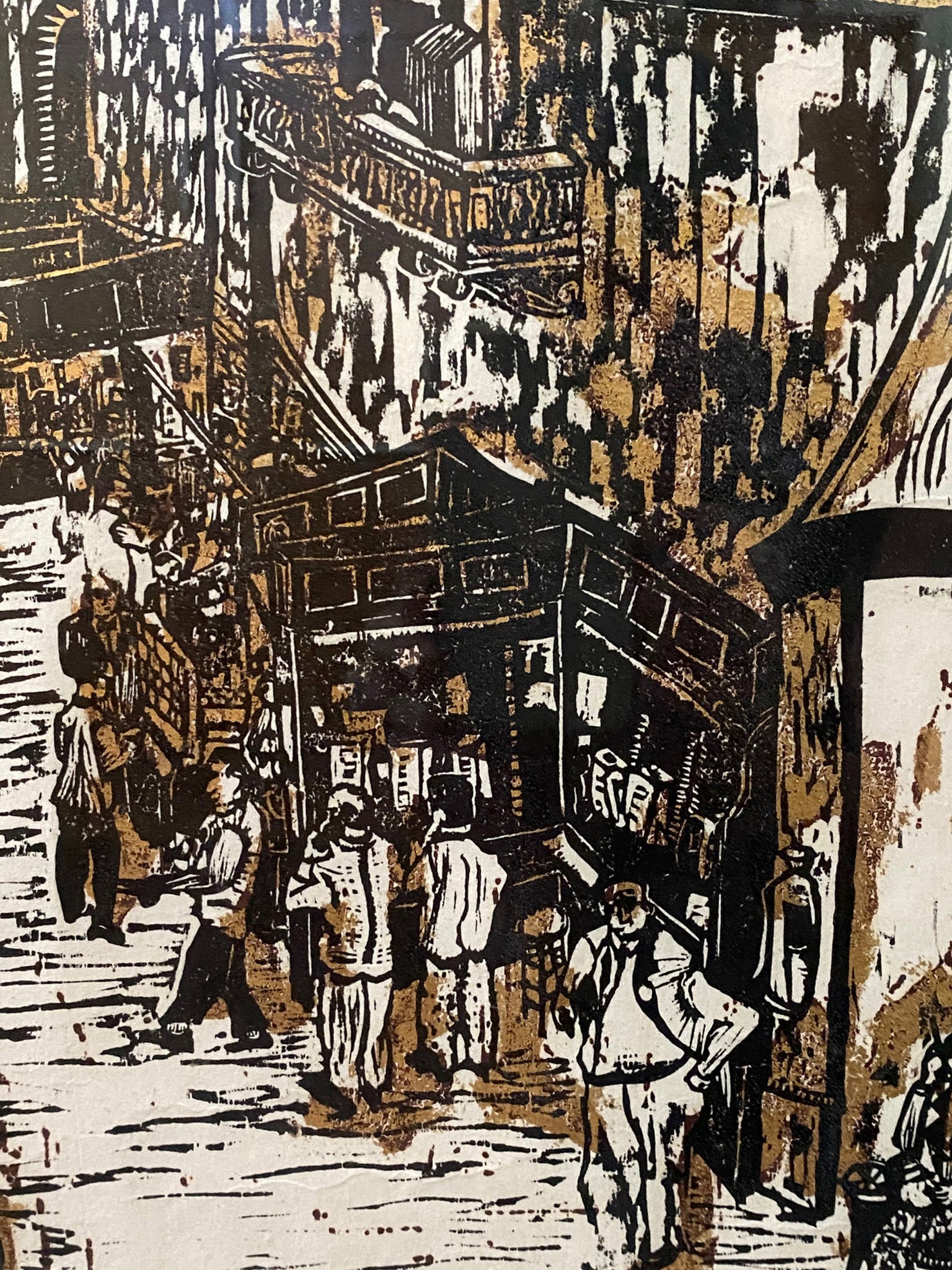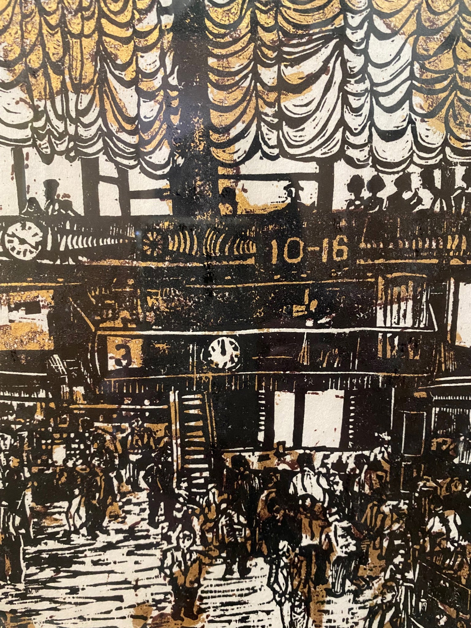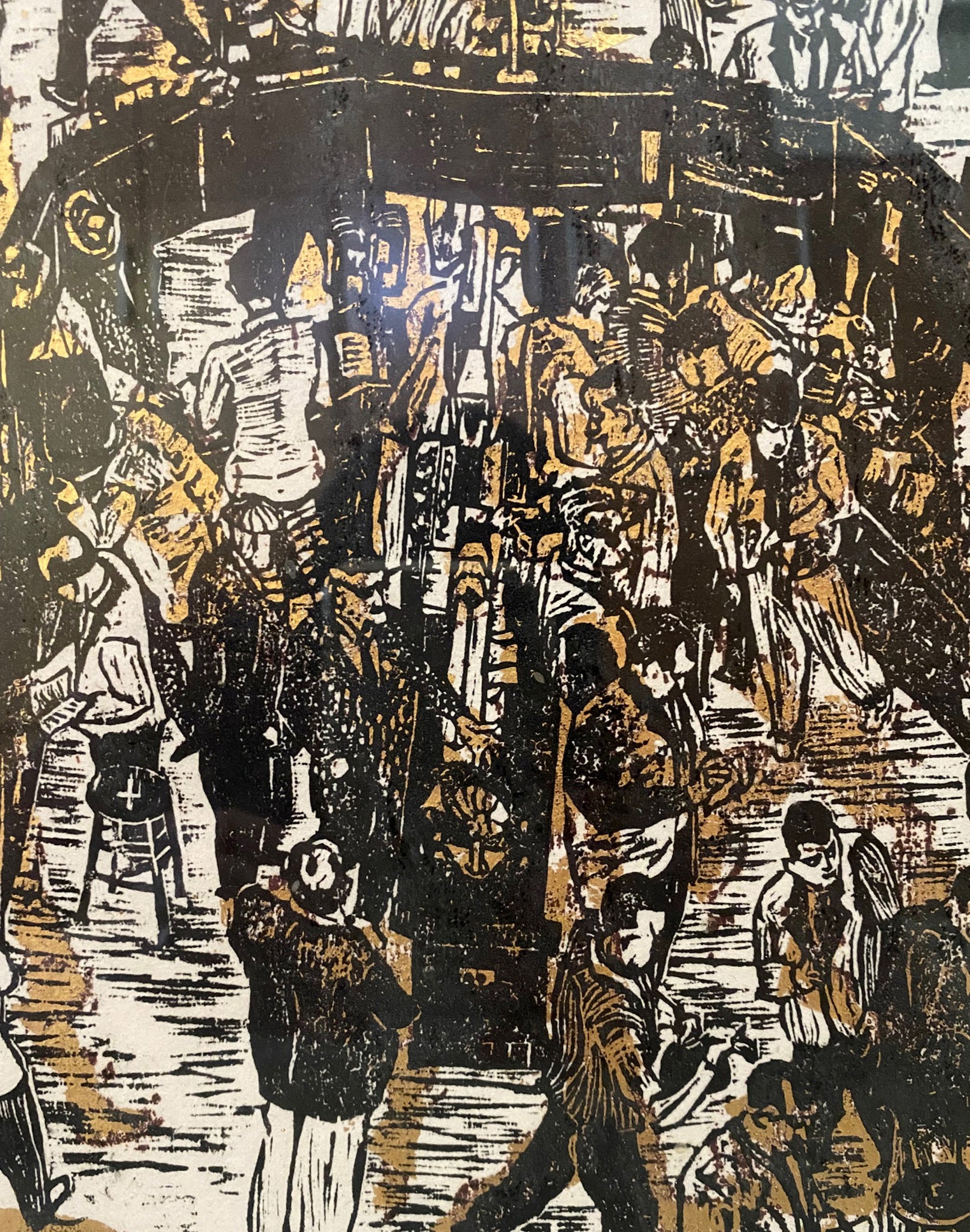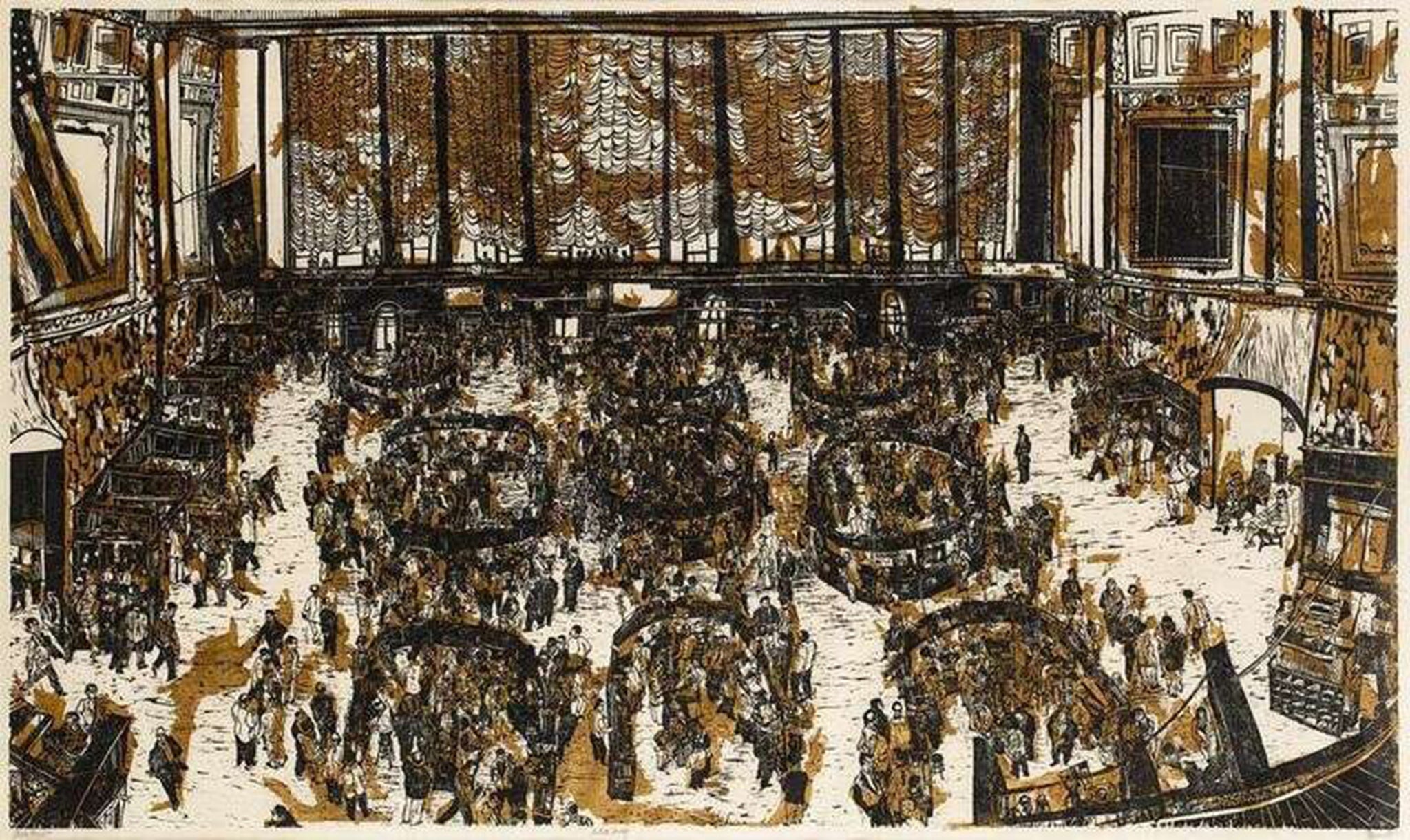 Ted Davies, American (1928 - ) - Stock Market. Year: 1959, Medium: Woodcut, signed and numbered in pencil, Edition: 49/100, Size: 32 x 53.75 in. (81.28 x 136.53 cm)