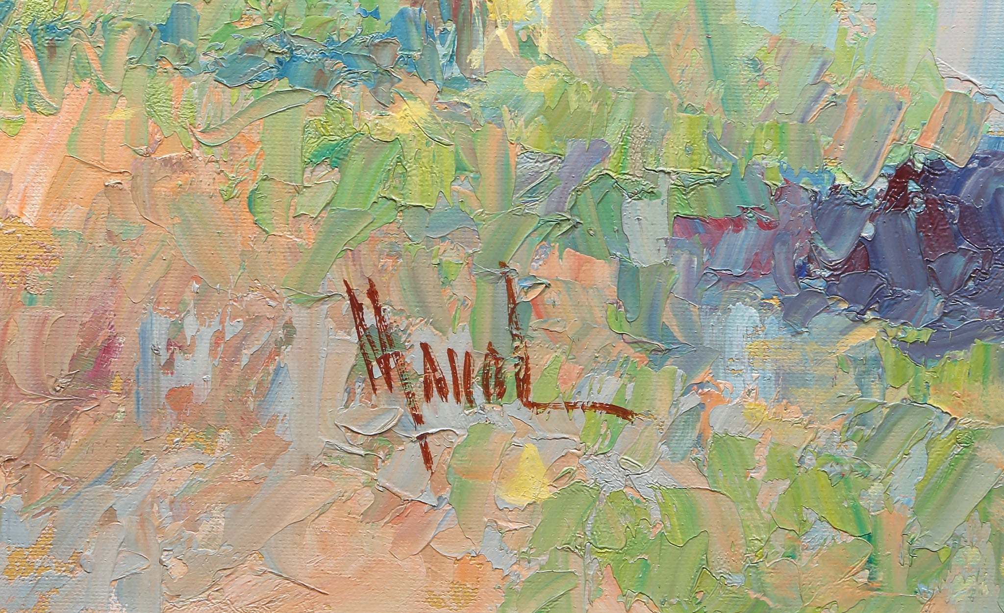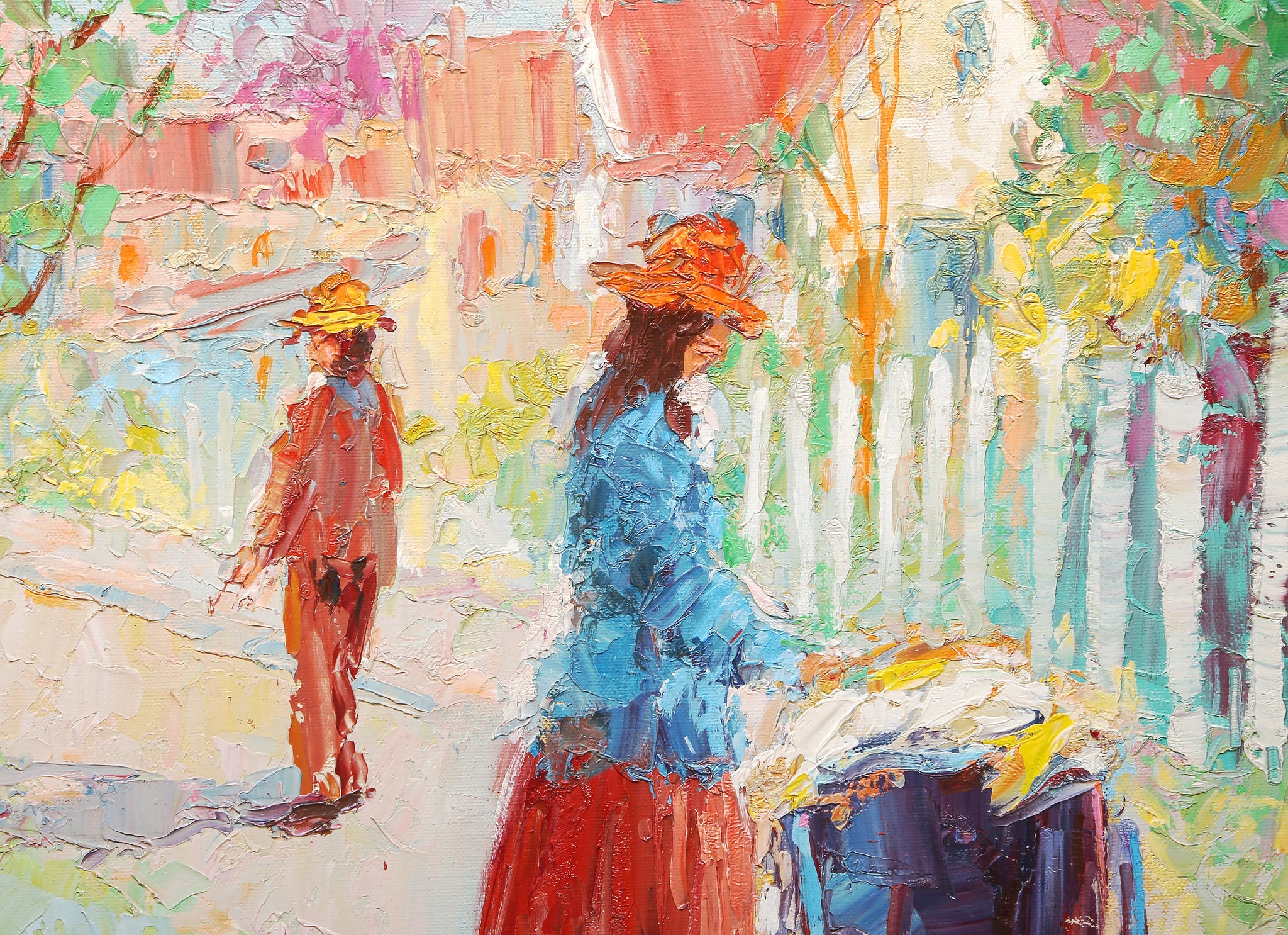 Greek Neo-Impressionist artist John Adamos Manol likely painted this oil on canvas piece sometime around 1970, despite the use of more vintage clothing styles. The piece is nicely framed and is signed by the artist in the lower left. Provenance: Galerie Felix Vercel, New York.