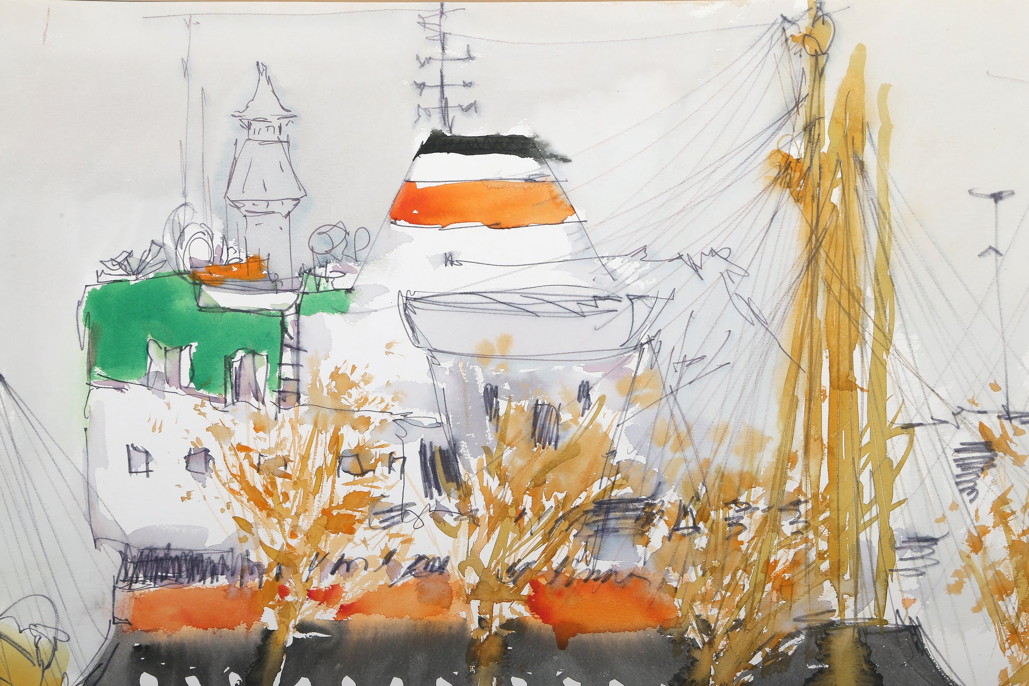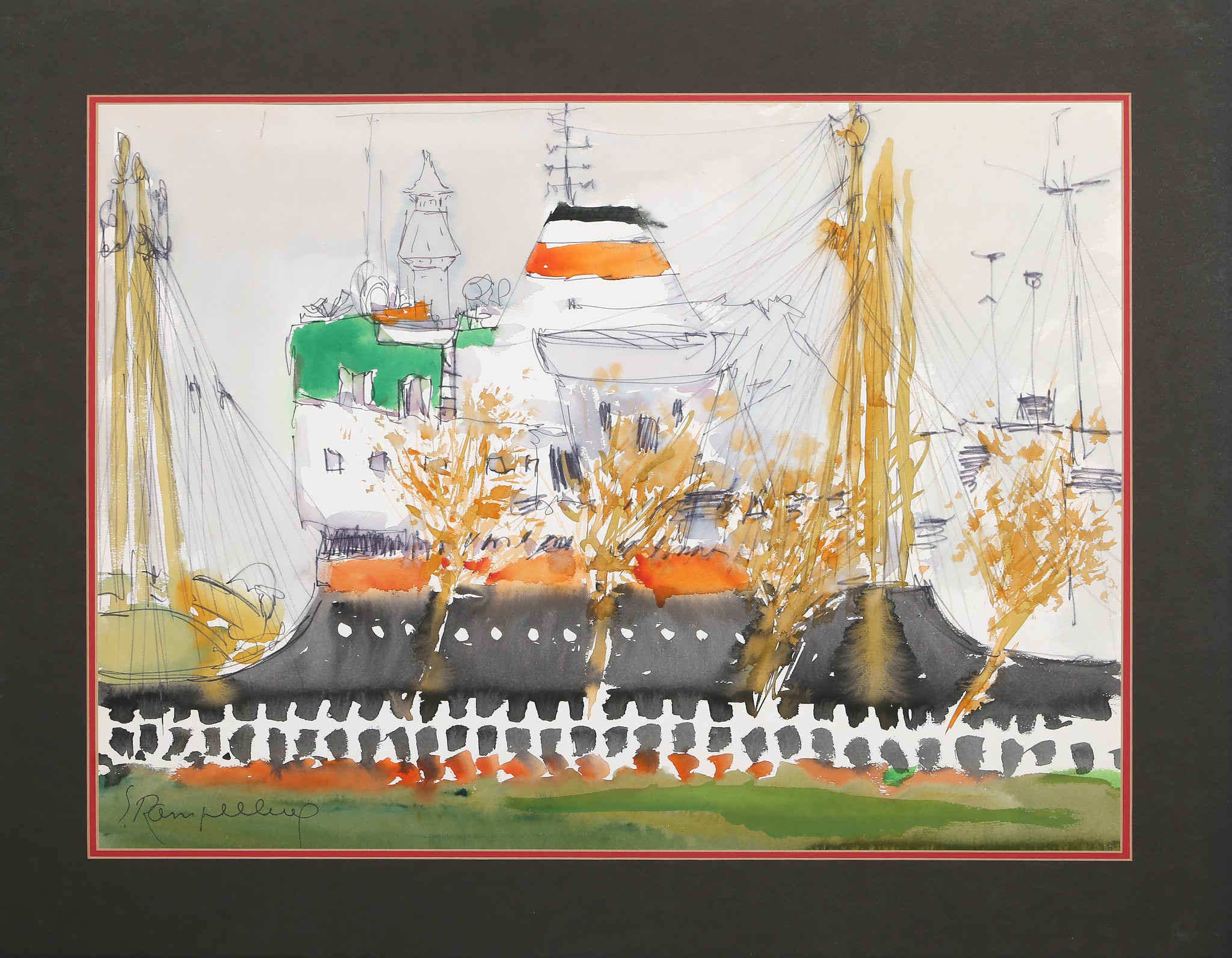 Emile Rampelberg, French (1911 - 2001) - Wharf. Medium: Watercolor on Paper, signed lower left, Image Size: 20 x 27.5, Size: 26 x 33.5 in. (66.04 x 85.09 cm), Provenance: Galerie Felix Vercel, New York.