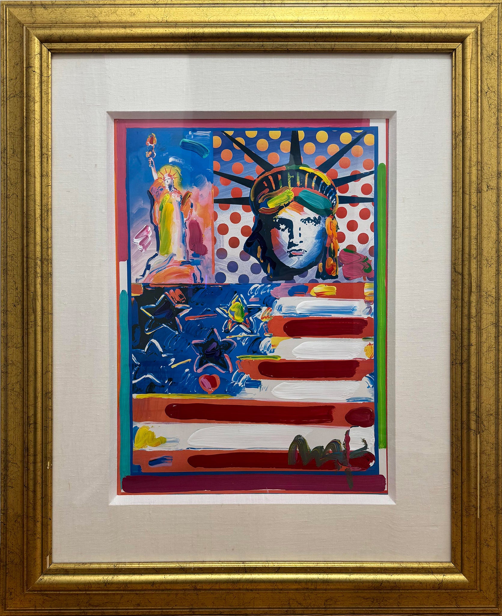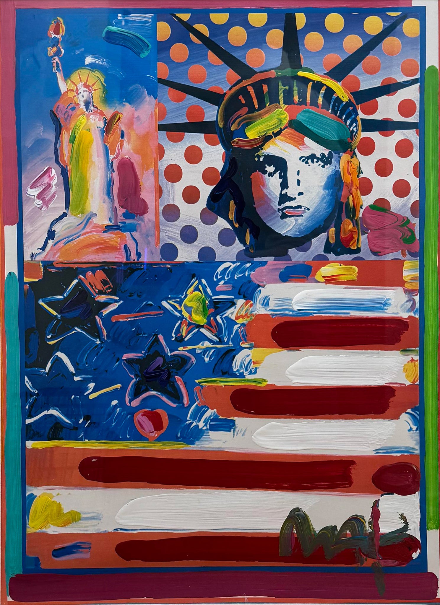 Peter Max, German/American (1937 - ) - God Bless America. Year: 2001, Medium: Mixed Media, signed, Size: 24 x 18 in. (60.96 x 45.72 cm), Frame Size: 38 x 31 inches
