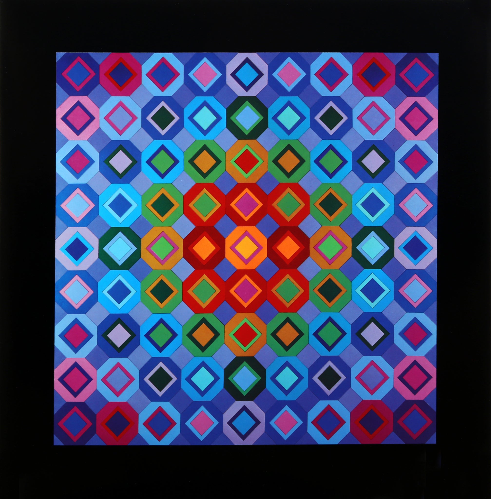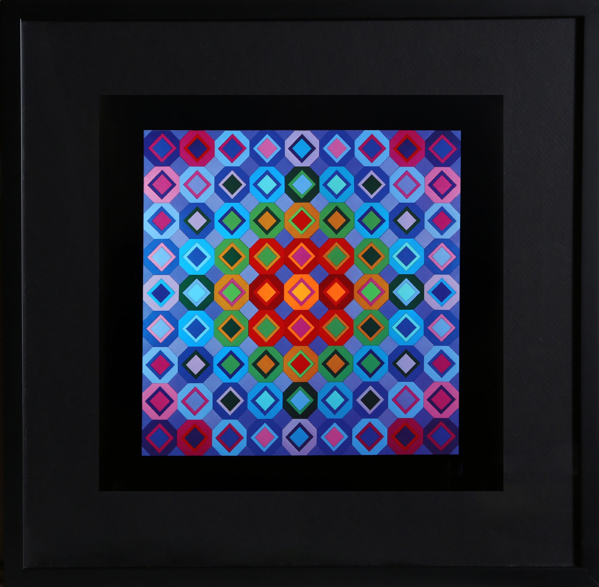 Victor Vasarely, Hungarian (1908 - 1997) - Folkokta. Portfolio: Structures Universelles de L'octogone, Year: 1975, Medium: Offset Lithograph on paper, Size: 10.75 x 10.75 in. (27.31 x 27.31 cm), Frame Size: 14 x 14 inches, Publisher: Editions Du Griffon Neuchatel, Description: A print from a portfolio of 8 Offset Lithopgraphs on paper created originally by Hungarian artist Victor Vasarely, printed by Editions Du Griffon Neuchatel. Nicely framed and matted in black.