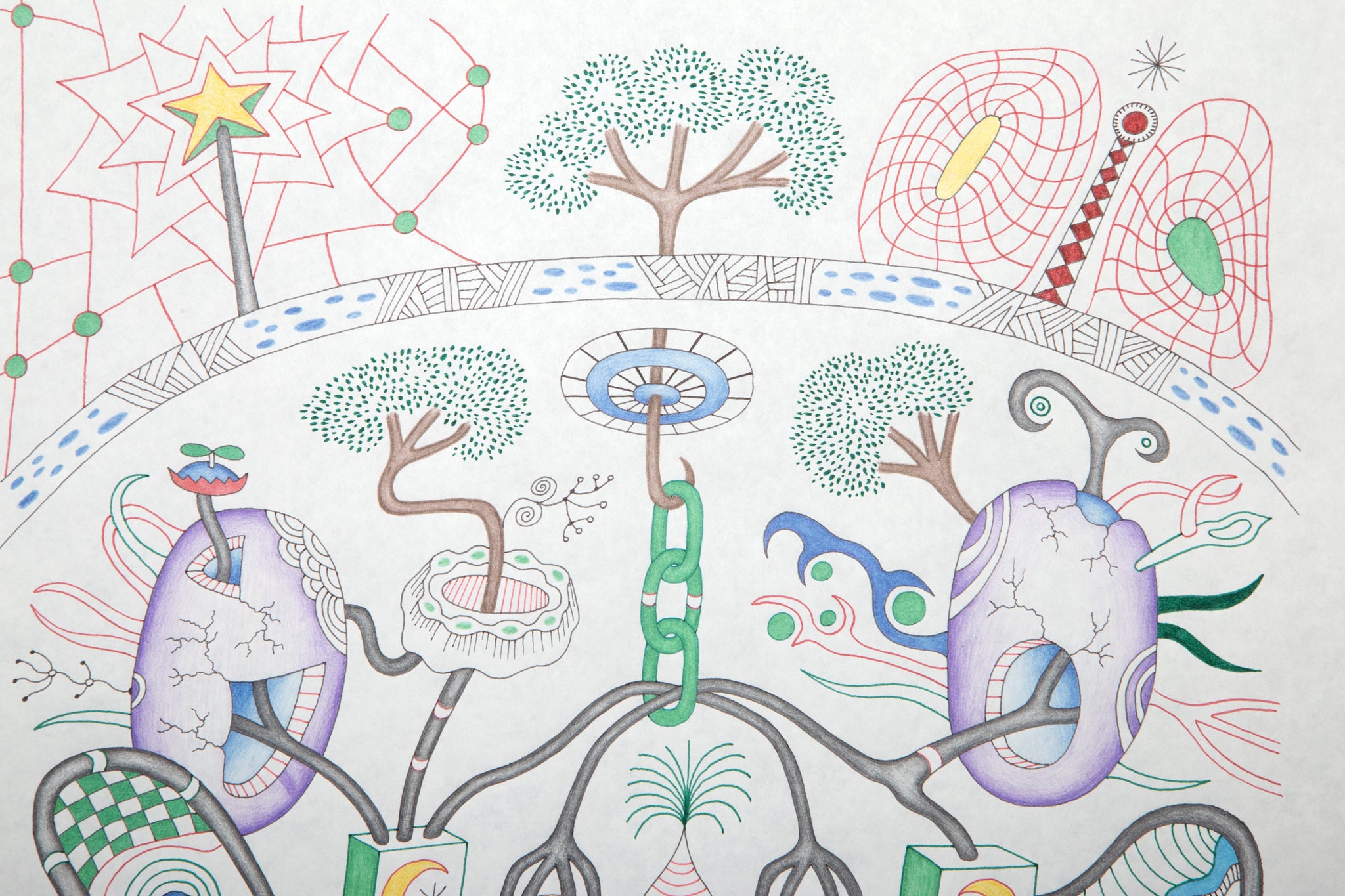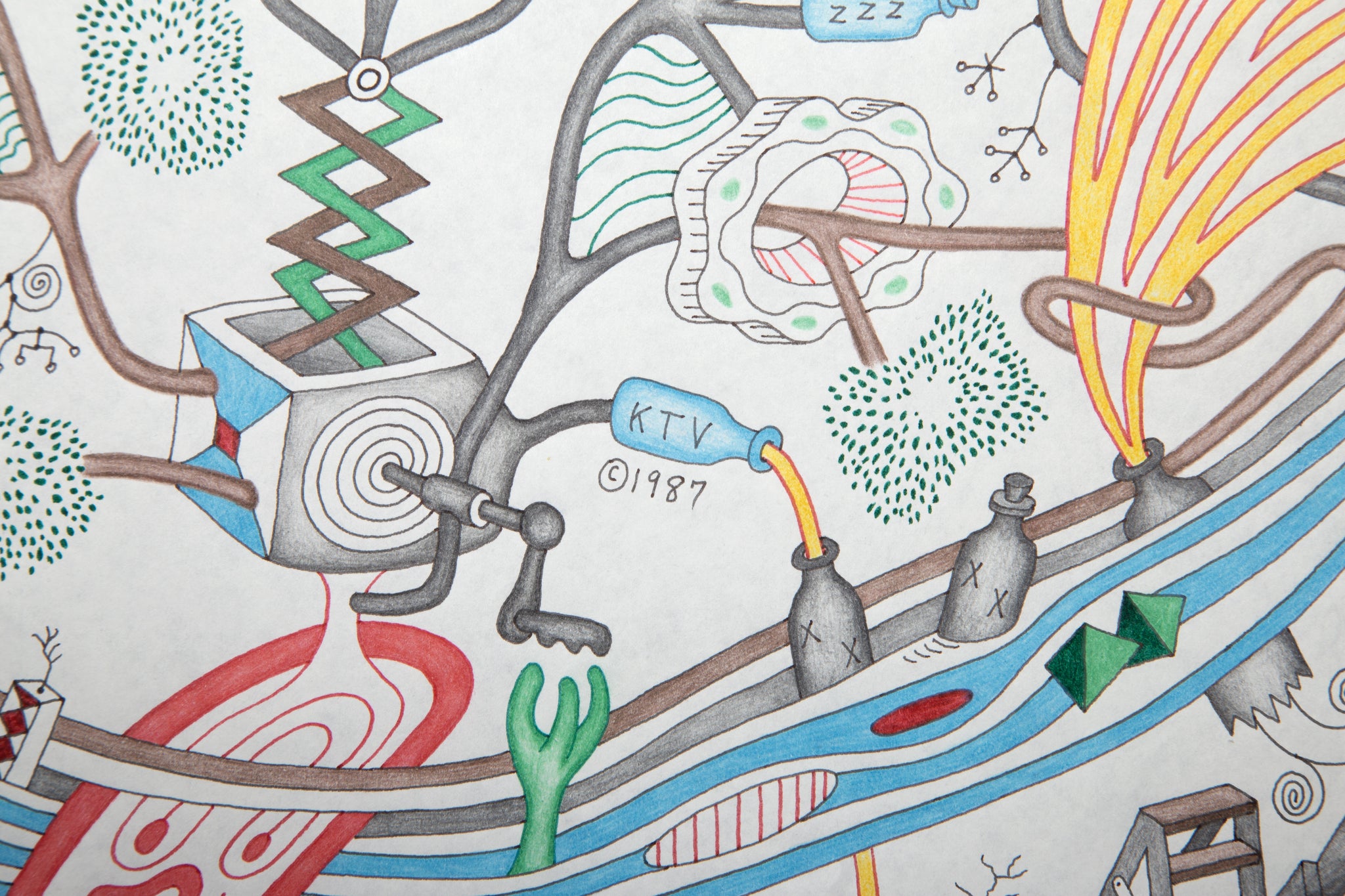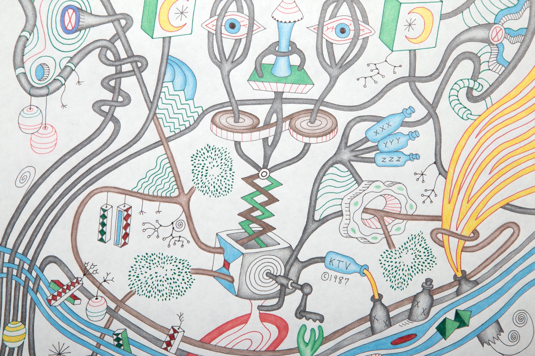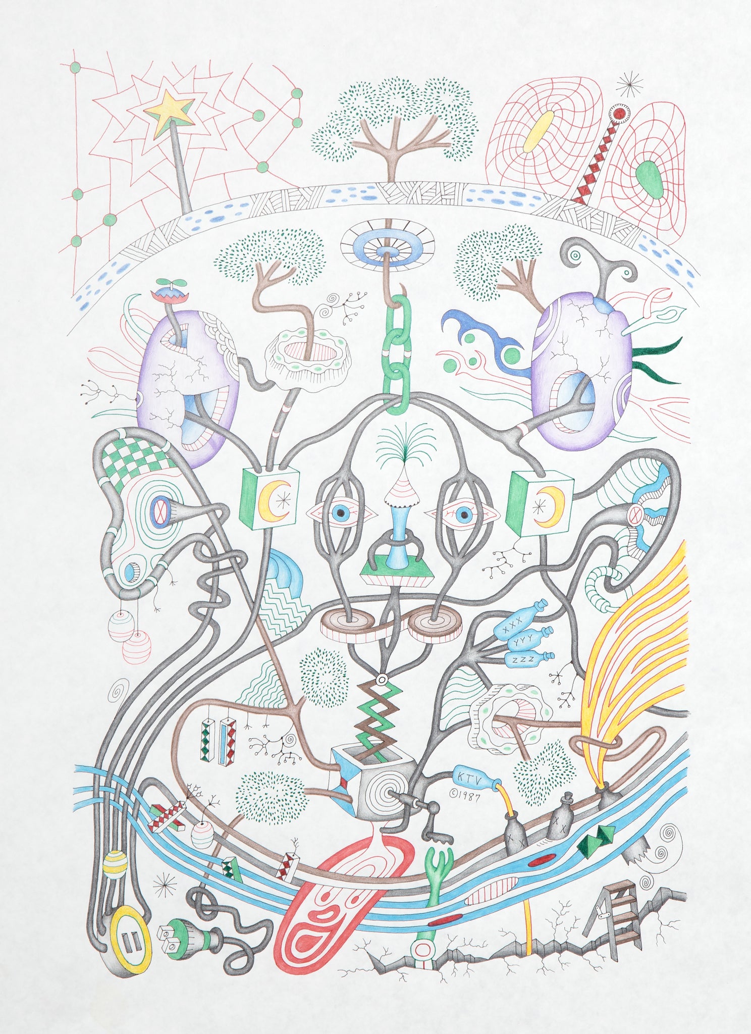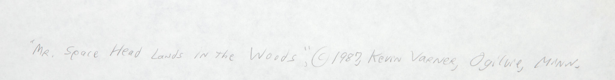 Artist: Kevin Varner, American (1954 - 2019) - Mr. Space Head Lands in The Woods. Year: 1987, Medium: Color Pencil and Ink on Paper, signed and dated, titled on verso, Size: 22.25 x 18 in. (56.52 x 45.72 cm)