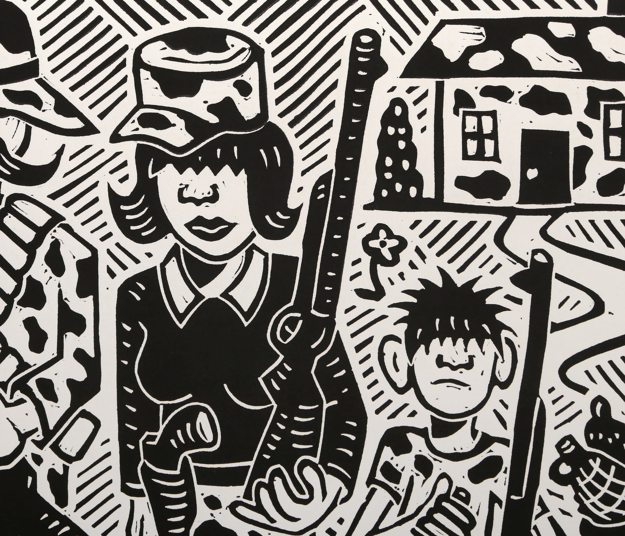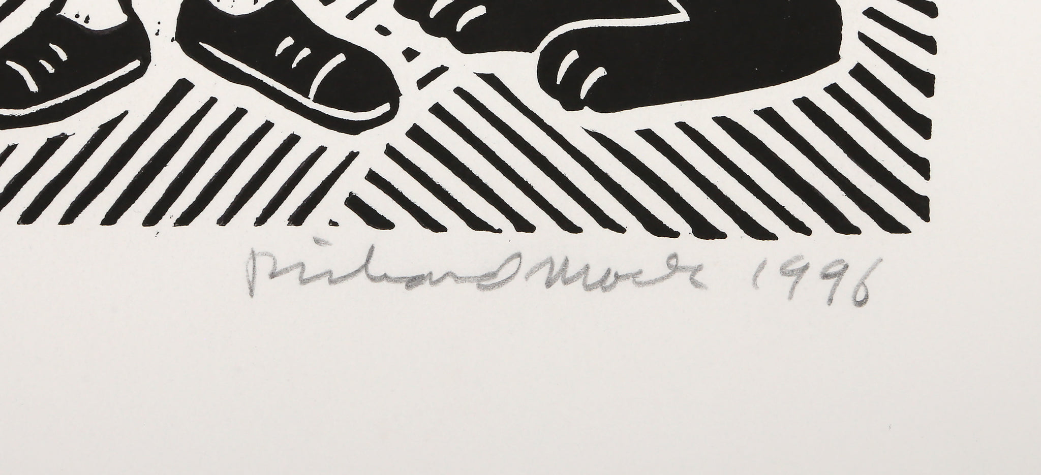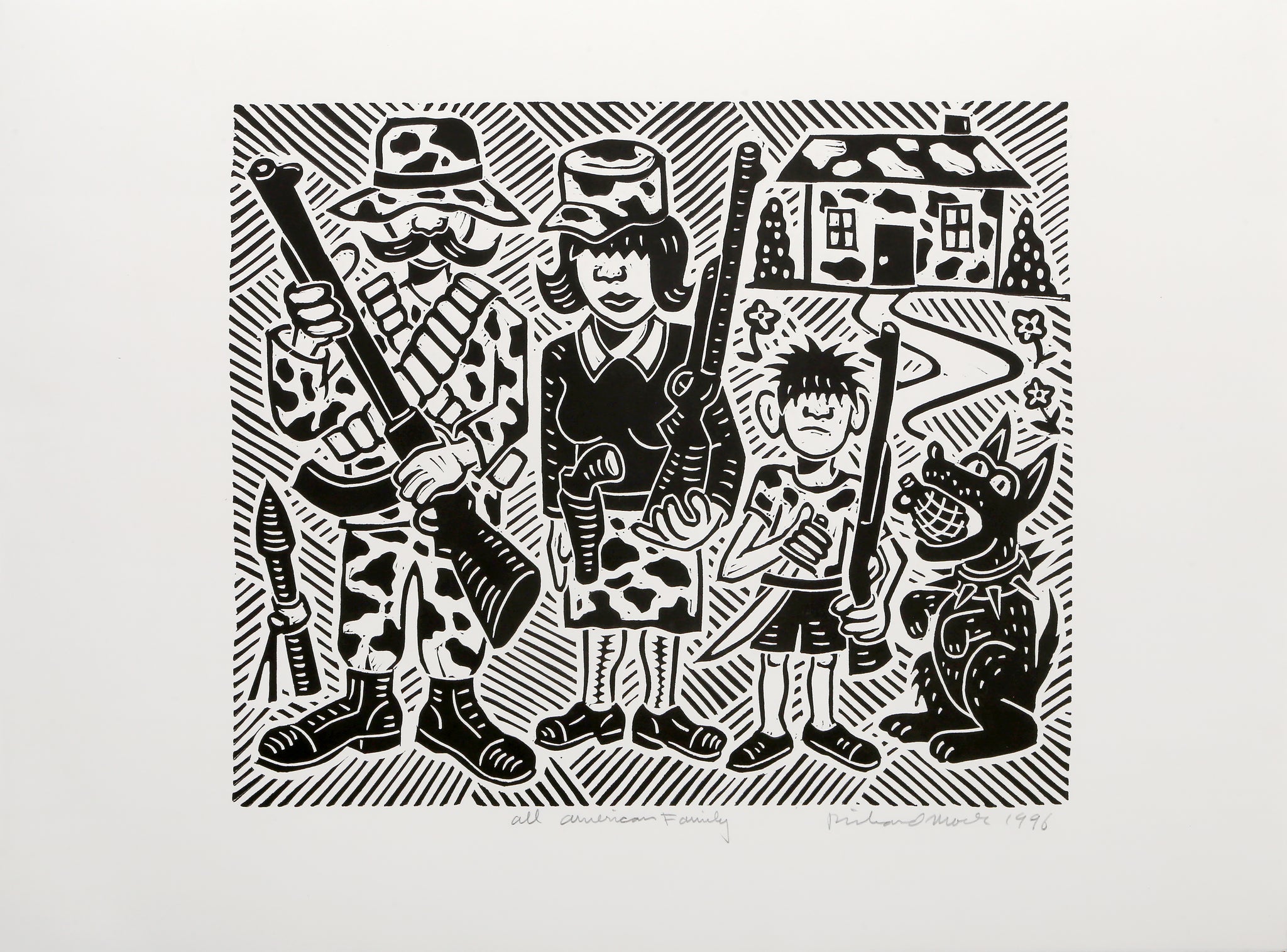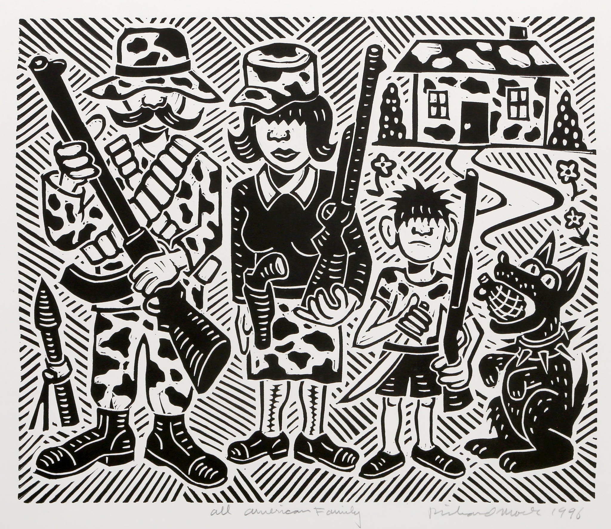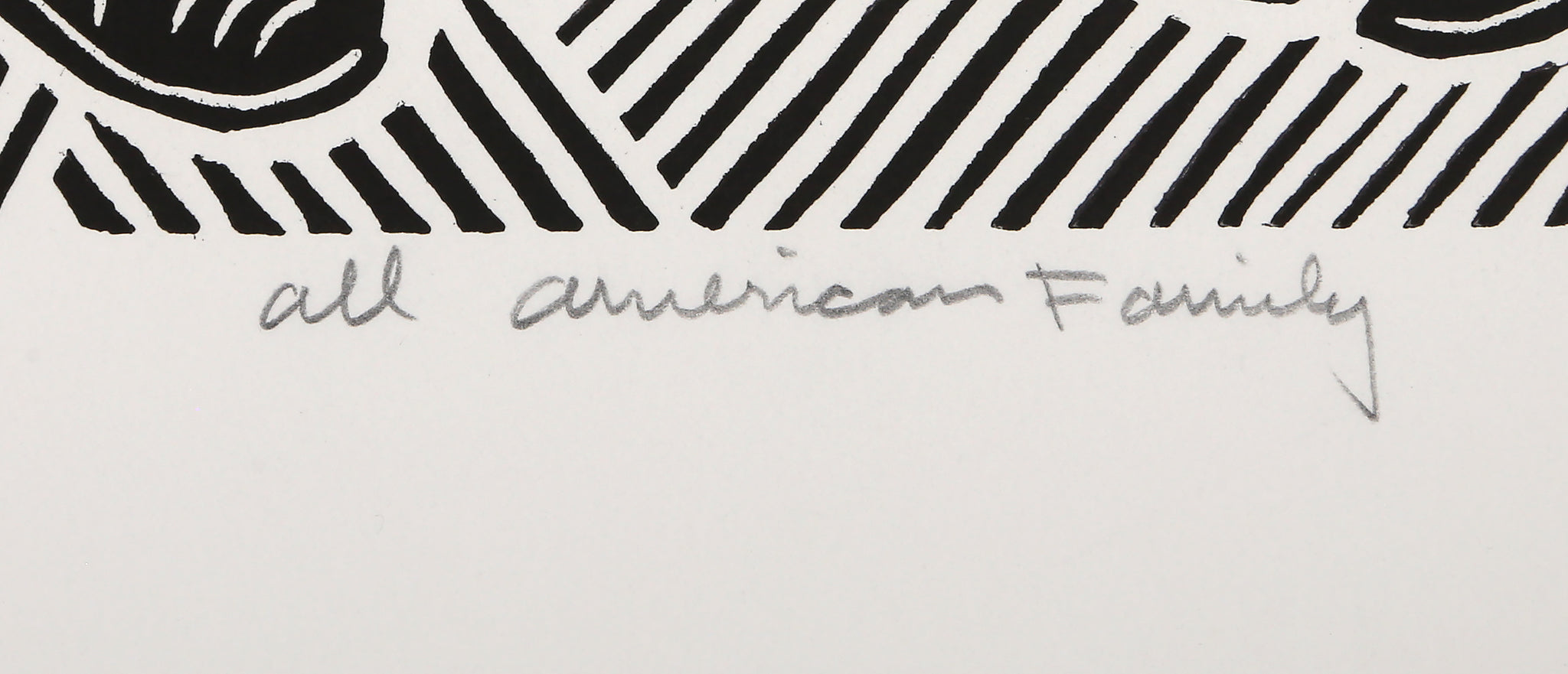 Richard Mock, American (1944 - 2006) - All American Family. Year: 1996, Medium: Linocut on BFK Rives, signed, titled, numbered and dated in pencil, Edition: 80, Image Size: 16 x 19 inches, Size: 22.5 x 30 in. (57.15 x 76.2 cm)