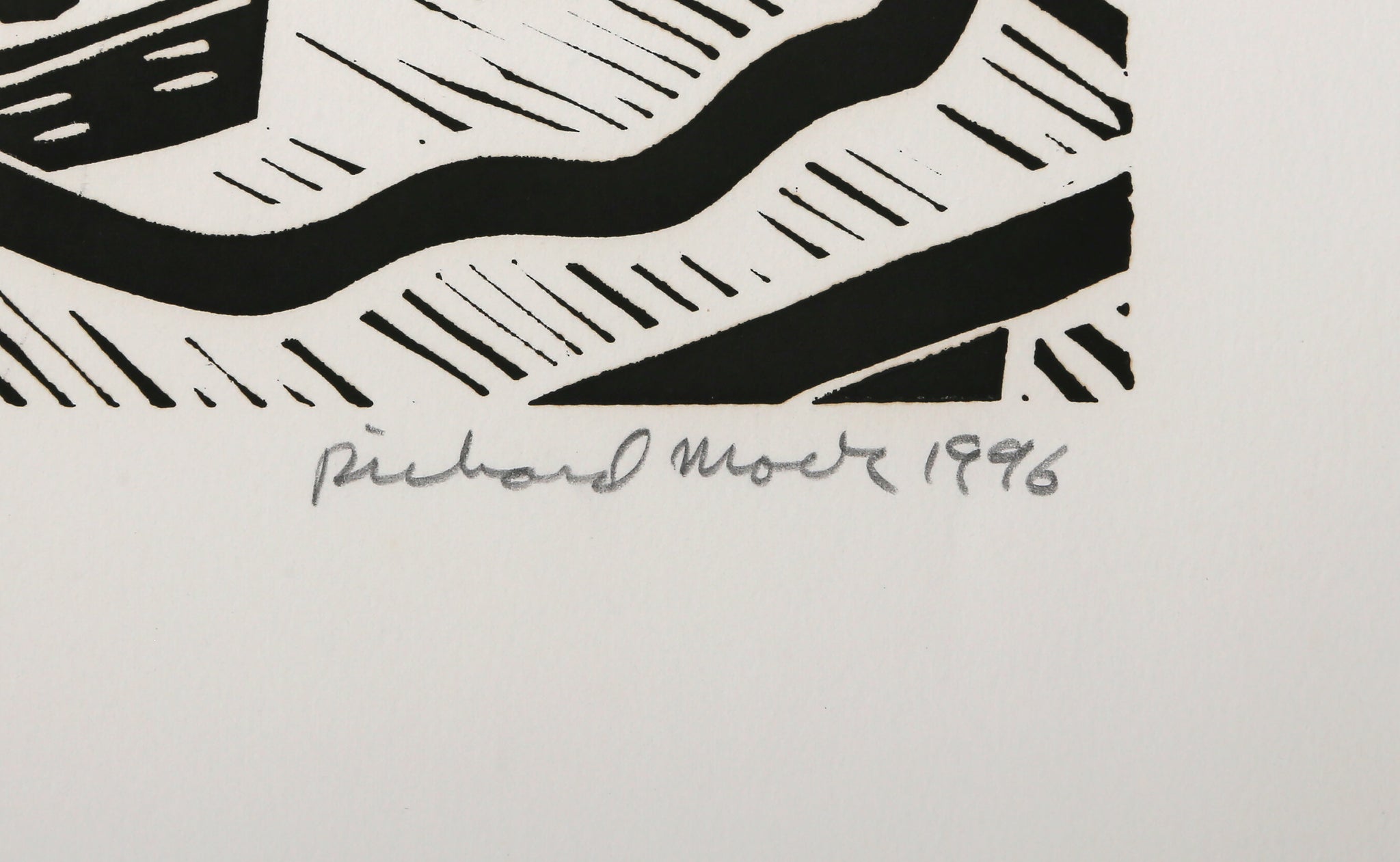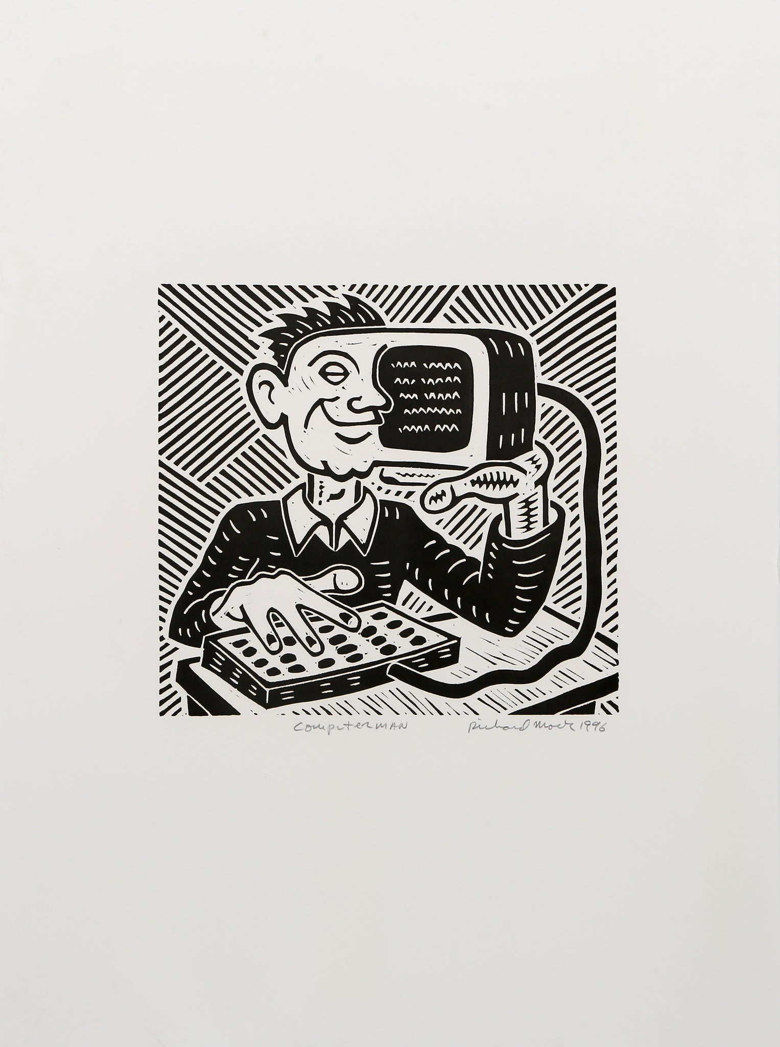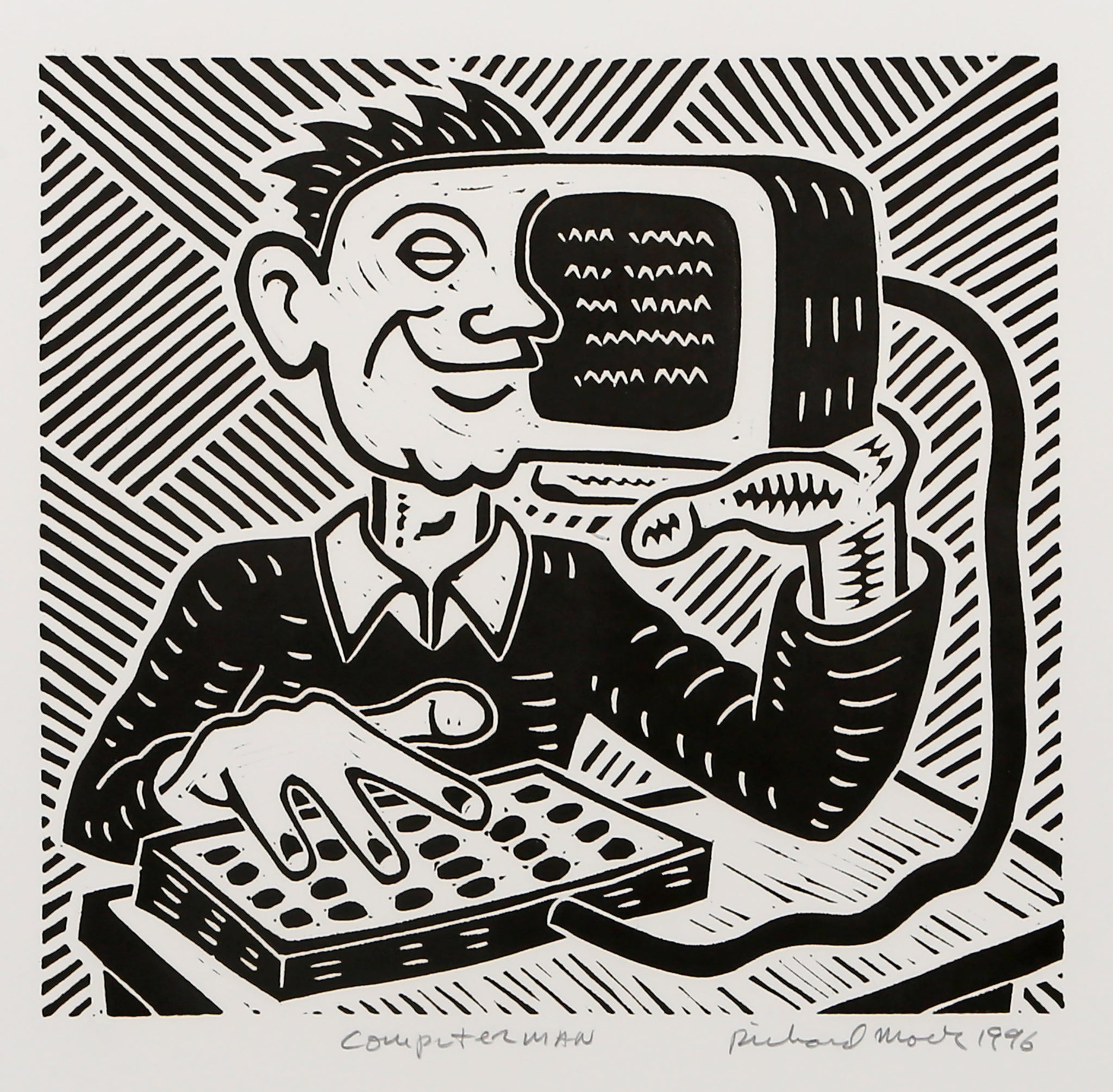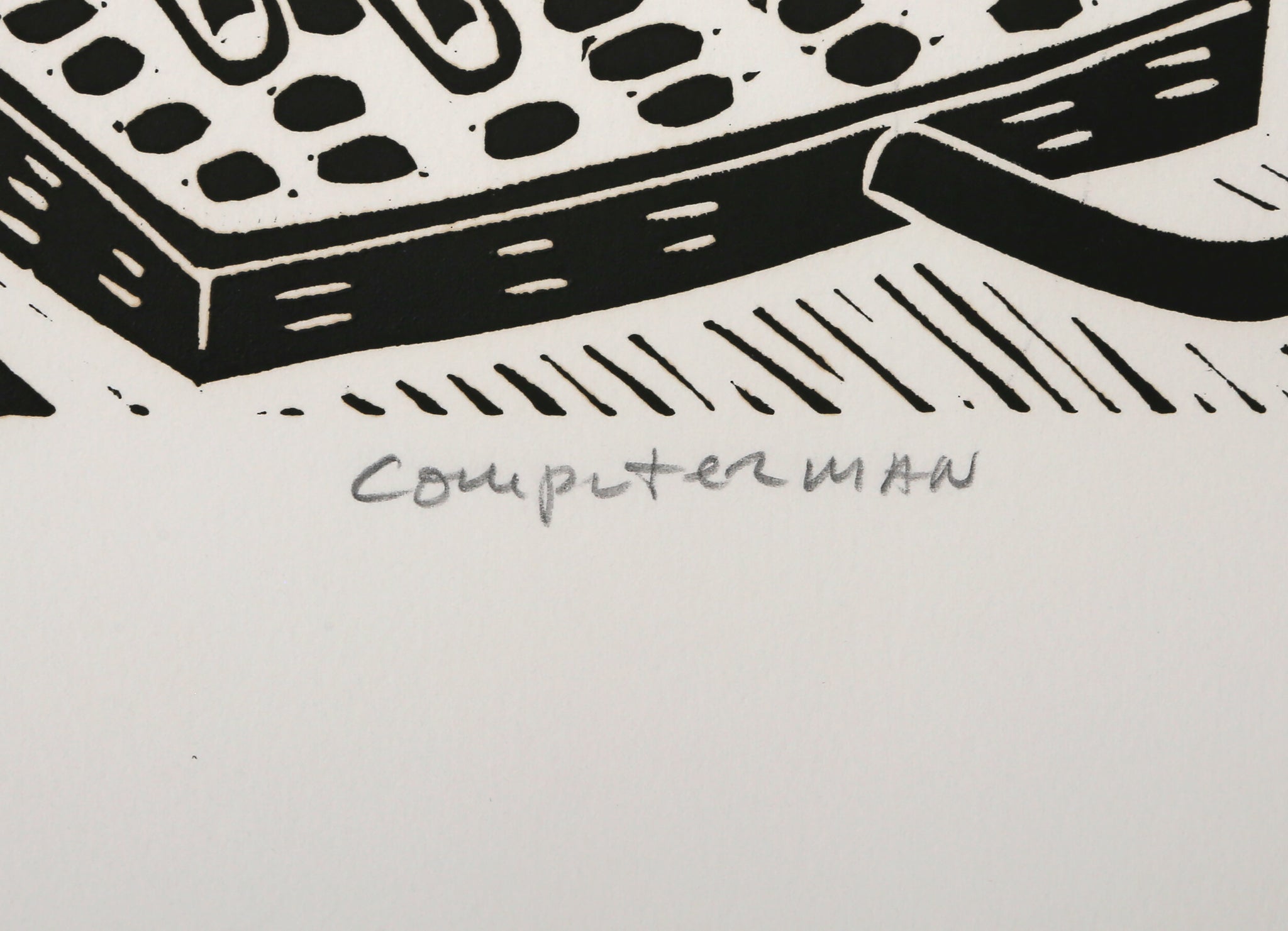 Richard Mock, American (1944 - 2006) - Computer Man. Year: 1996, Medium: Linocut on BFK Rives, signed, titled, numbered and dated in pencil, Edition: 80, Image Size: 12 x 13 inches, Size: 30 x 22.25 in. (76.2 x 56.52 cm)