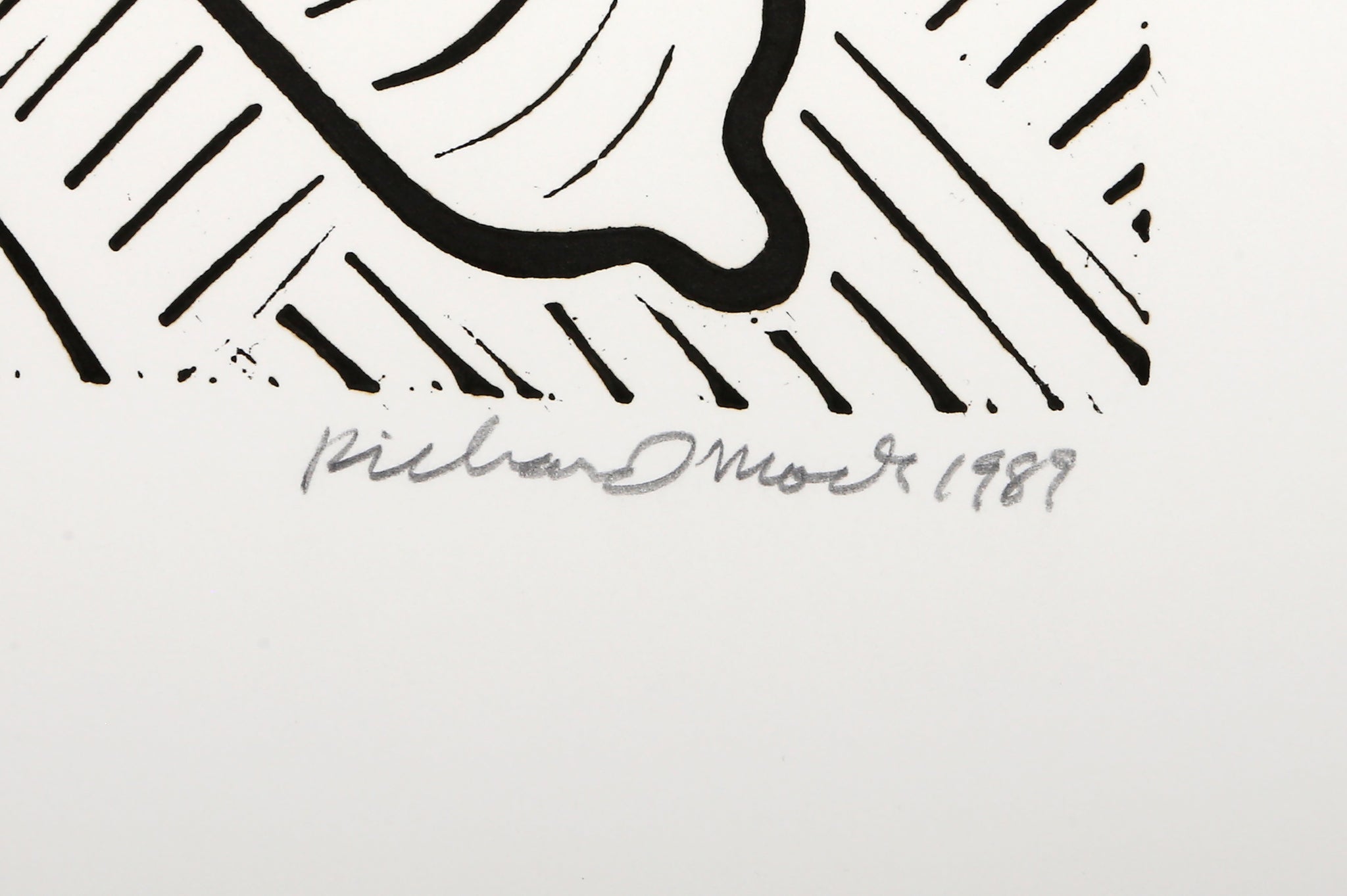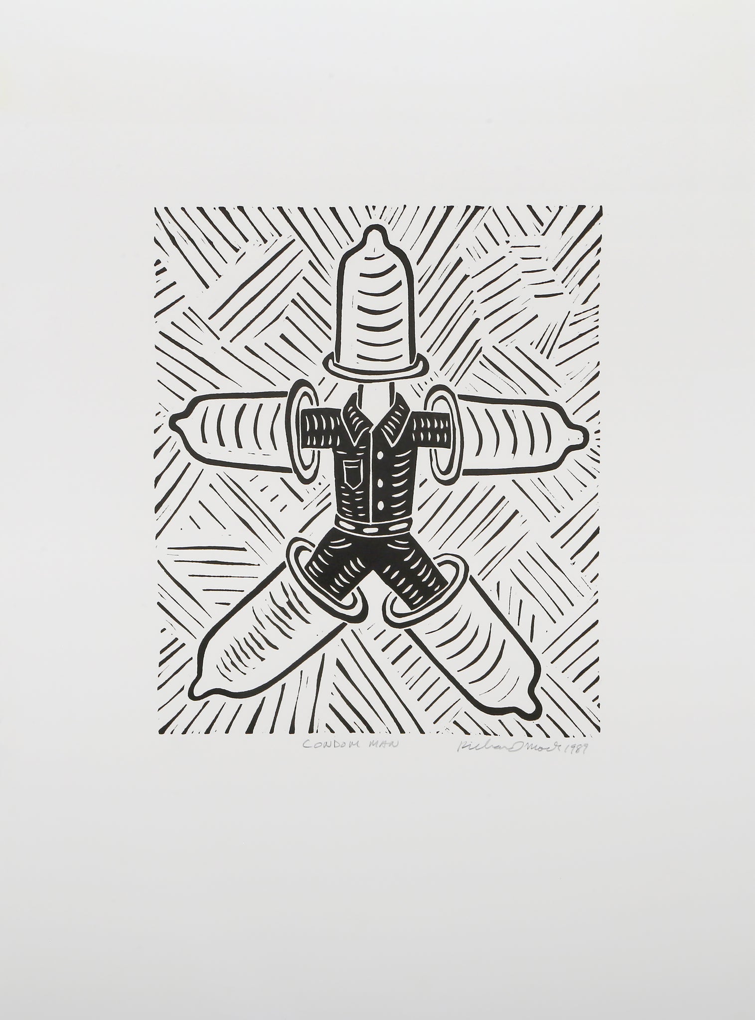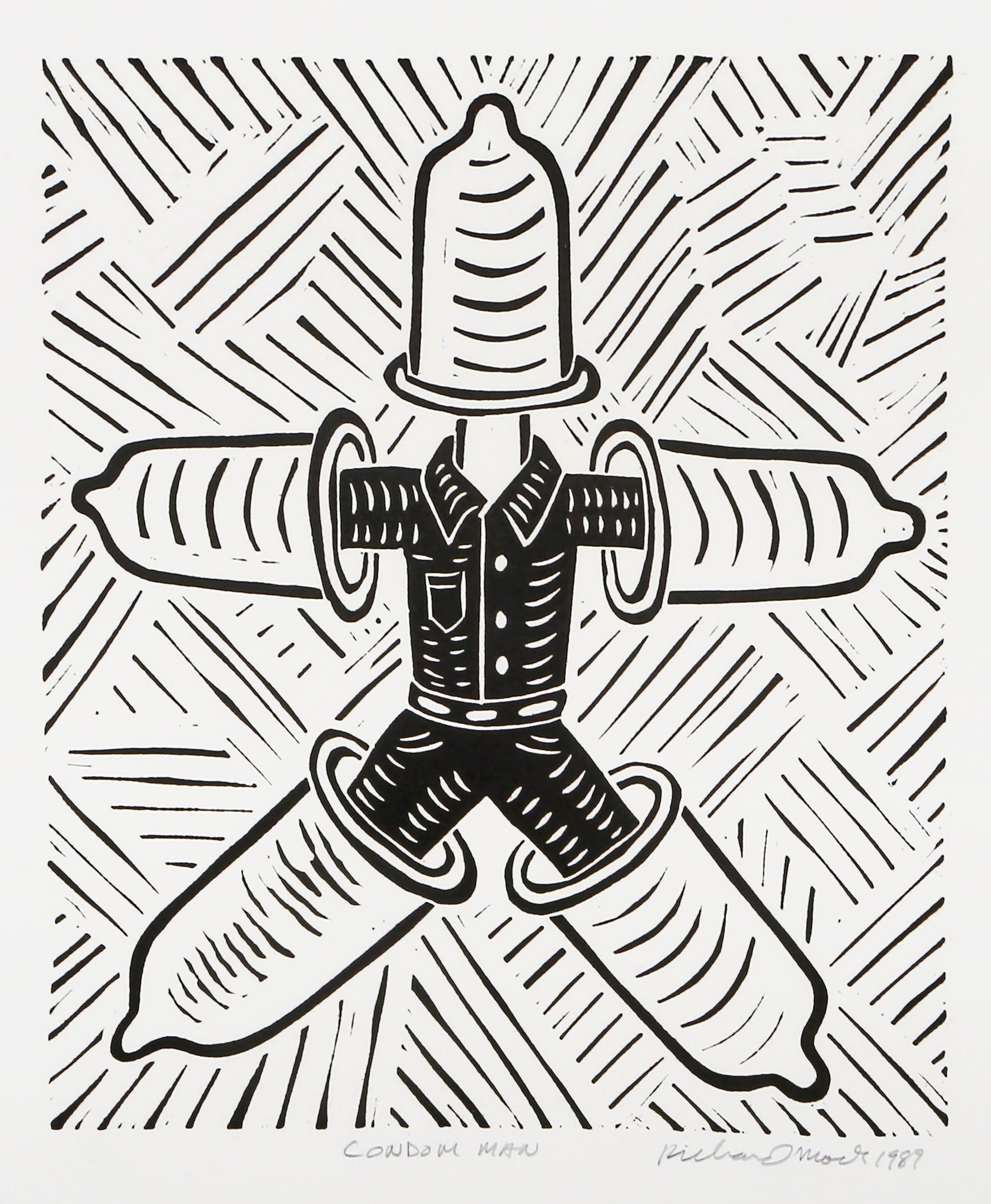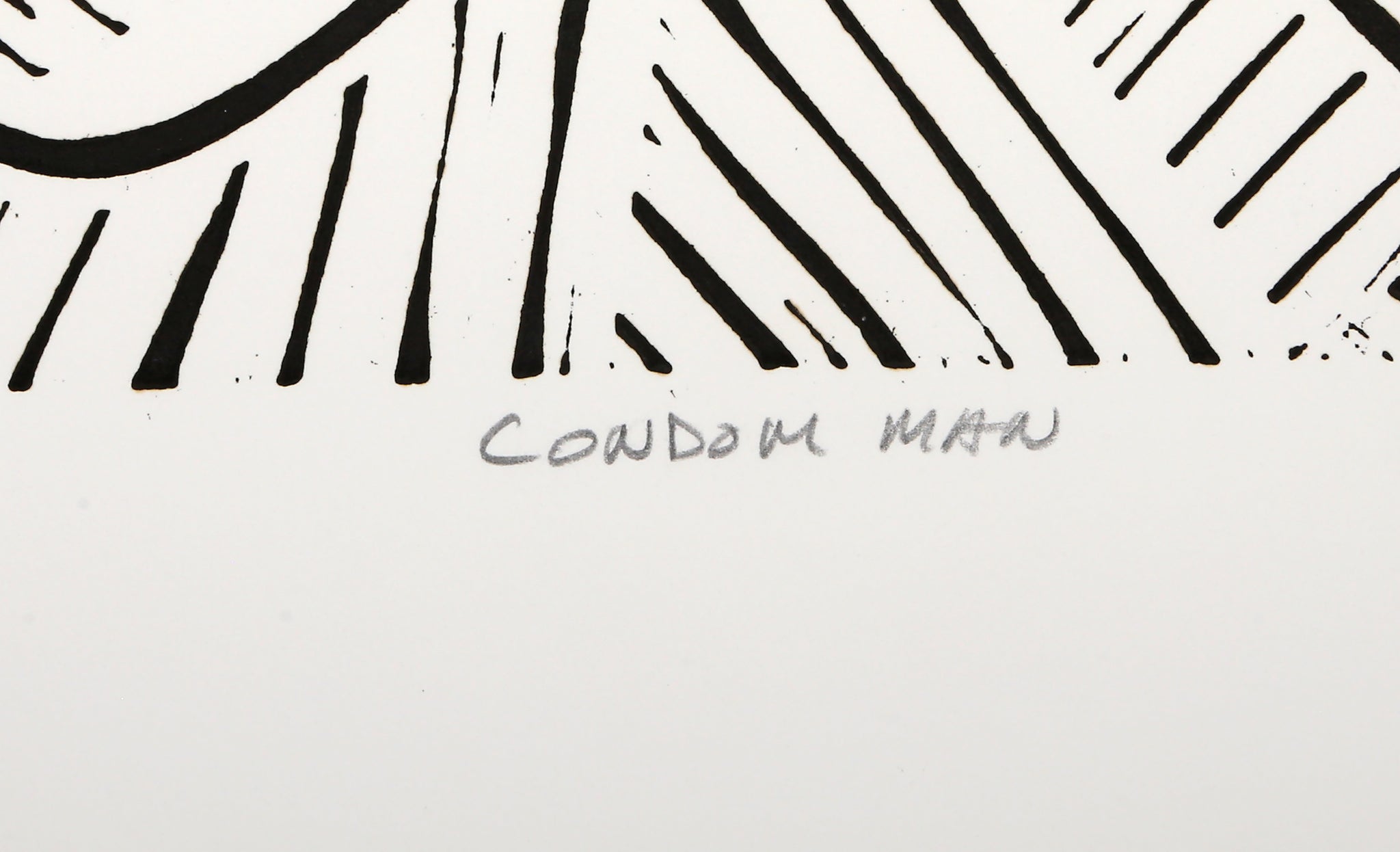 Richard Mock, American (1944 - 2006) - Condom Man. Year: 1989, Medium: Linocut on BFK Rives, signed, titled, numbered and dated in pencil, Edition: 80, Image Size: 15.25 x 12.75 inches, Size: 30 x 22 in. (76.2 x 55.88 cm)