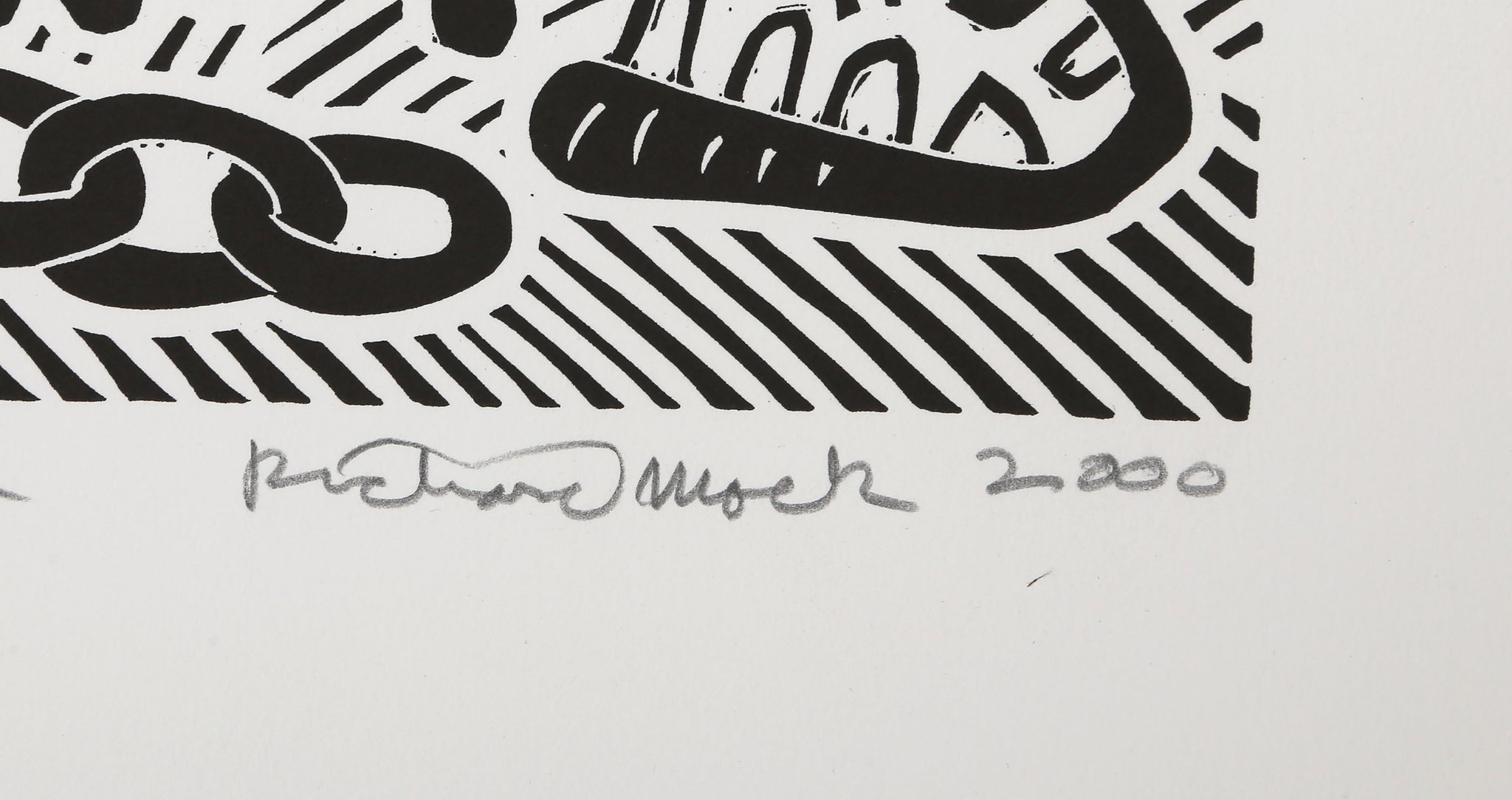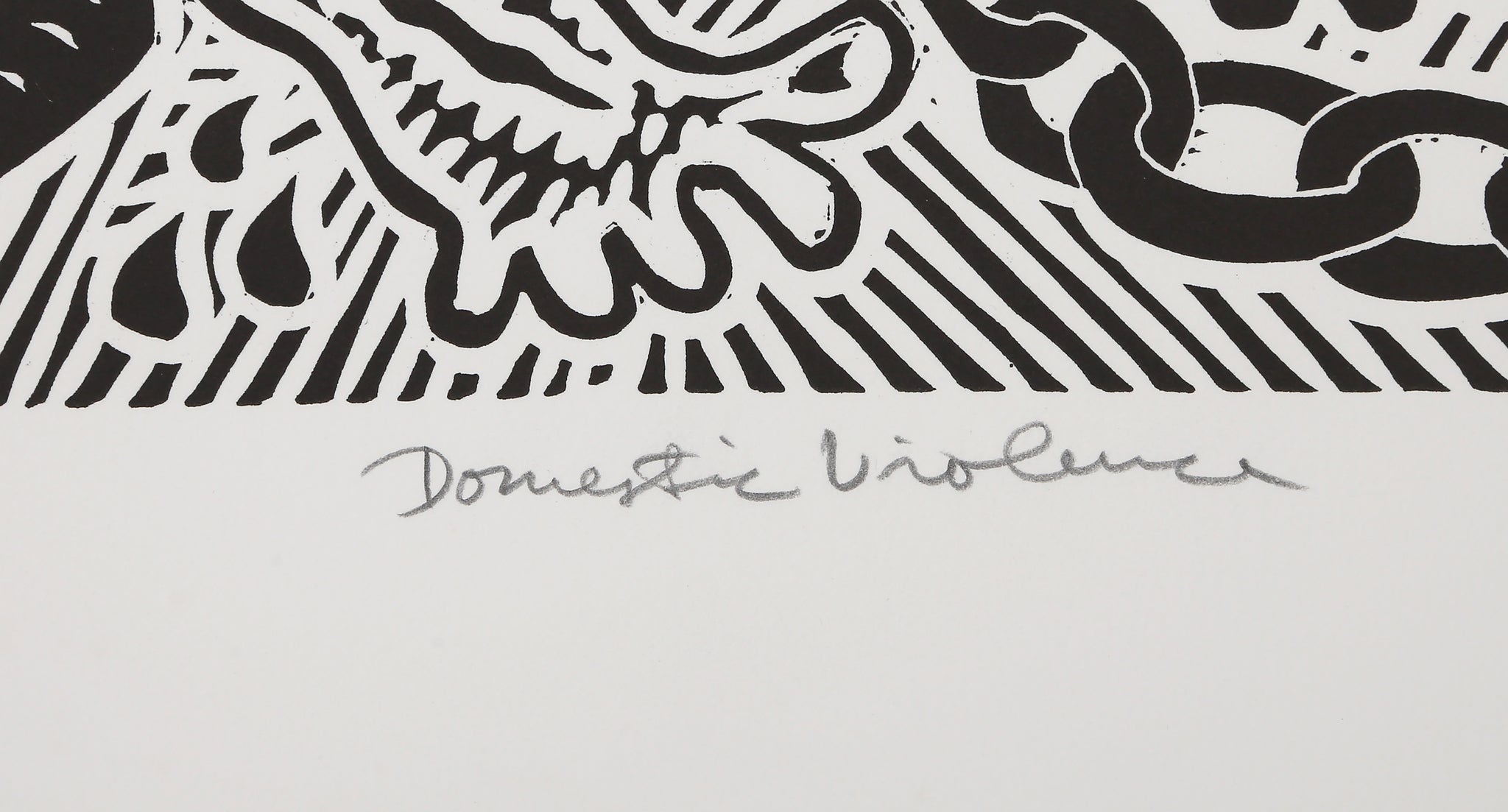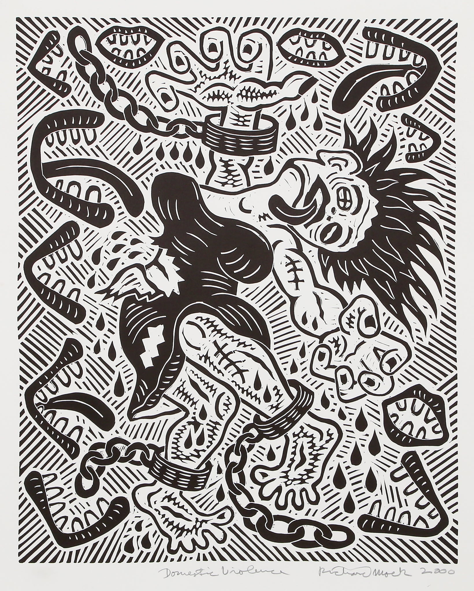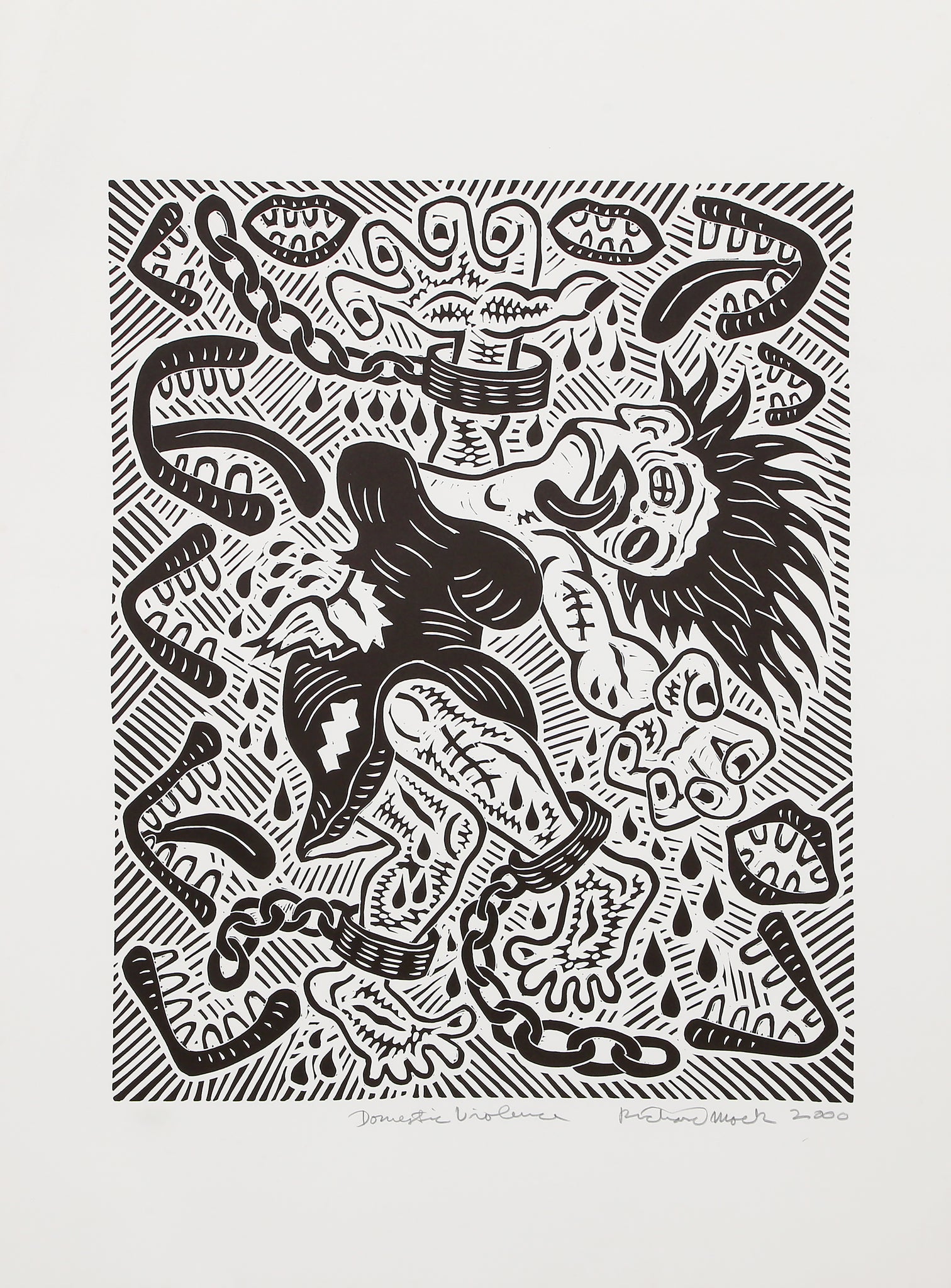 Richard Mock, American (1944 - 2006) - Domestic Violence. Year: 2000, Medium: Linocut on BFK Rives, signed, titled, numbered and dated in pencil, Edition: 80, Image Size: 21 x 17 inches, Size: 30 x 22.5 in. (76.2 x 57.15 cm)