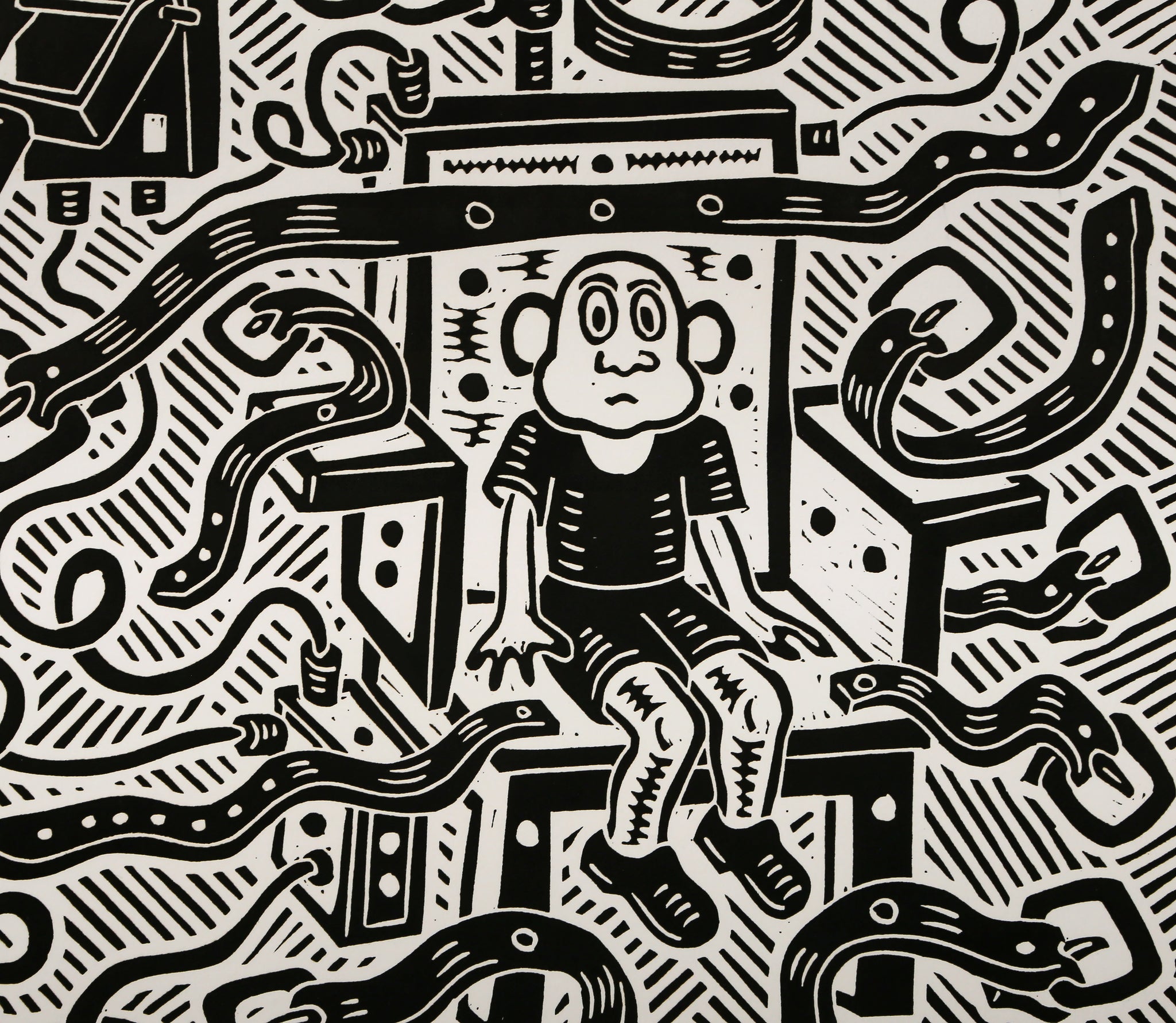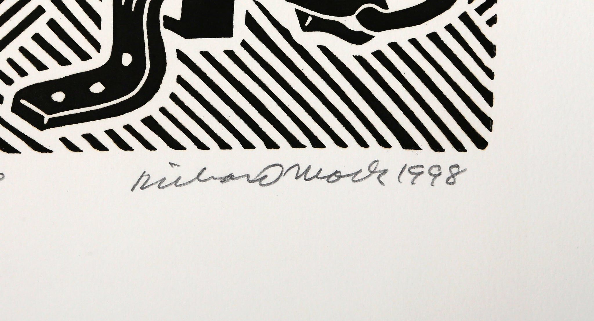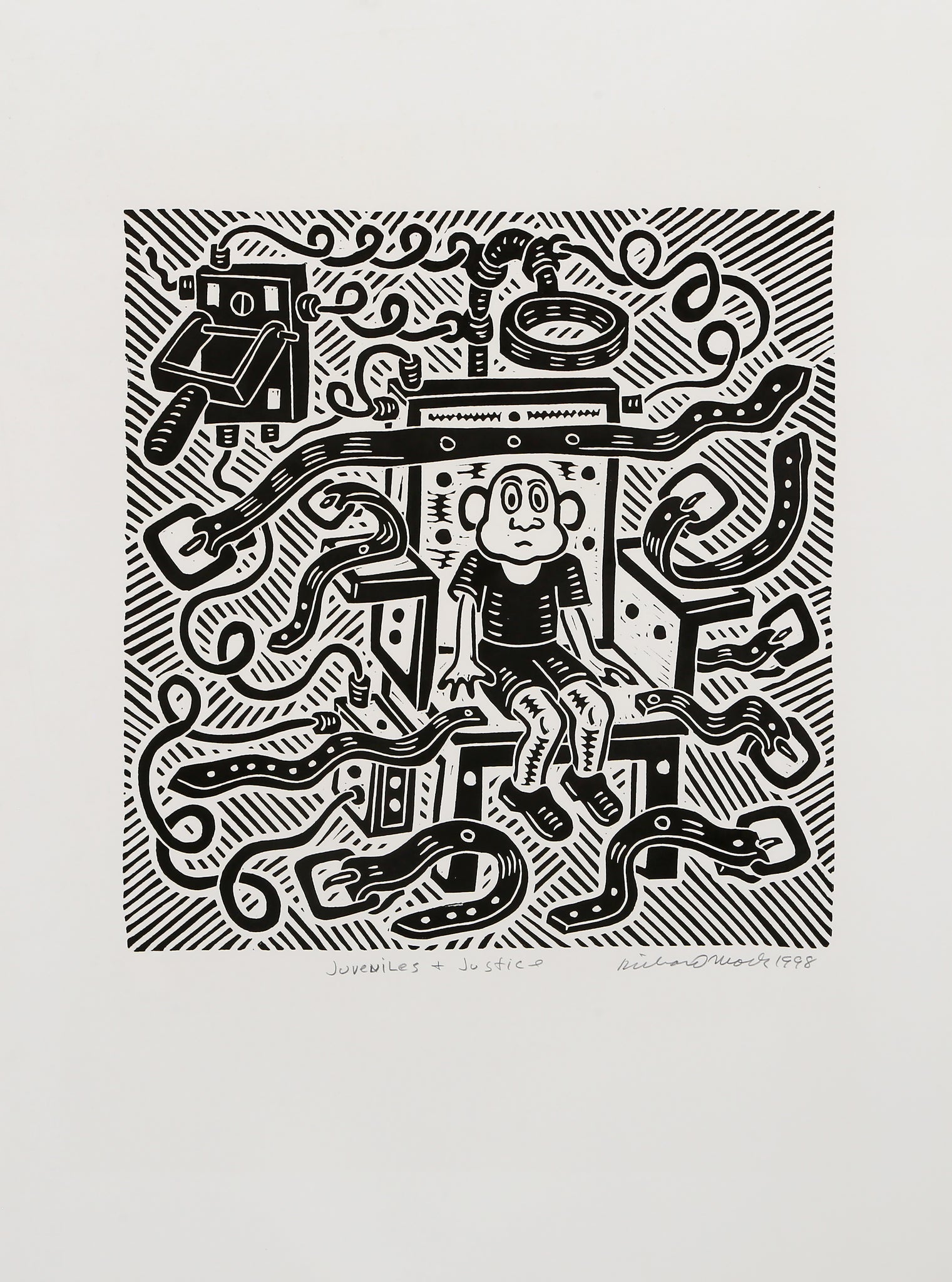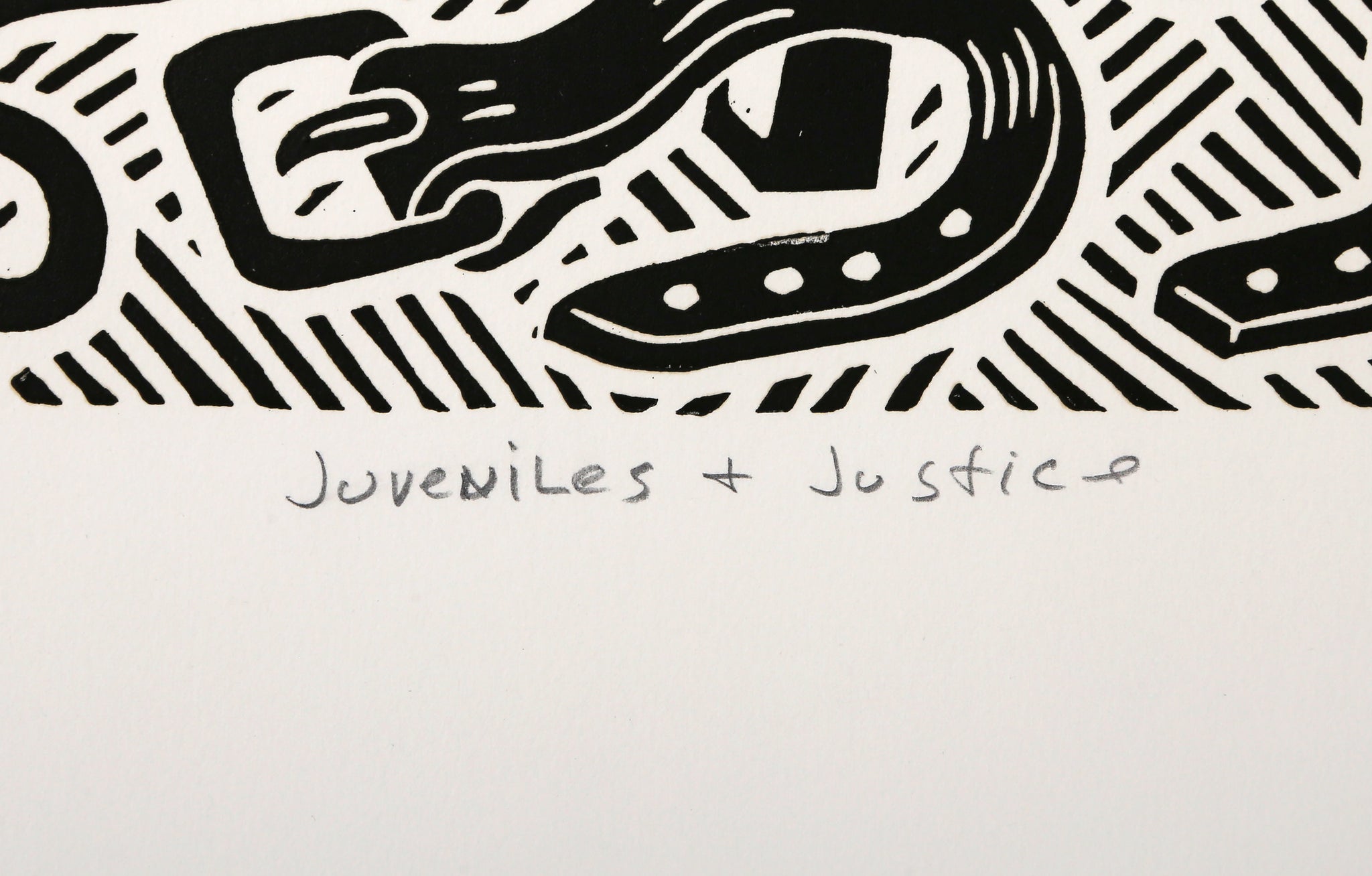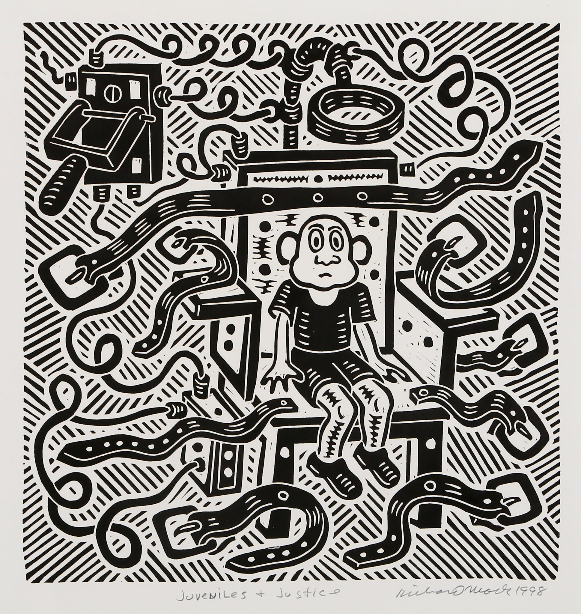 Richard Mock, American (1944 - 2006) - Juveniles + Justice. Year: 1998, Medium: Linocut on BFK Rives, signed, titled, dated and numbered in pencil, Edition: 80, Image Size: 17 x 16 inches, Size: 30 x 22.5 in. (76.2 x 57.15 cm)