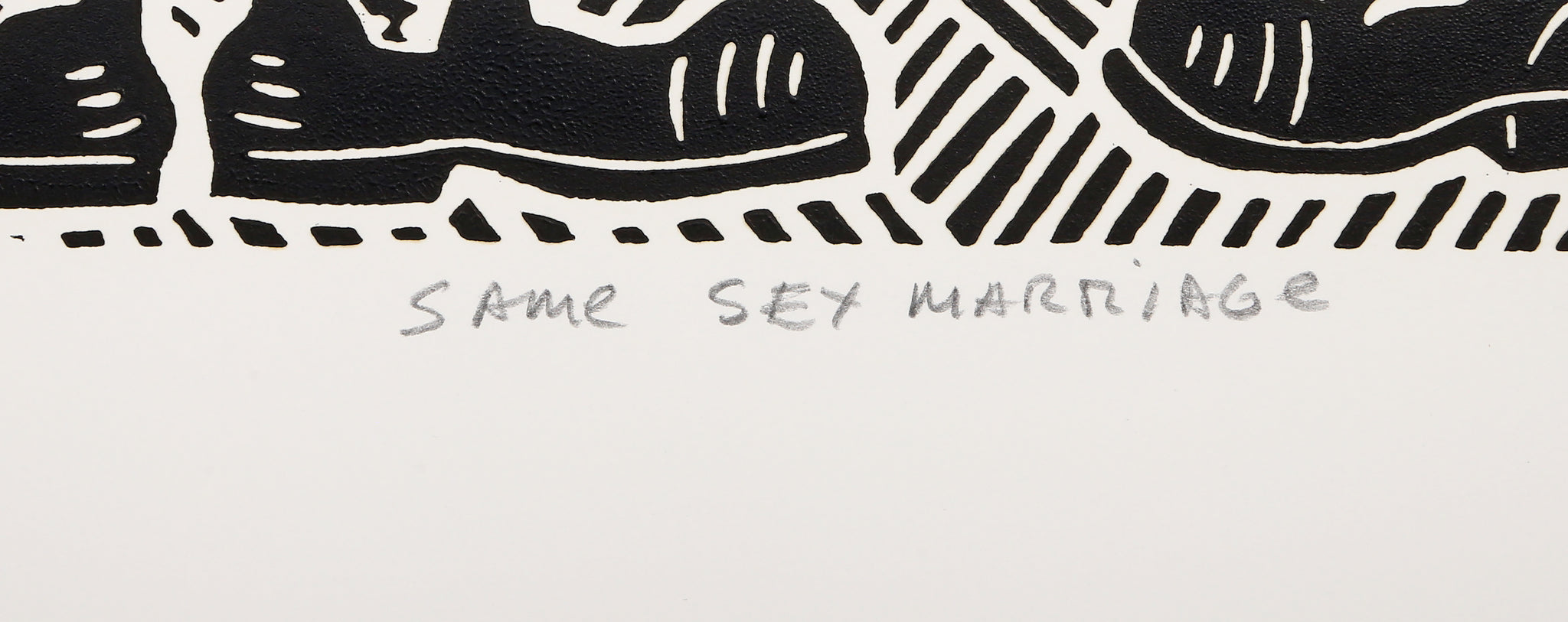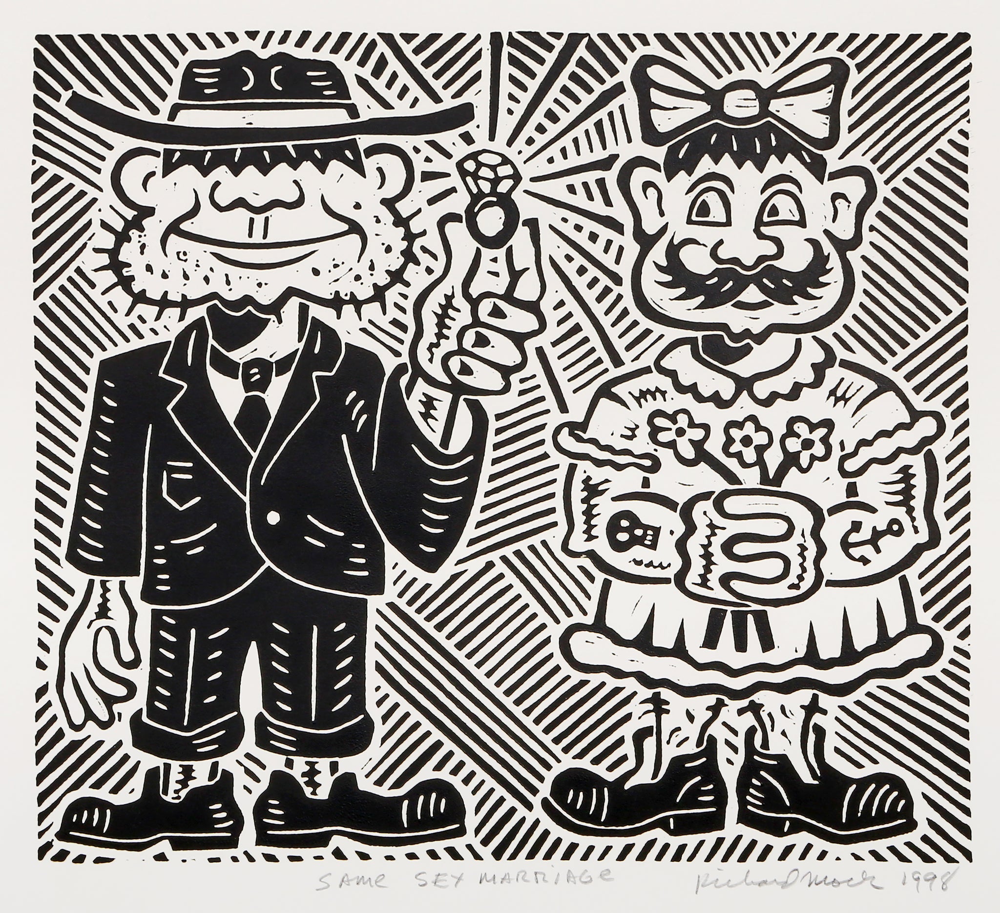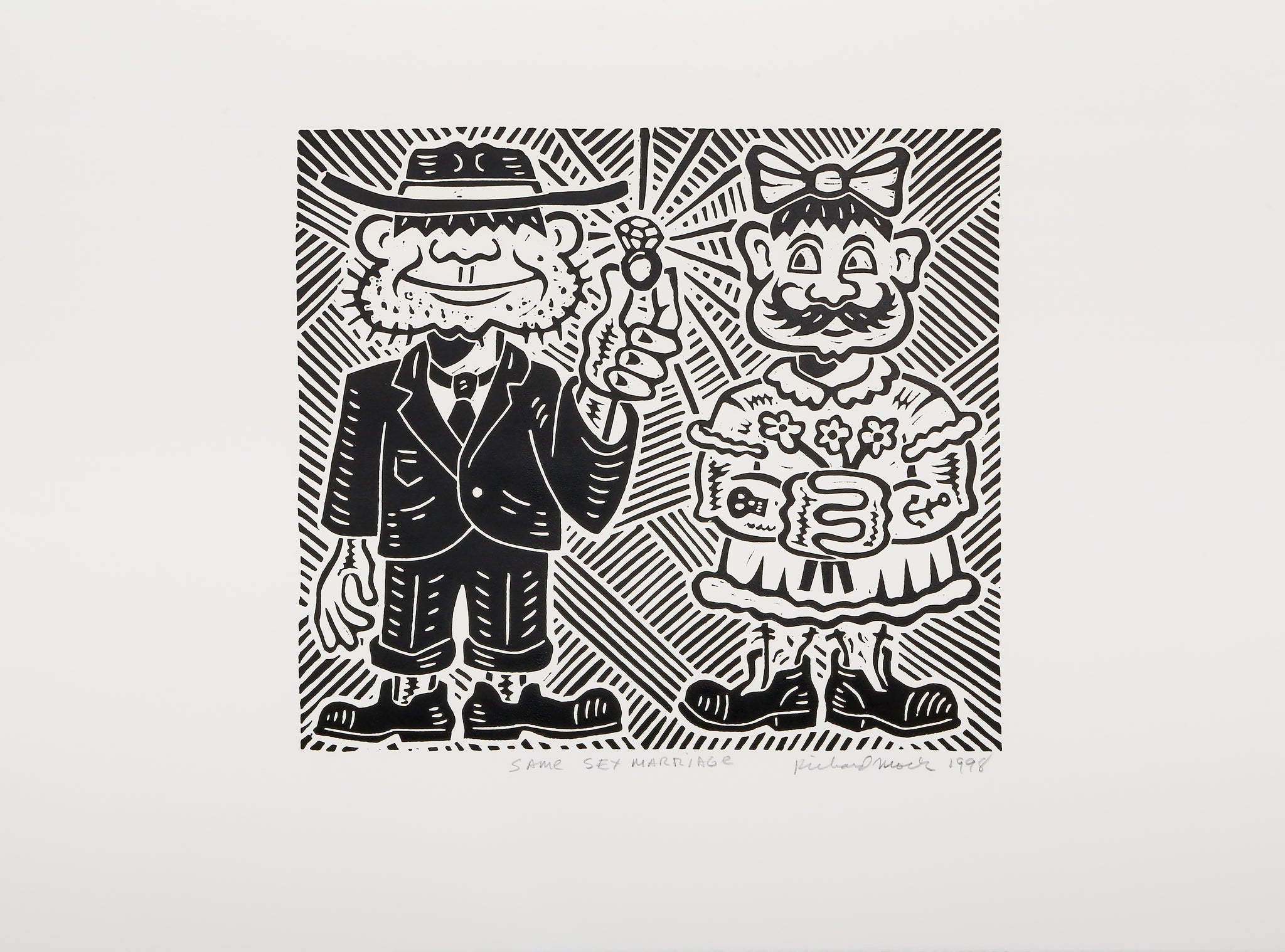 Richard Mock, American (1944 - 2006) - Same Sex Marriage. Year: 1998, Medium: Linocut on BFK Rives, signed, titled, numbered and dated in pencil, Edition: 80, Image Size: 14.25 x 16 inches, Size: 22 x 30 in. (55.88 x 76.2 cm)