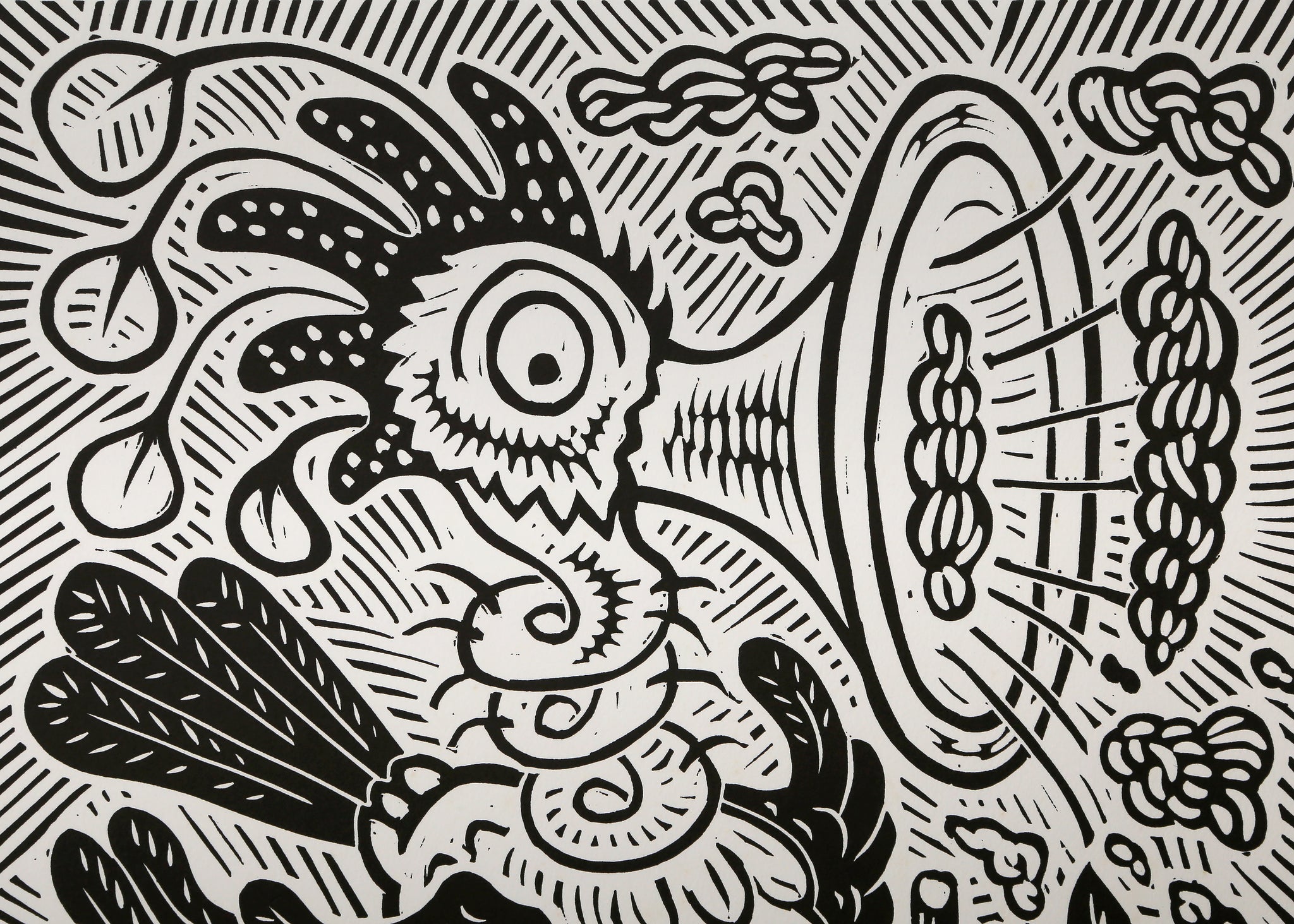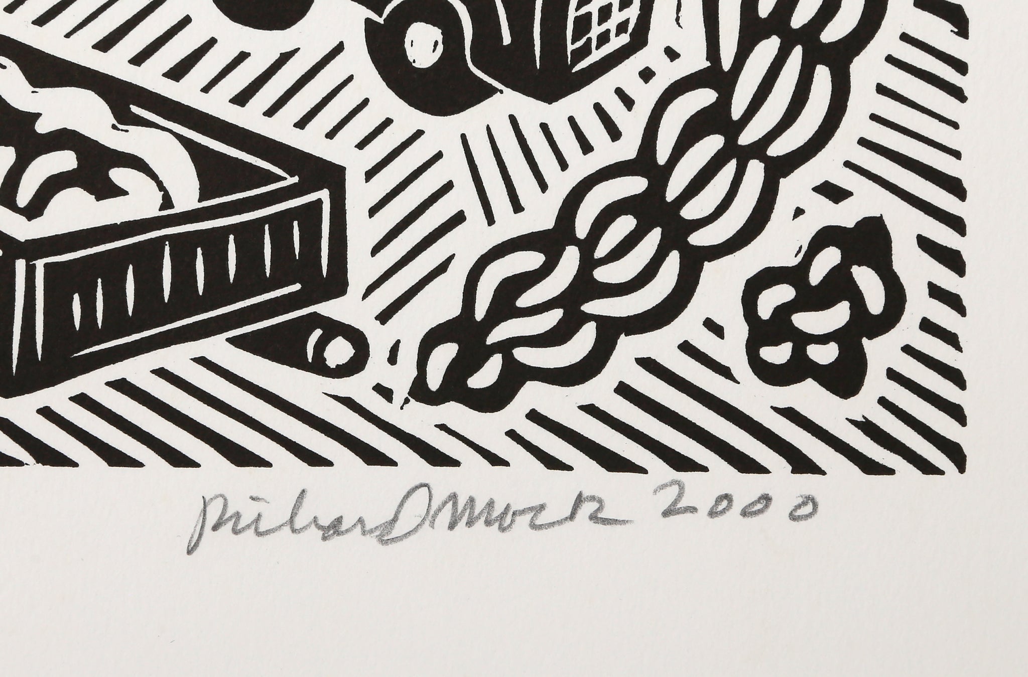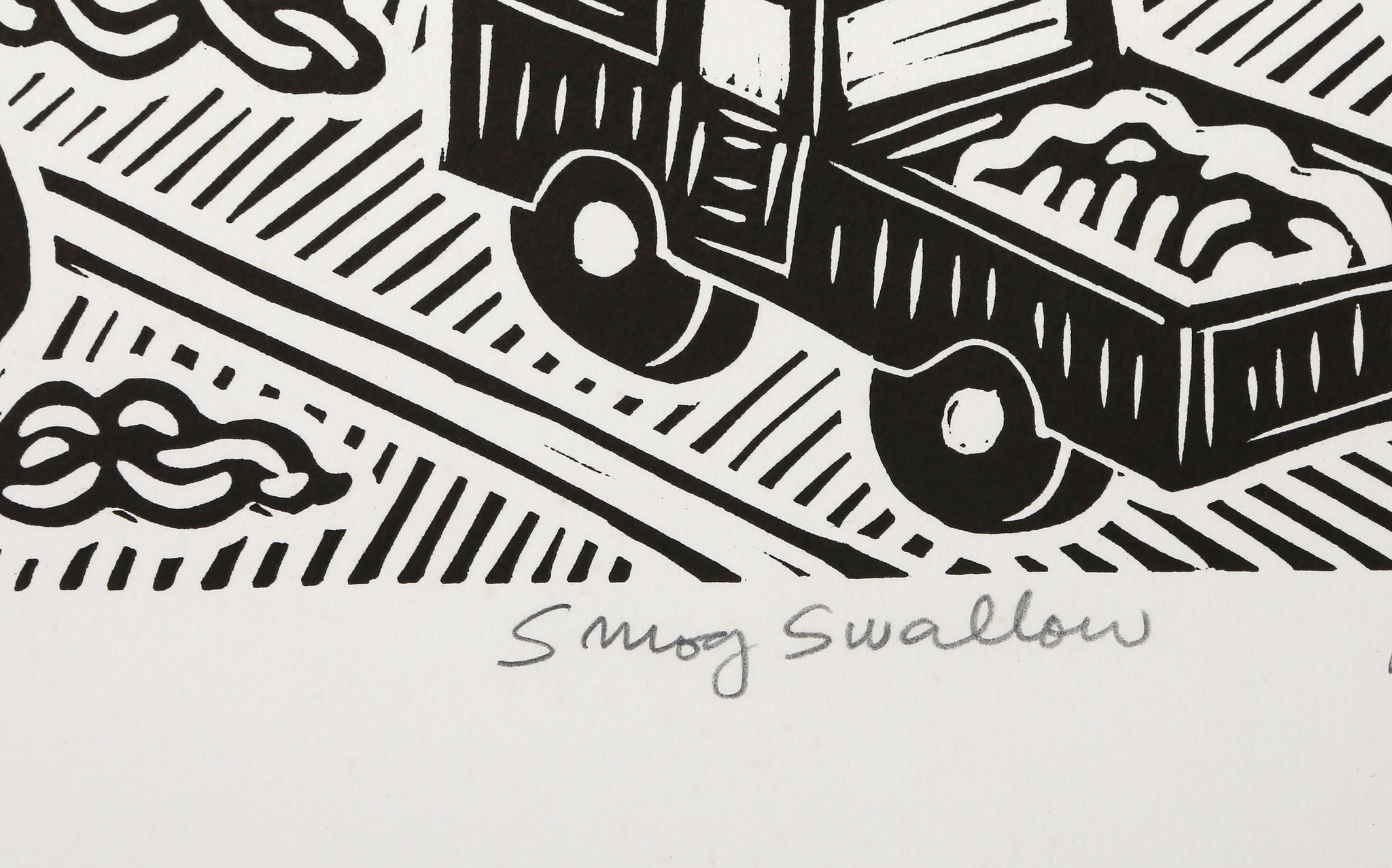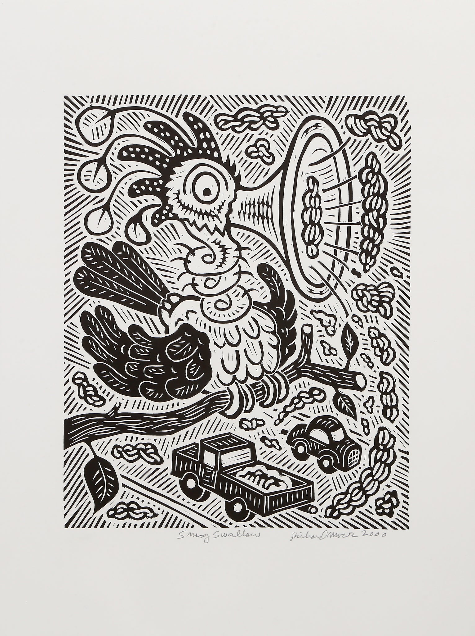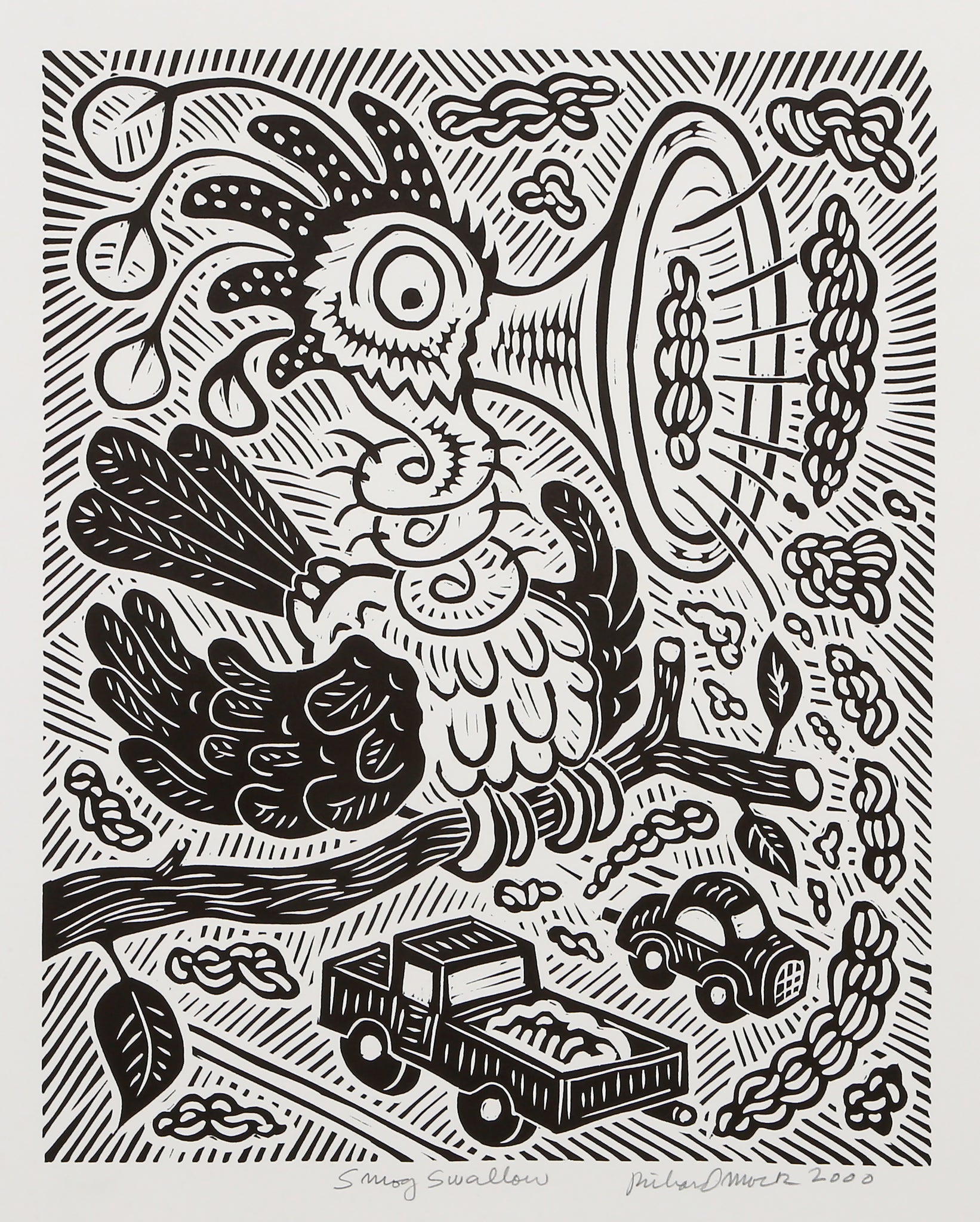 Richard Mock, American (1944 - 2006) - Smog Swallow. Year: 2000, Medium: Linocut on BFK Rives, signed, titled, dated and numbered in pencil, Edition: 80, Image Size: 20 x 16 inches, Size: 30 x 22.5 in. (76.2 x 57.15 cm)