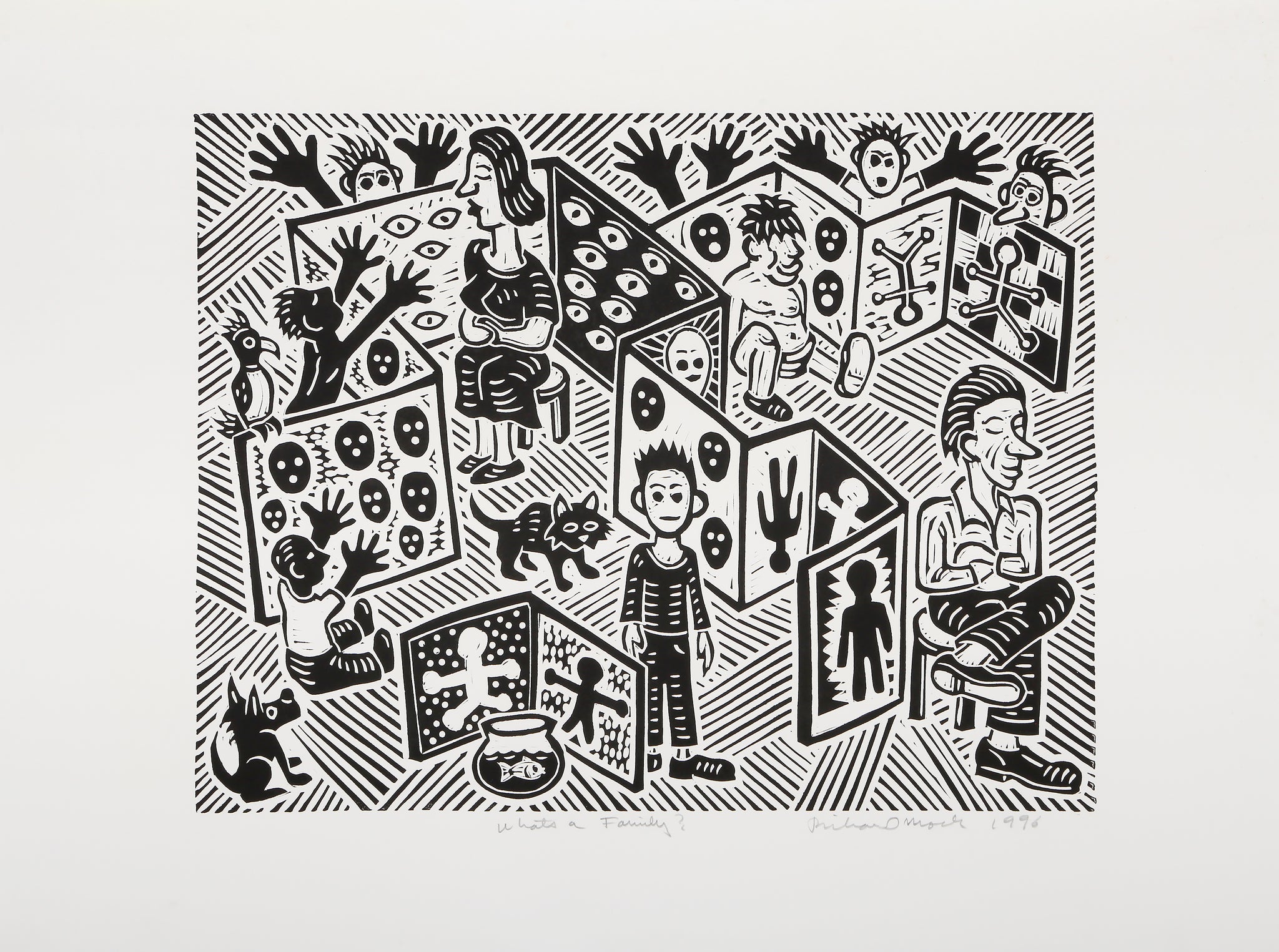 Richard Mock, American (1944 - 2006) - What A Family?. Year: 1996, Medium: Linocut on BFK Rives, signed, titled, numbered and dated in pencil, Edition: 80, Image Size: 16 x 20.75 inches, Size: 22 x 30 in. (55.88 x 76.2 cm)