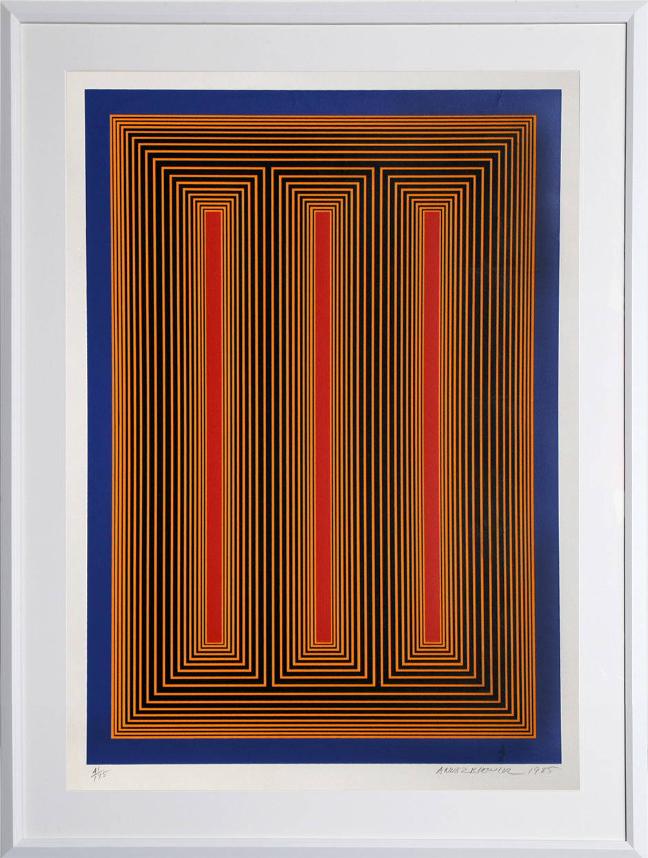 "Temple of the Golden Red" is a stunning silkscreen by a leader of the OP Art movement, Richard Anuszkiewicz. The print is hand-signed, dated and numbered in pencil.