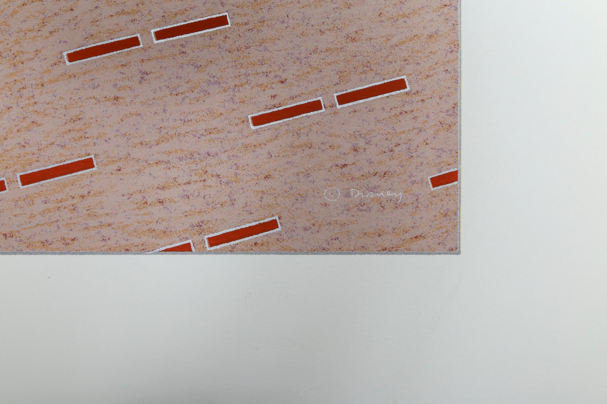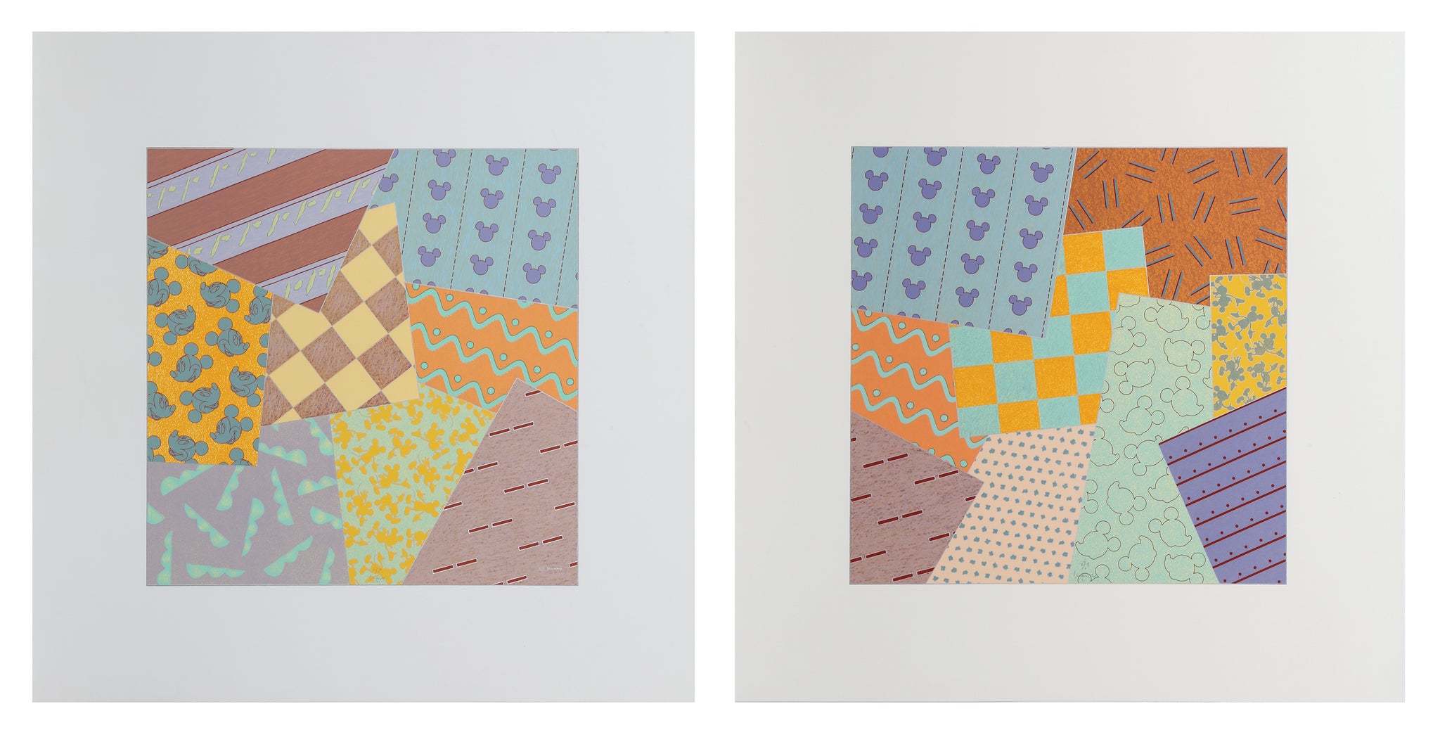 Two screenprints by architect and designer Michael Graves. Graves designed several buildings for the Walt Disney Company and these two pieces were likely designed for the interior of one of those buildings. They resemble a pile of papers, each sheet designed with a different pattern on it, many of which contain the image of Mickey Mouse on them.
