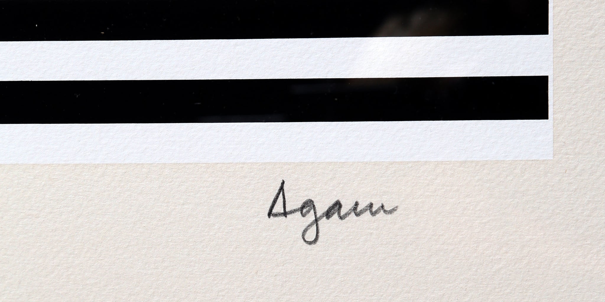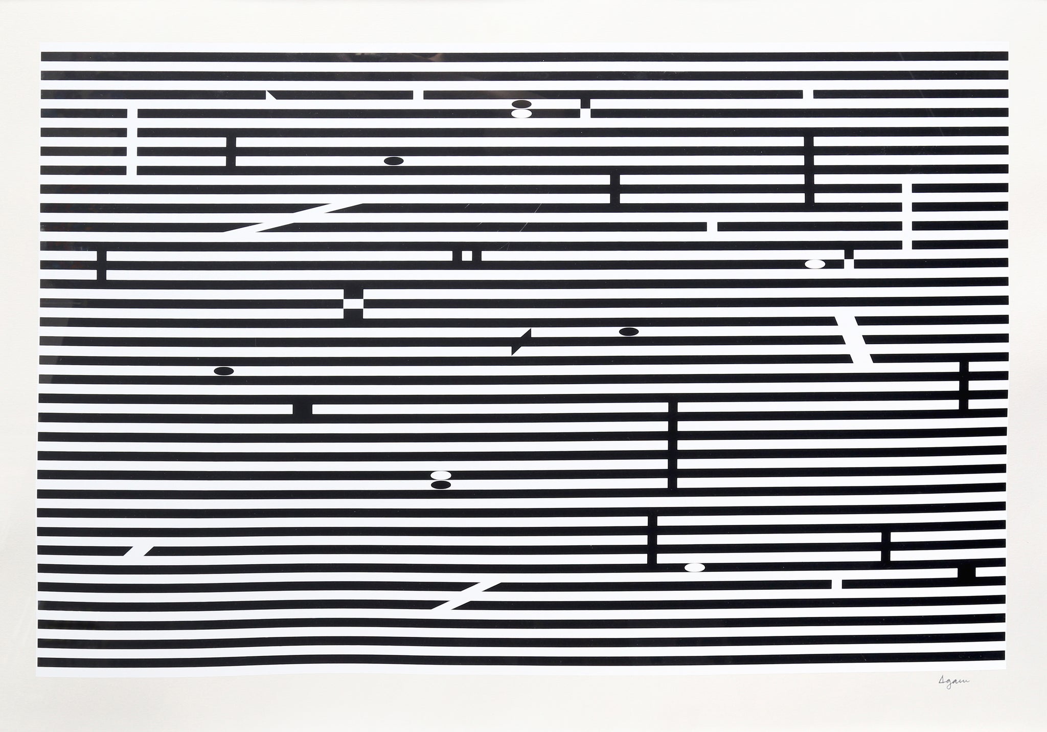 A simple black and white geometric abstract screenprint by Israeli artist Yaacov Agam. This large piece plays tricks on the eye when the viewer moves around, giving the illusion that the tightly-placed lines are moving.