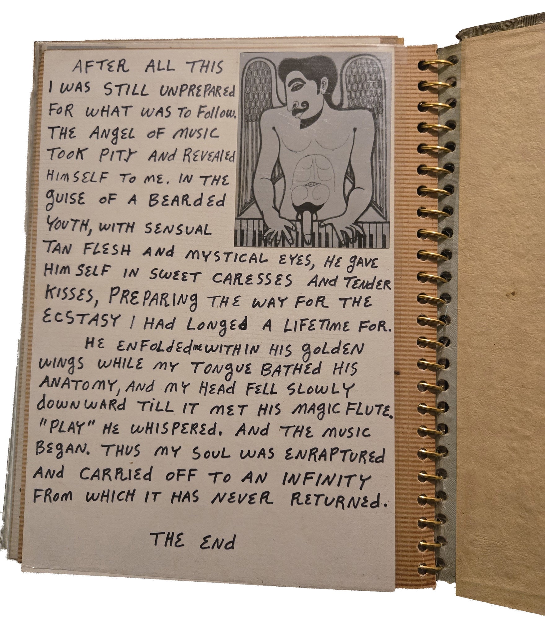 A hand-written book by American Psychedelic and Folk artist Rex Clawson. The book, written in marker and bound in a custom fabric cover, contains a retelling of an encounter Clawson experienced while tripping on LSD. It contains several hand-drawn illustrations that depict the various figures from the story.