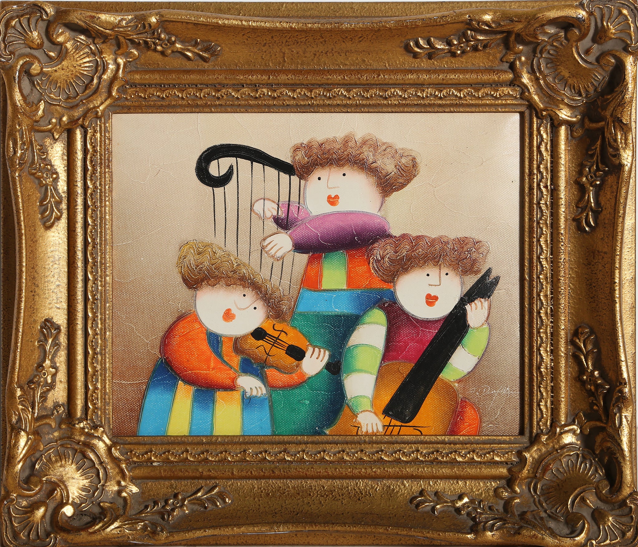 Joyce Roybal, American (1955 - ) - String Trio. Medium: Oil on Canvas, signed lower right, Size: 8 x 10 in. (20.32 x 25.4 cm), Frame Size: 12.5 x 14.75 inches