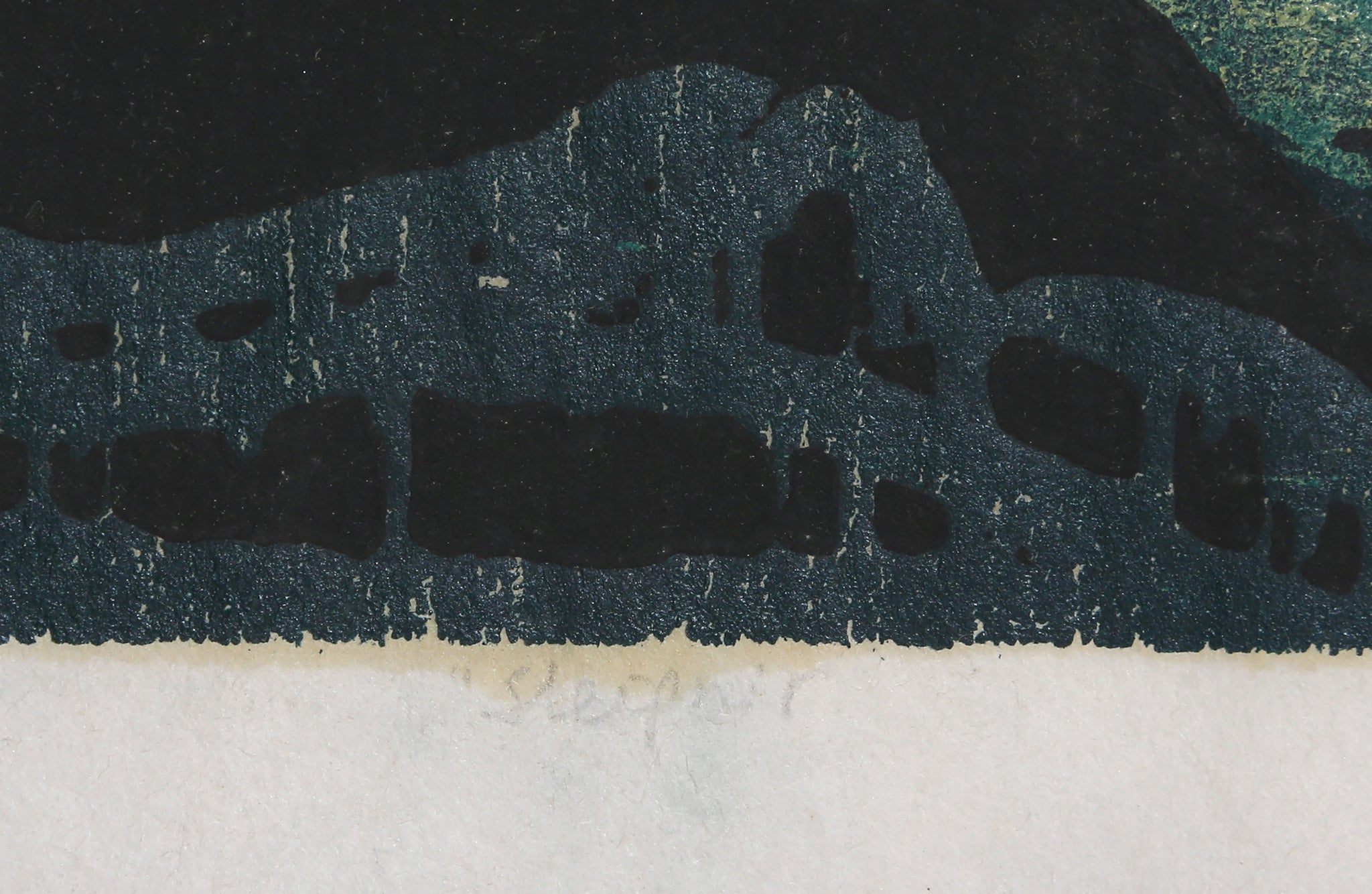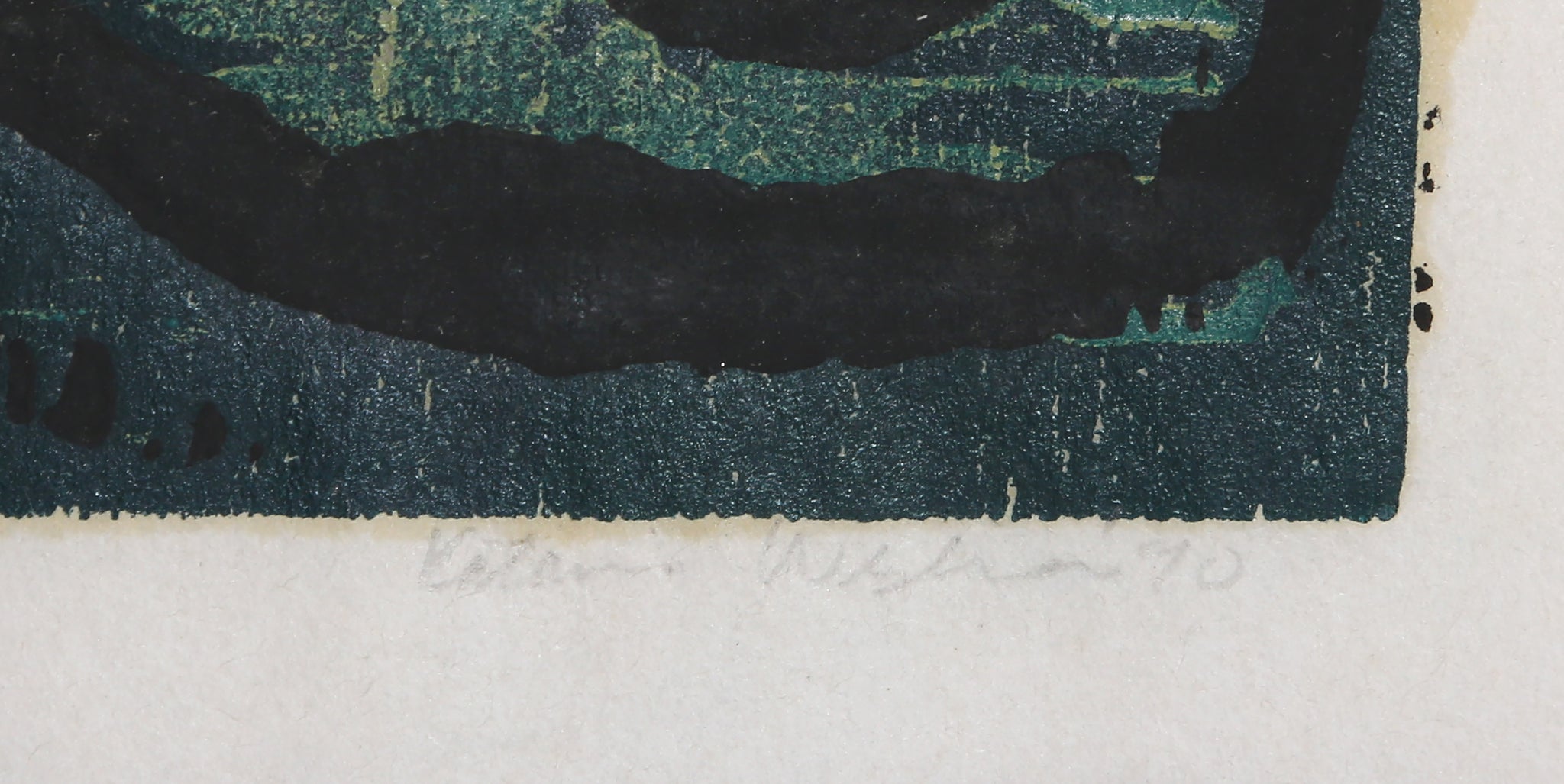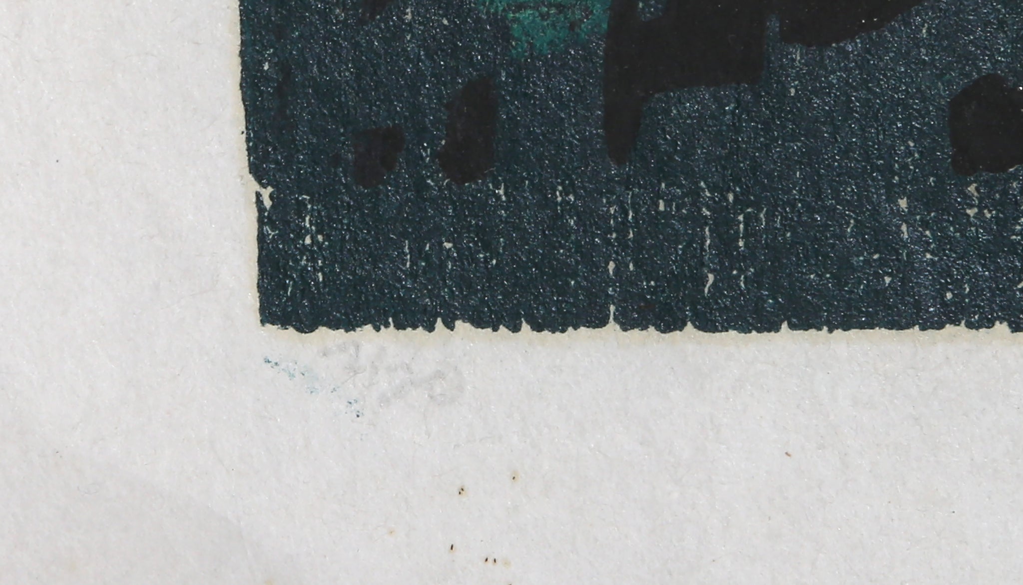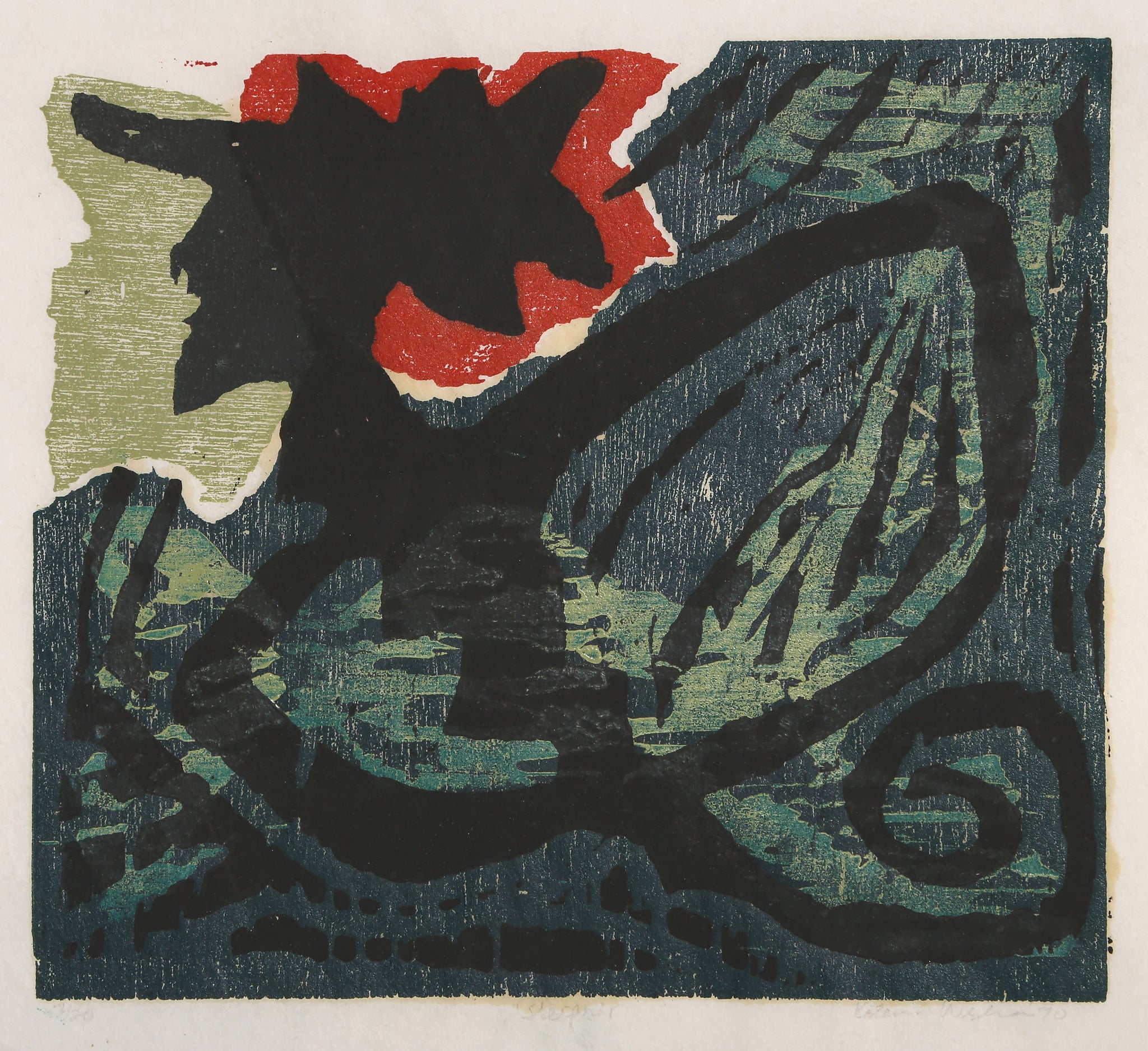 Katherine Winckler's hand-signed woodcut presents an abstract interpretation inspired by Norse mythology's eight-legged horse Sleipnir. The print features layered overlays and bold abstract forms that evoke folk art traditions while embracing modern artistic sensibilities. This striking work demonstrates Winckler's skill in woodcut technique and her ability to bridge ancient mythology with contemporary abstract expression, perfect for collectors of folk-inspired modern art.