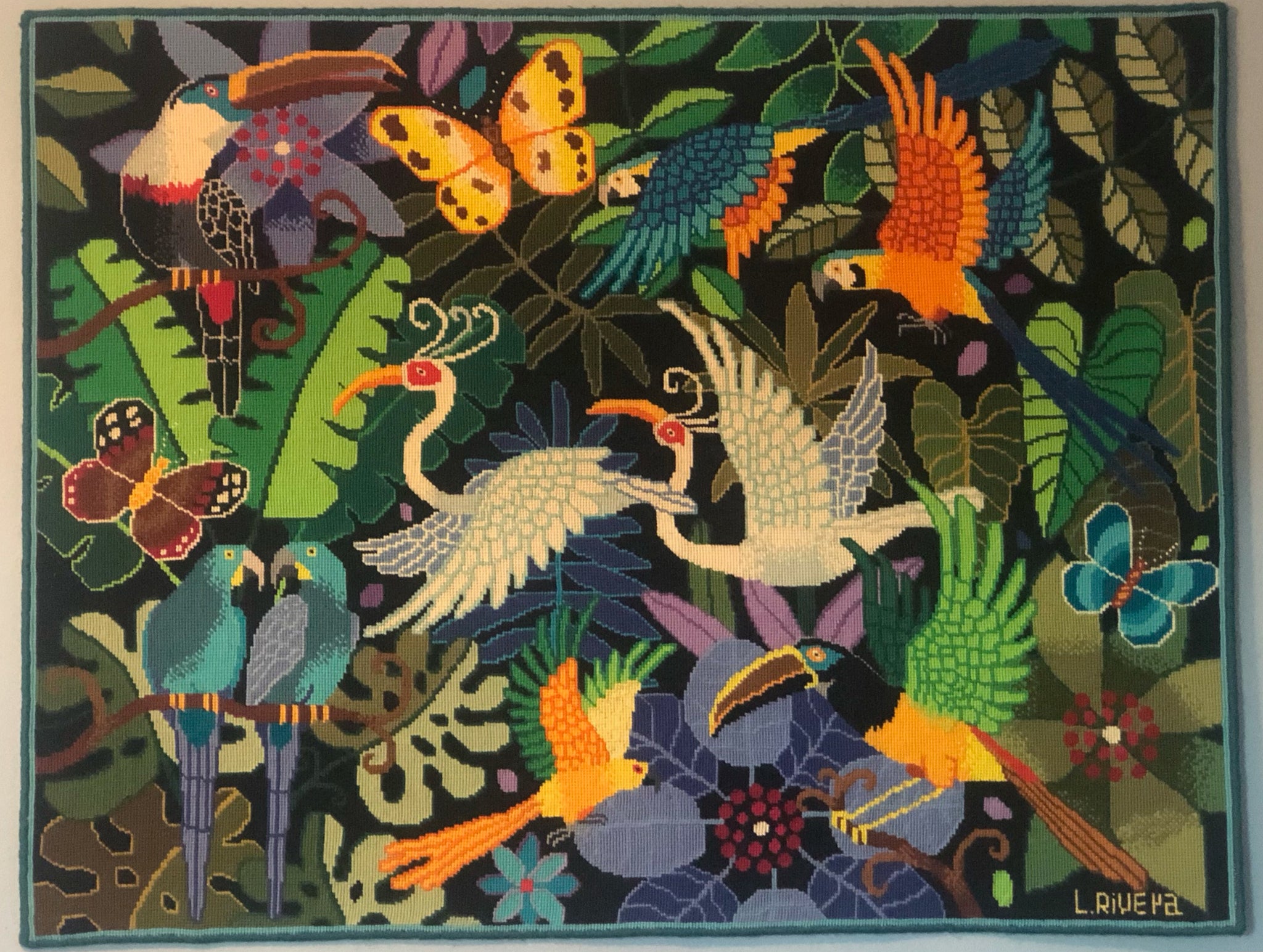 Immerse yourself in the vibrant world of Latin American Art and Animals and Wildlife with this exquisite hand-woven tapestry featuring toucans, butterflies, birds, and lush tropical flowers and plants in a forest setting. Luis Rivera's decorative textile exemplifies the Latin American Art movement's celebration of biodiversity and the Textiles and Tapestries tradition's mastery of fiber art, where colorful wildlife and botanical elements merge into a stunning visual celebration of nature. The artist's intricate weaving technique brings the tropical forest to life with rich colors and detailed imagery that honors the beauty of Latin American ecosystems. A spectacular addition for collectors of Latin American Art, Animals and Wildlife, and Textiles seeking decorative works that celebrate natural splendor.