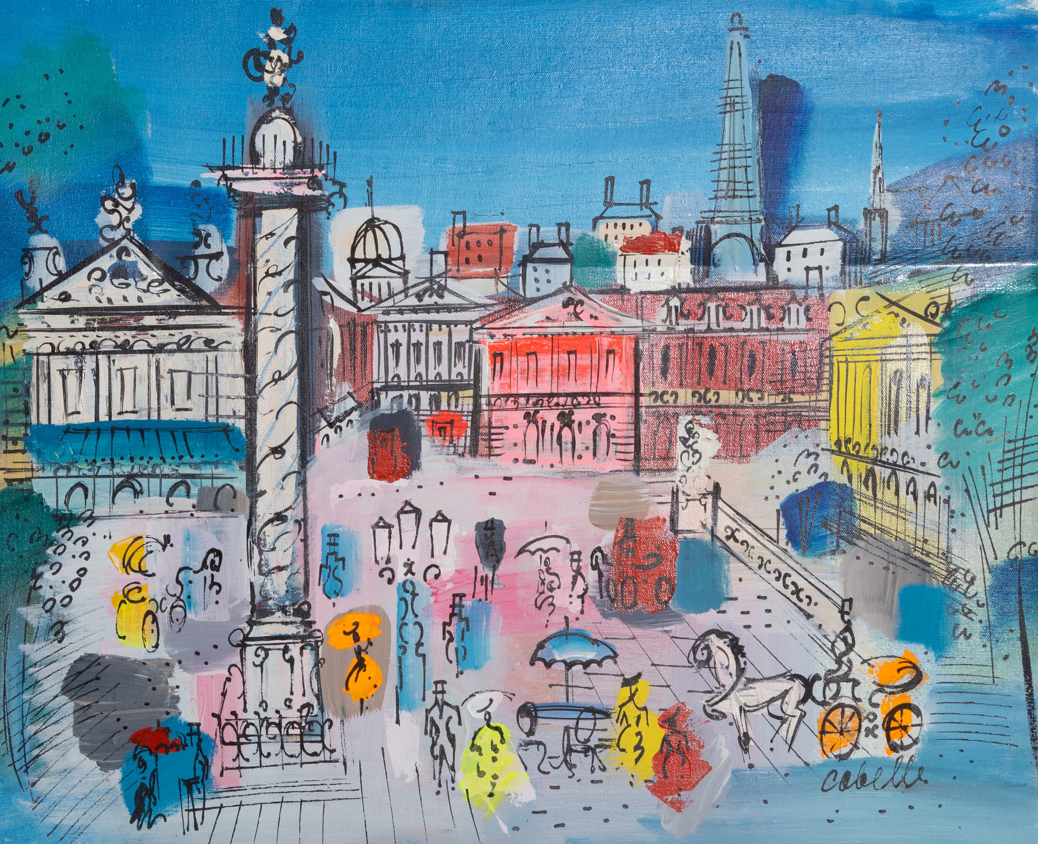 Charles Cobelle, French (1902 - 1994) - Colonne de Julliet. Year: circa 1960, Medium: Acrylic on canvas, signed, Size: 20 x 24 in. (50.8 x 60.96 cm), Description: A bright and colorful Parisian cityscape by French artist Charles Cobelle