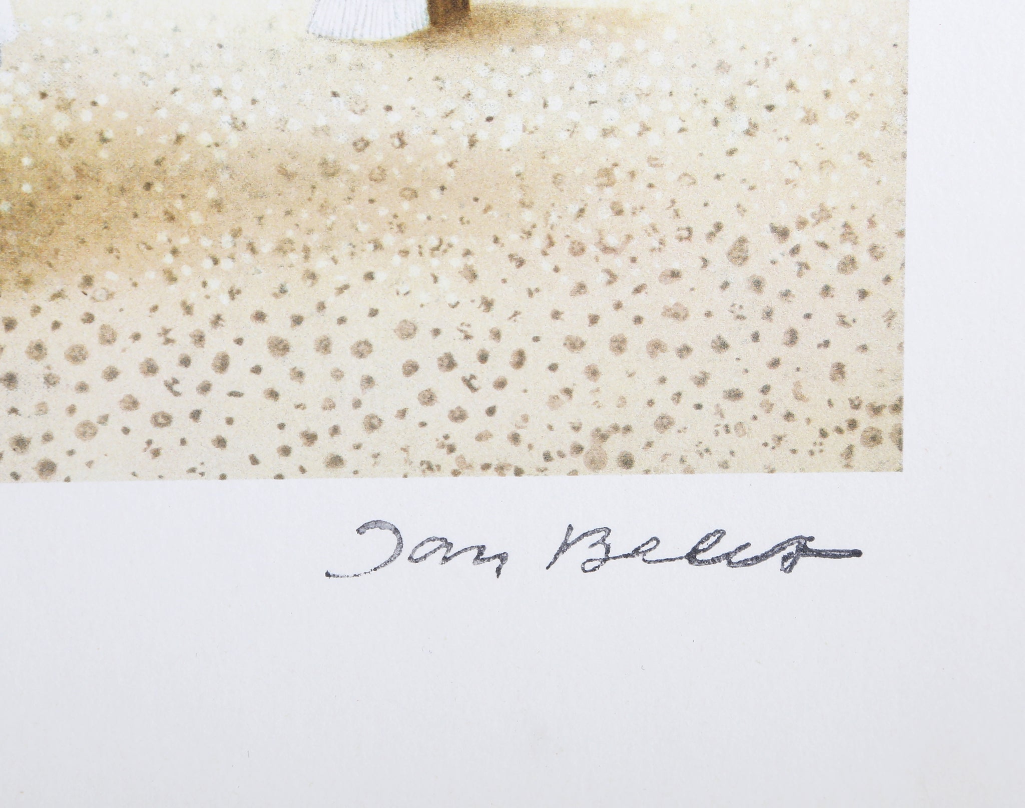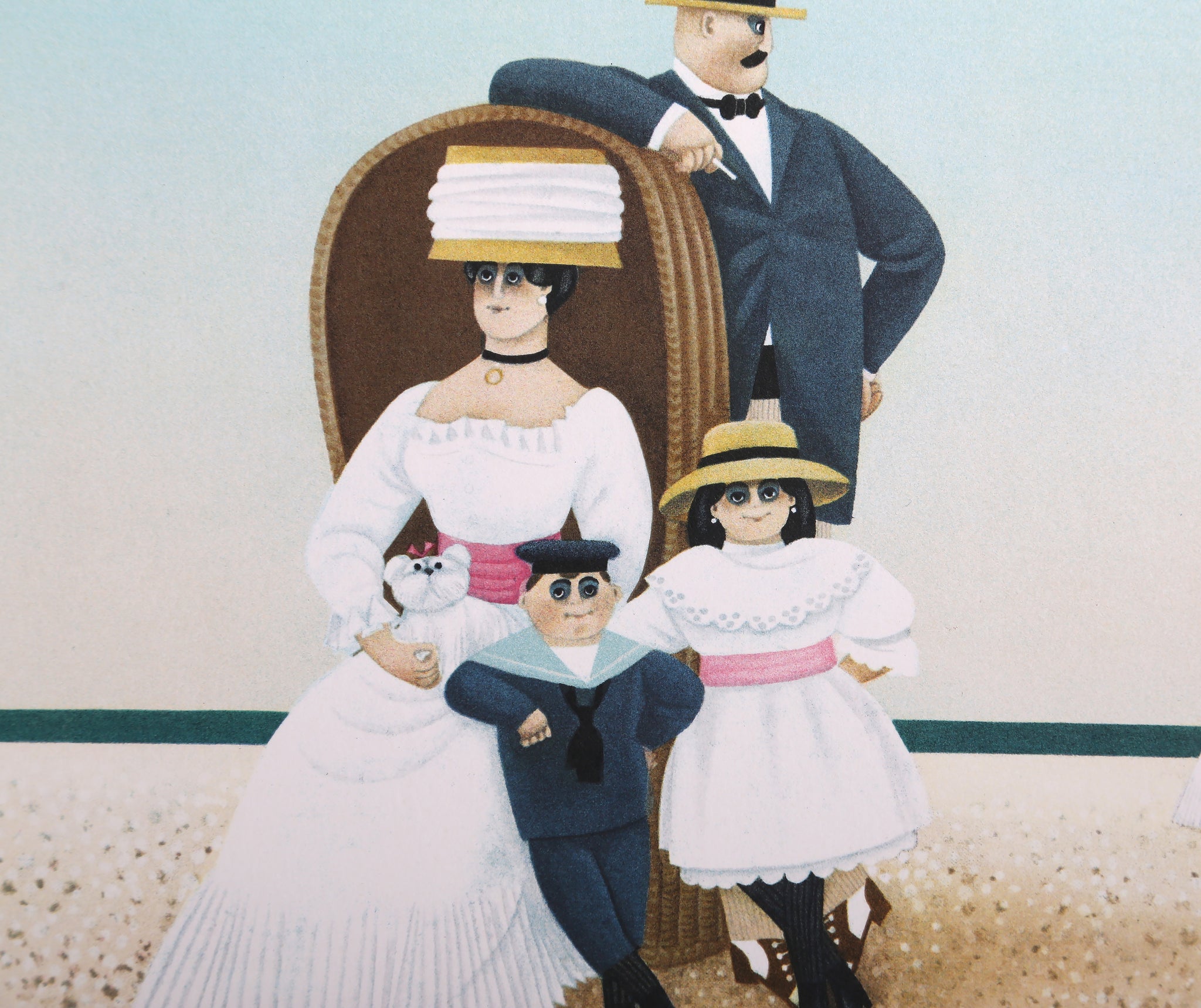 This charming offset lithograph by Jan Balet depicts a family relaxing on a beach with chairs and desert landscape elements, rendered in the artist's distinctive Modern Art style influenced by French art and the School of Paris. Created with Balet's characteristic use of simplified forms and warm color palette, the composition captures the leisurely atmosphere of seaside family life with a touch of Mexican-inspired aesthetic. The print showcases Balet's ability to blend figurative elements with decorative patterns and flat color planes, characteristic of mid-century modern illustration and printmaking. A delightful example of Balet's work that celebrates the simple pleasures of family time and coastal relaxation.