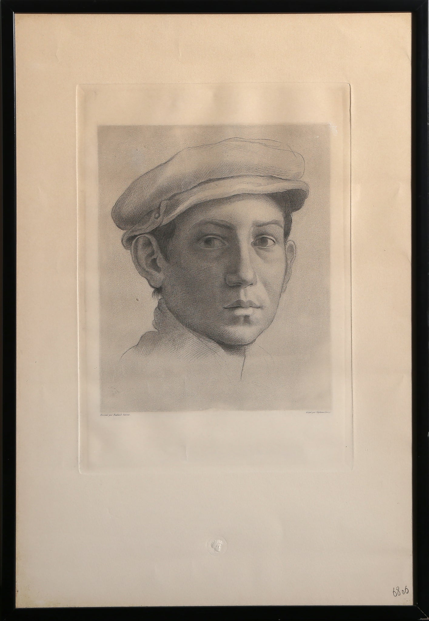 Raphael Sanzio da Urbino, After by Alphonse Leroy, Italian (1483 - 1520) - Portrait of a Young Man. Year: circa 1858, Medium: Etching, Image Size: 10.75 x 8.5 inches, Size: 22 x 14.75 in. (55.88 x 37.47 cm), Frame Size: 23 x 16 inches, Publisher: Musee Louvre Chalcographie