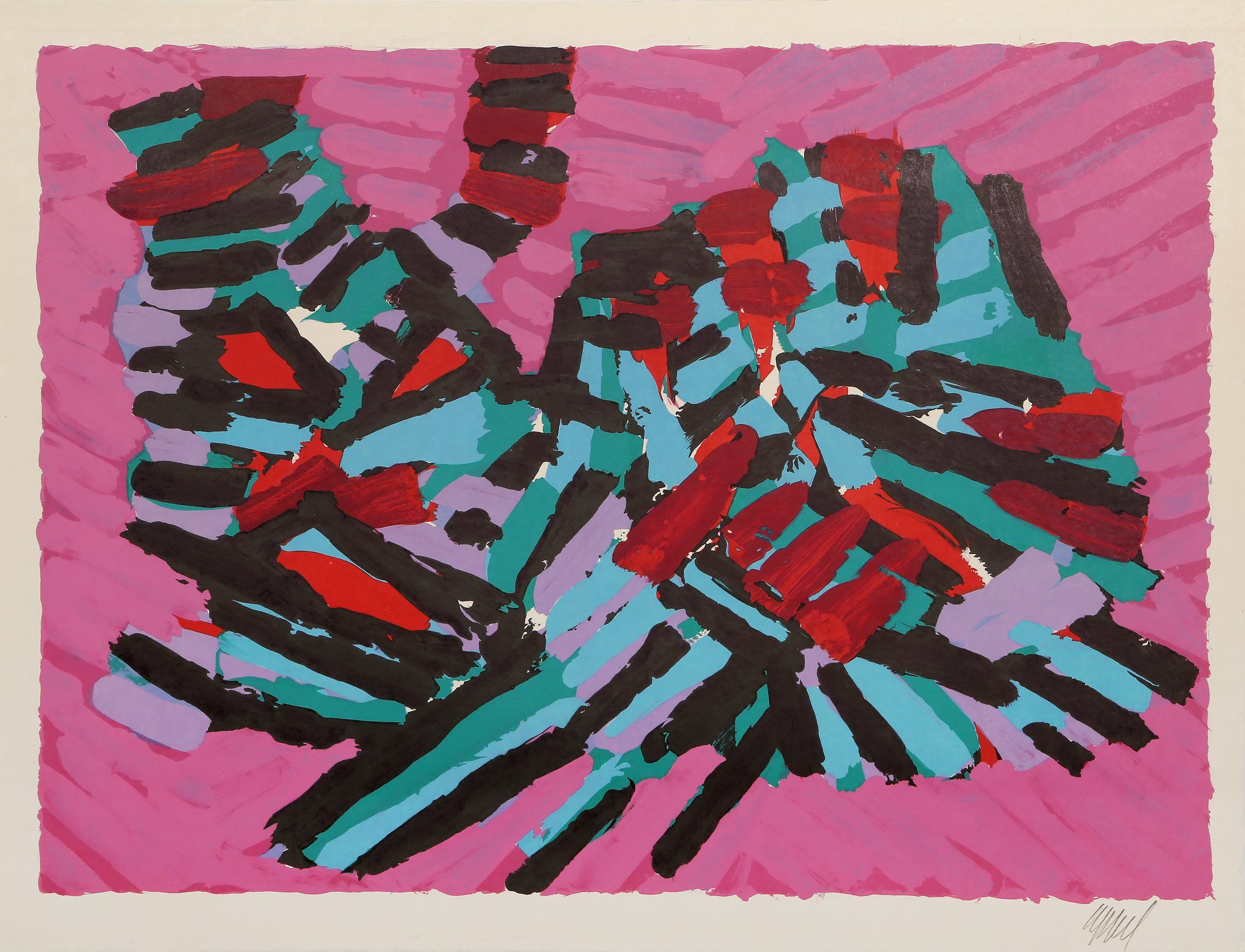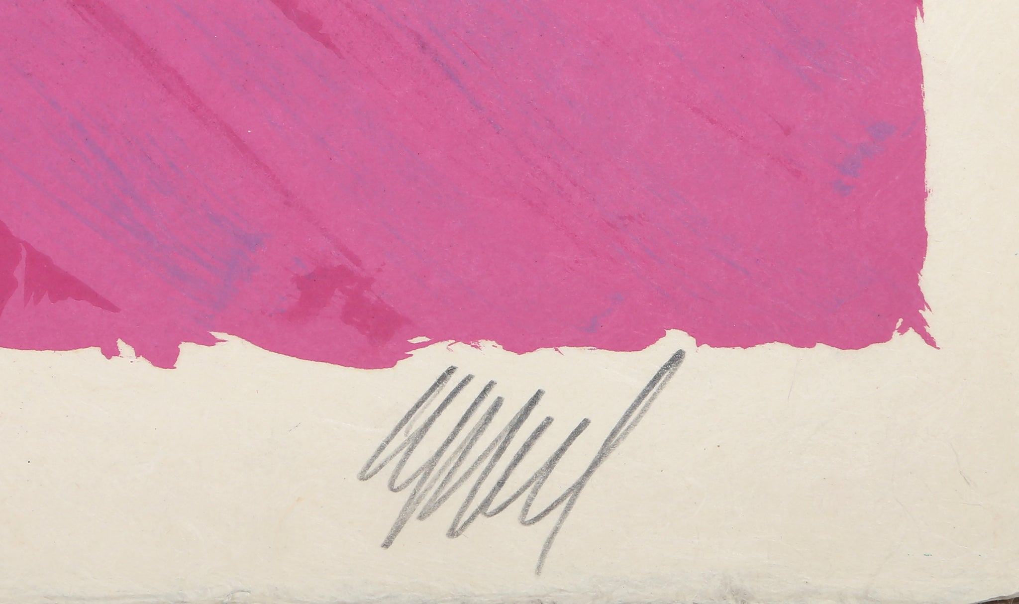 This signed and numbered lithograph on Japon paper is from a portfolio of 17 prints by Modern artist Karel Appel. He admired the domestic house cat for its aloof, yet instinctive, demeanor, and it became one of his favorite subjects. The portfolio "Cats" is a visual meditation on the animals’ behavior in which the artist depicts them resting, walking, stalking, frightened, and poised to attack.