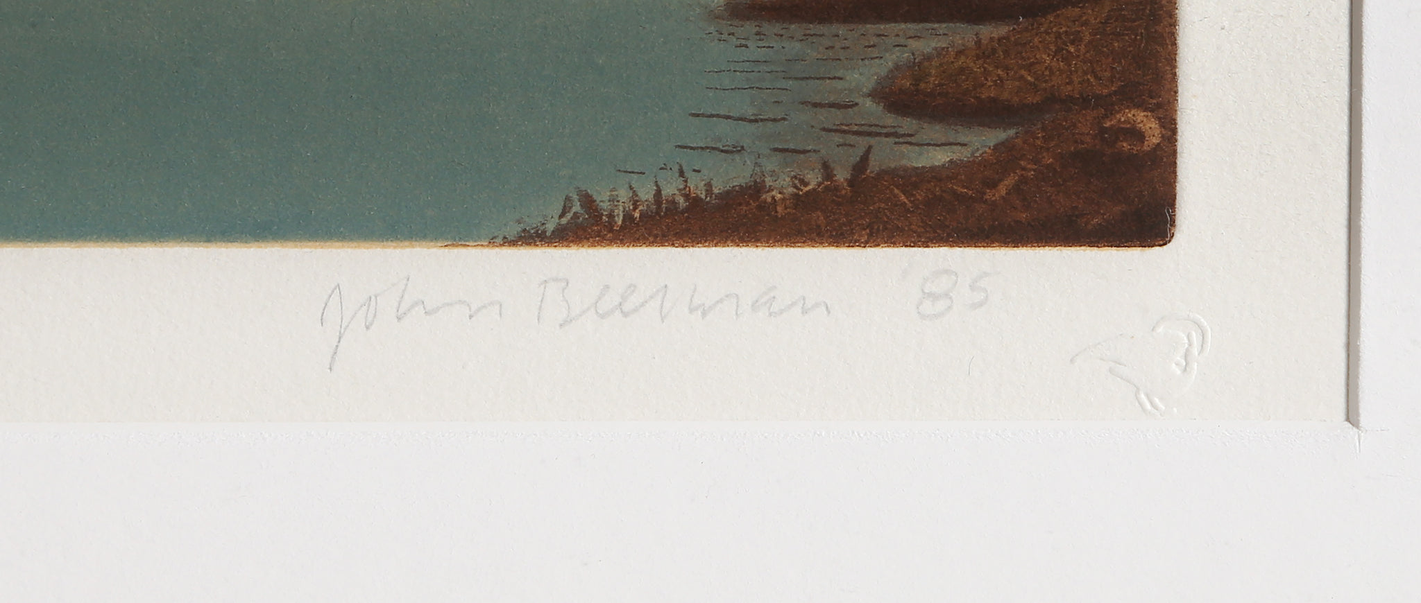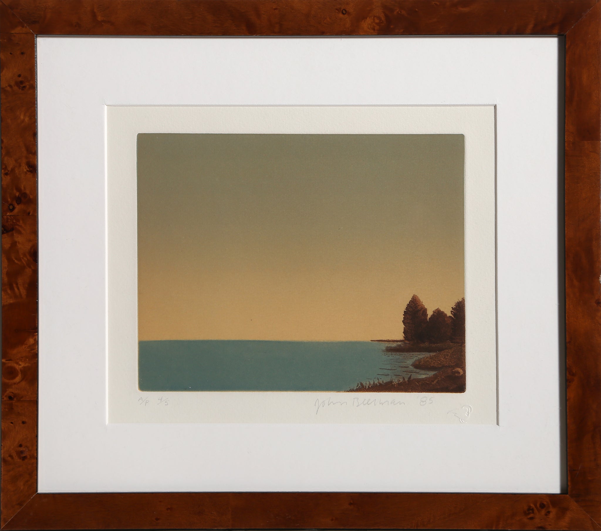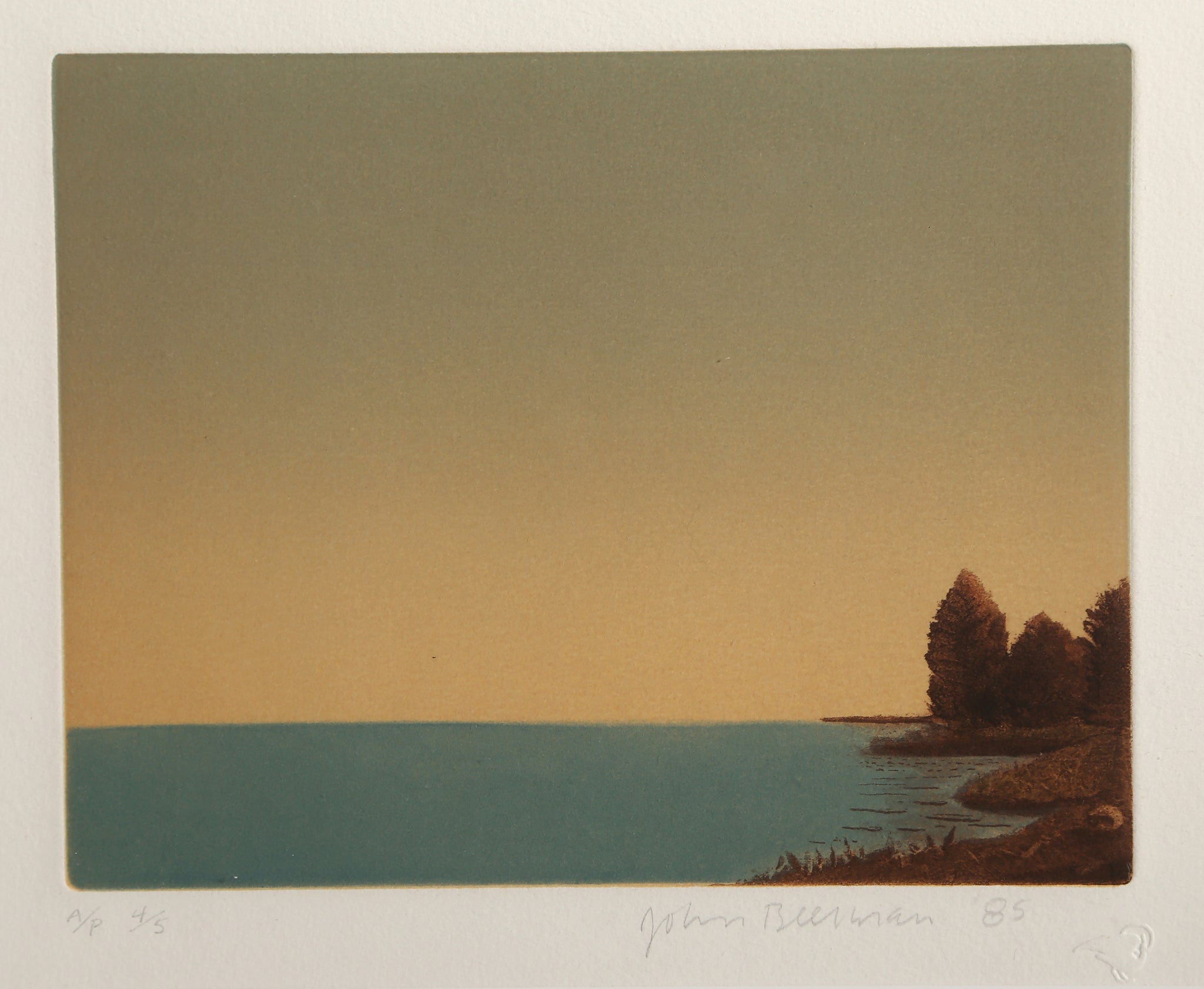 John Beerman, American (1958 - ) - Sea Outlook. Year: 1985, Medium: Etching, signed and numbered in pencil, Edition: AP 4/5, Image Size: 7 x 9 inches, Size: 15 x 15 in. (38.1 x 38.1 cm), Frame Size: 16 x 16.25 inches, Printer: Syliva Roth, Publisher: Hudson River Editions, Description: This print could almost be classified as minimalist, with its two geometric swaths of color in pale blue and yellow. But the right of the composition returns the pieces to reality, lining the scene with a warm brown shoreline and trees. This etching is signed in pencil by the artist.