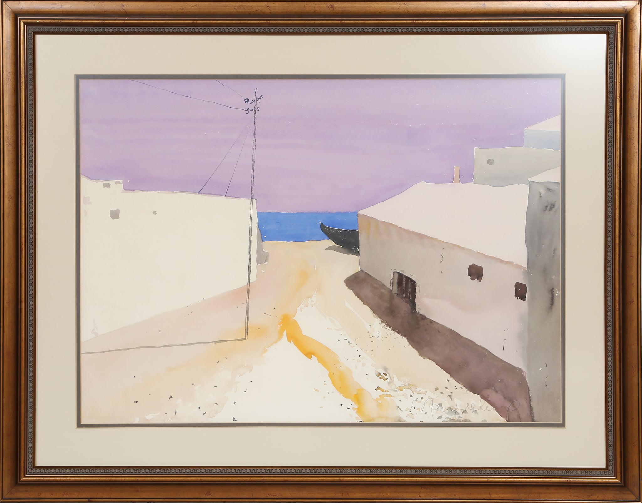 French artist Emile Rampelberg has painted in this scene a relatively common view. Looking out from a simple road, the barest sliver of the sea can be seen peeking between the walls of white-washed houses. Where the blue sky should be, however, is instead a lavender one, devoid of any clouds and broken only by a few sharp cuts of a telephone pole and power lines. This purple sky and the bright sand and houses make the whole tableau feel almost alien, as though this image was painted from a beach on a world not our own. Provenance: Galerie Felix Vercel, New York.