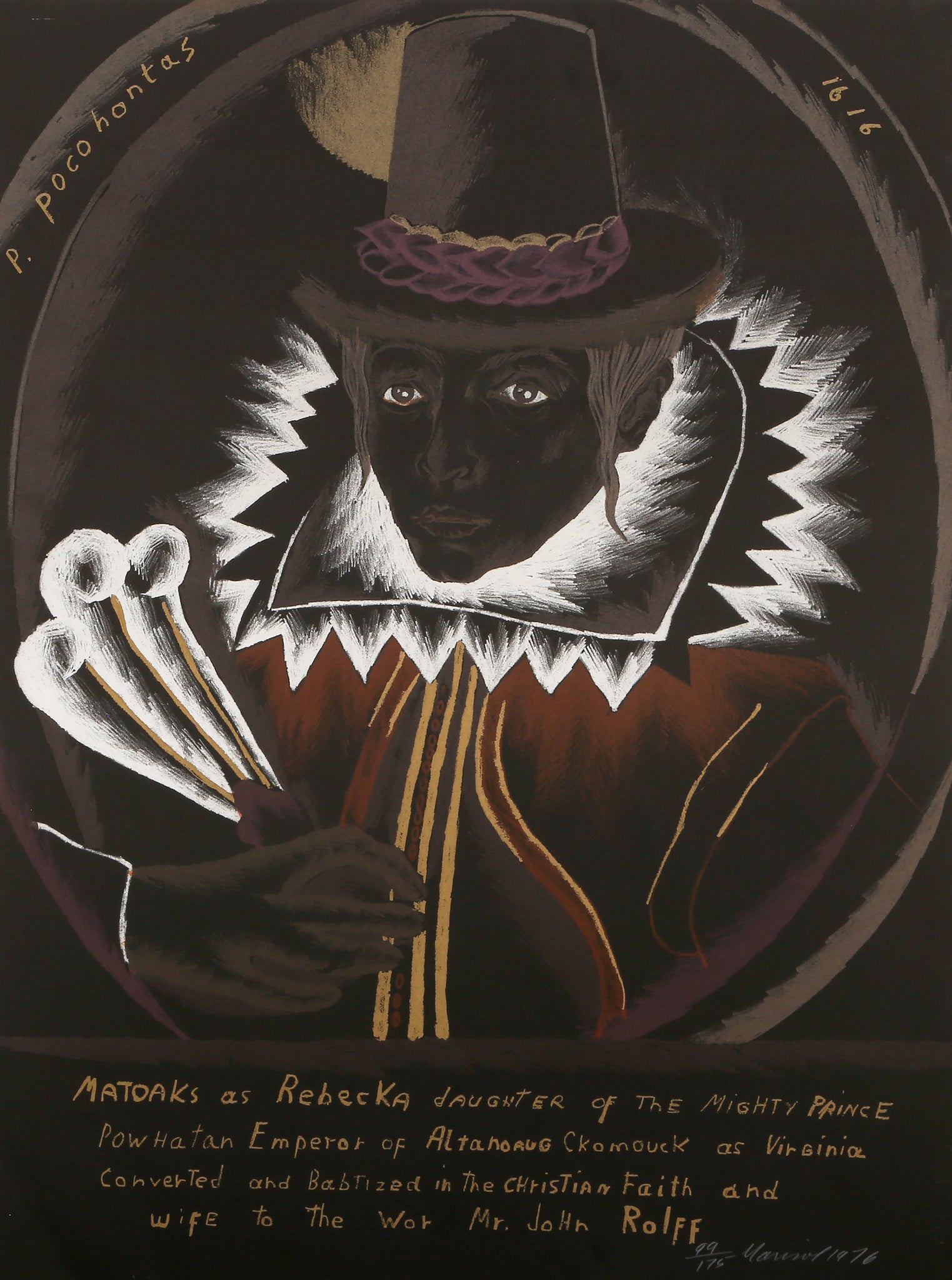 Marisol Escobar, French/Venezuelan (1930 - 2016) - Pocahontas, Portfolio: Bicentennial portfolio, "An American Portrait, 1776 - 1976", Year: 1976, Medium: Lithograph on BFK Rives, signed, numbered and dated in pencil, Edition: 99/175, Size: 26 x 19.75 in. (66.04 x 50.17 cm), Publisher: Transworld Art, New York