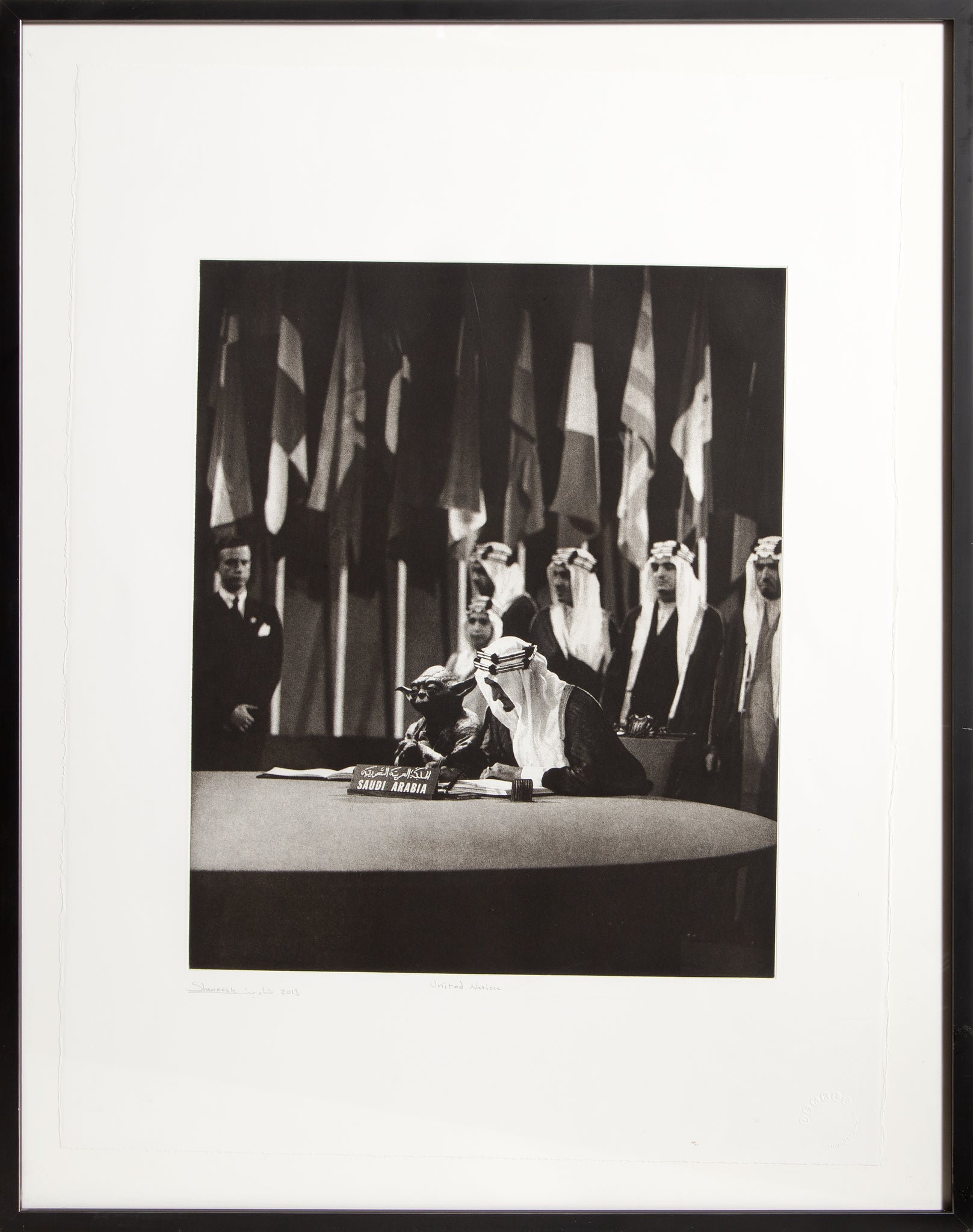 This photograph by Abdullah Al Jahdhami, aka Shaweesh, showed up in the history textbooks of Saudi Arabian students in 2017. It depicts King Faisal of Saudi Arabia signing the UN Charter in 1945. However, the image was altered to include Yoda, the fictional Jedi Master from the Star Wars Universe, sitting next to him at the table. Not even the artist of the piece is sure how the image made it into the textbooks.