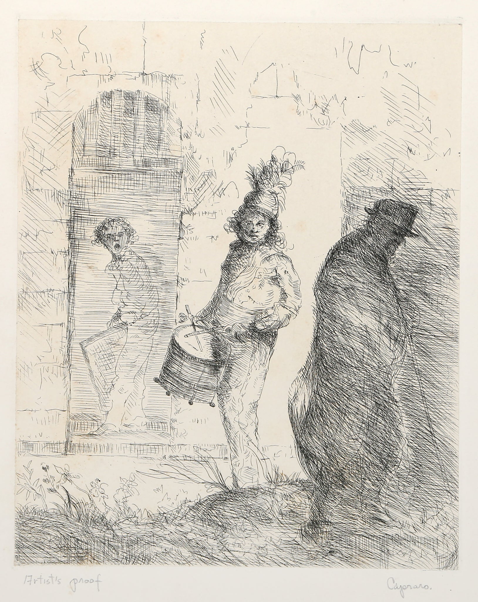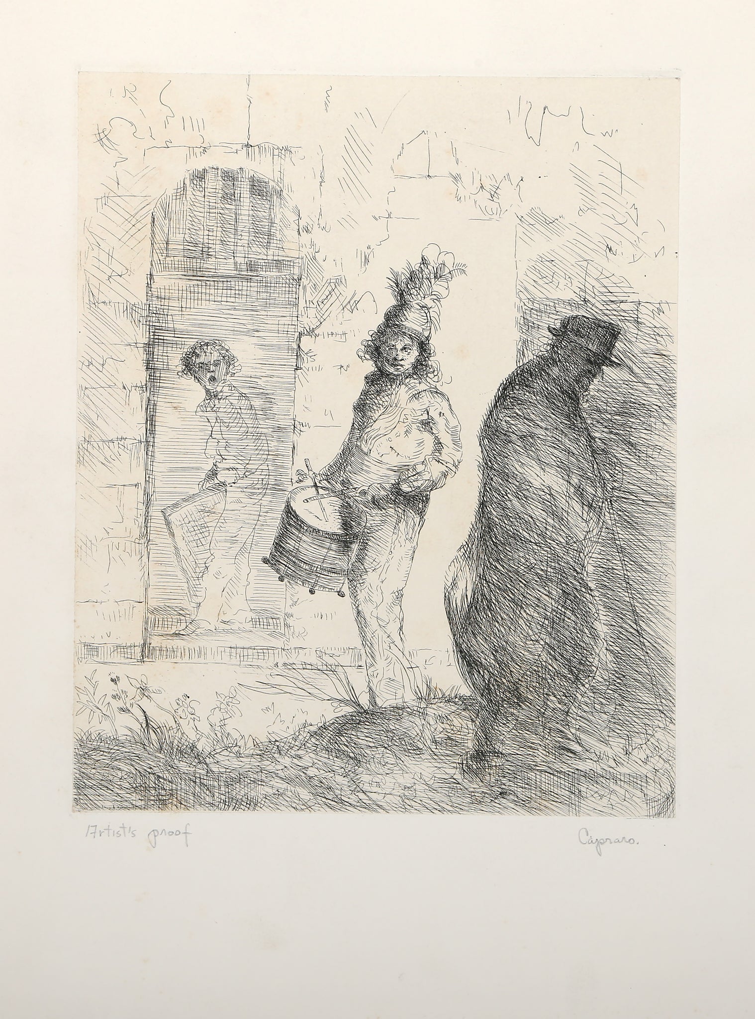 Vincent Capraro (1929 - 2016) - Drumming Man. Year: circa 1968, Medium: Etching, signed and numbered in pencil, Edition: AP, Image Size: 9.75 x 7.75 inches, Size: 13.5 x 10 in. (34.29 x 25.4 cm)