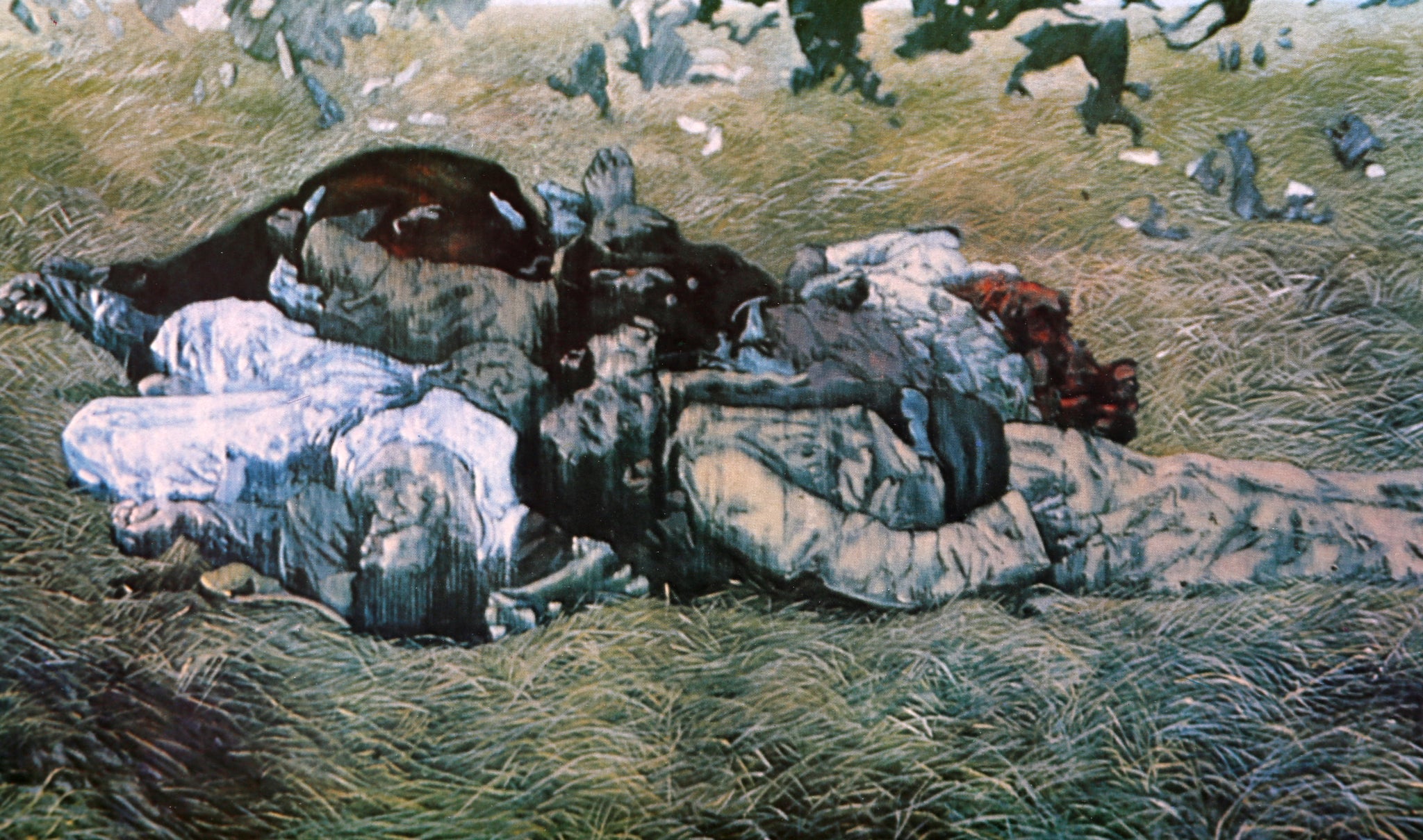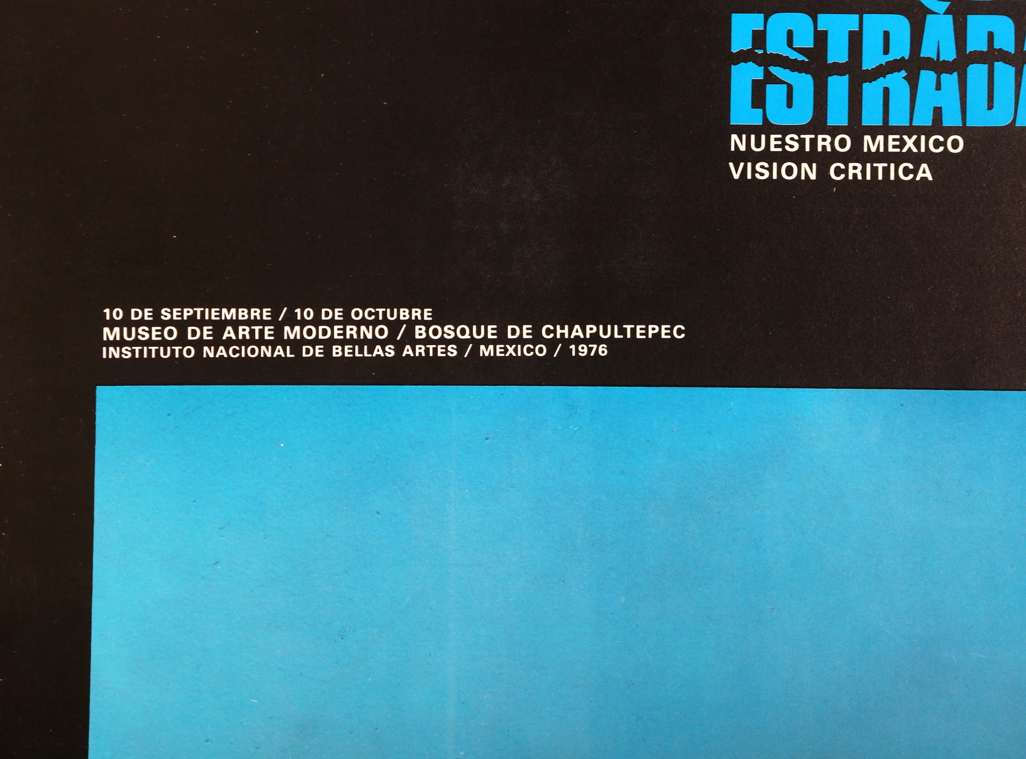 This is a poster for an exhibition of art by Enrique Estrada at Museo de Arte Moderno in 1976. The black poster features an artwork by the artist that appears to show a pile of people on an empty landscape.