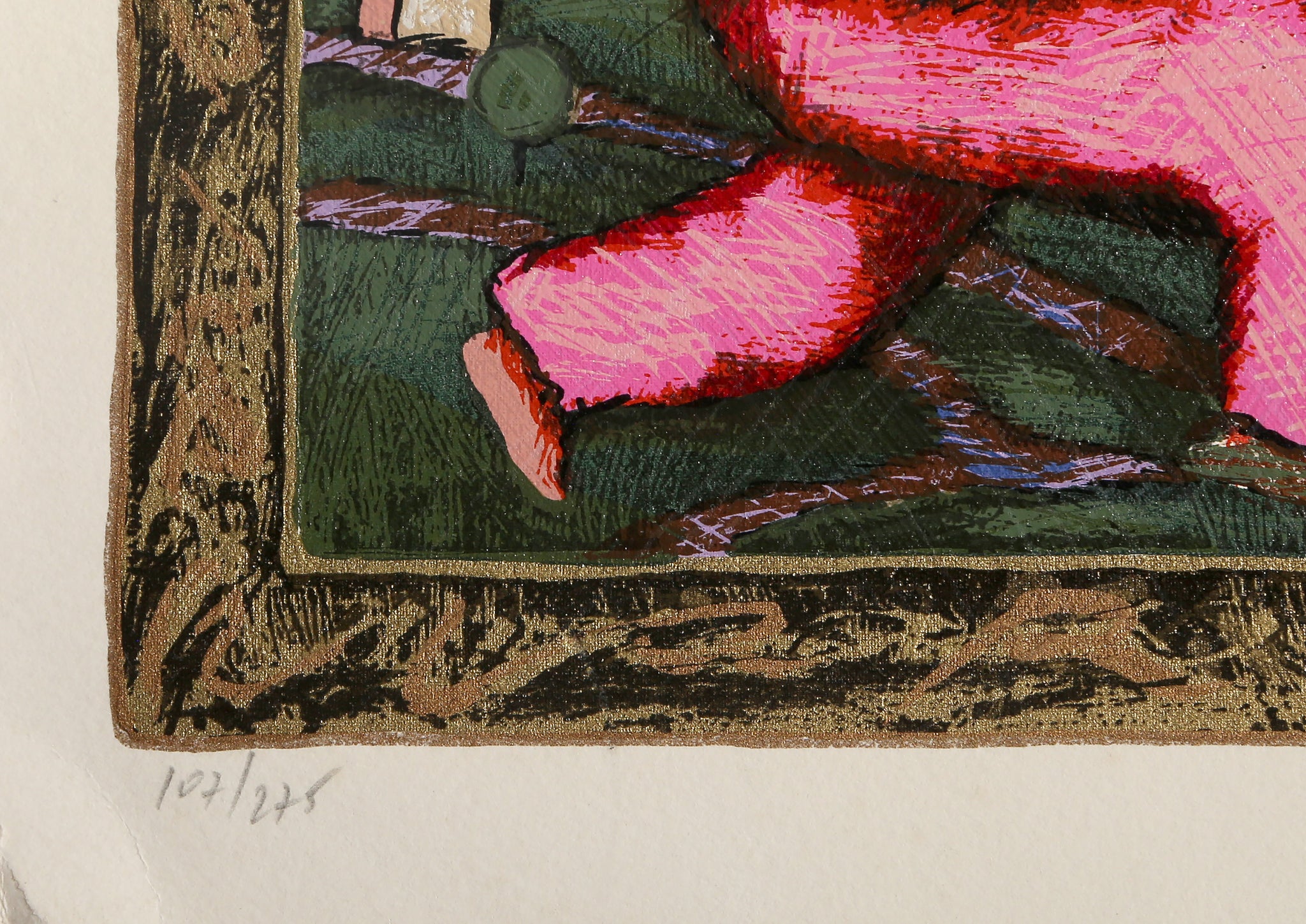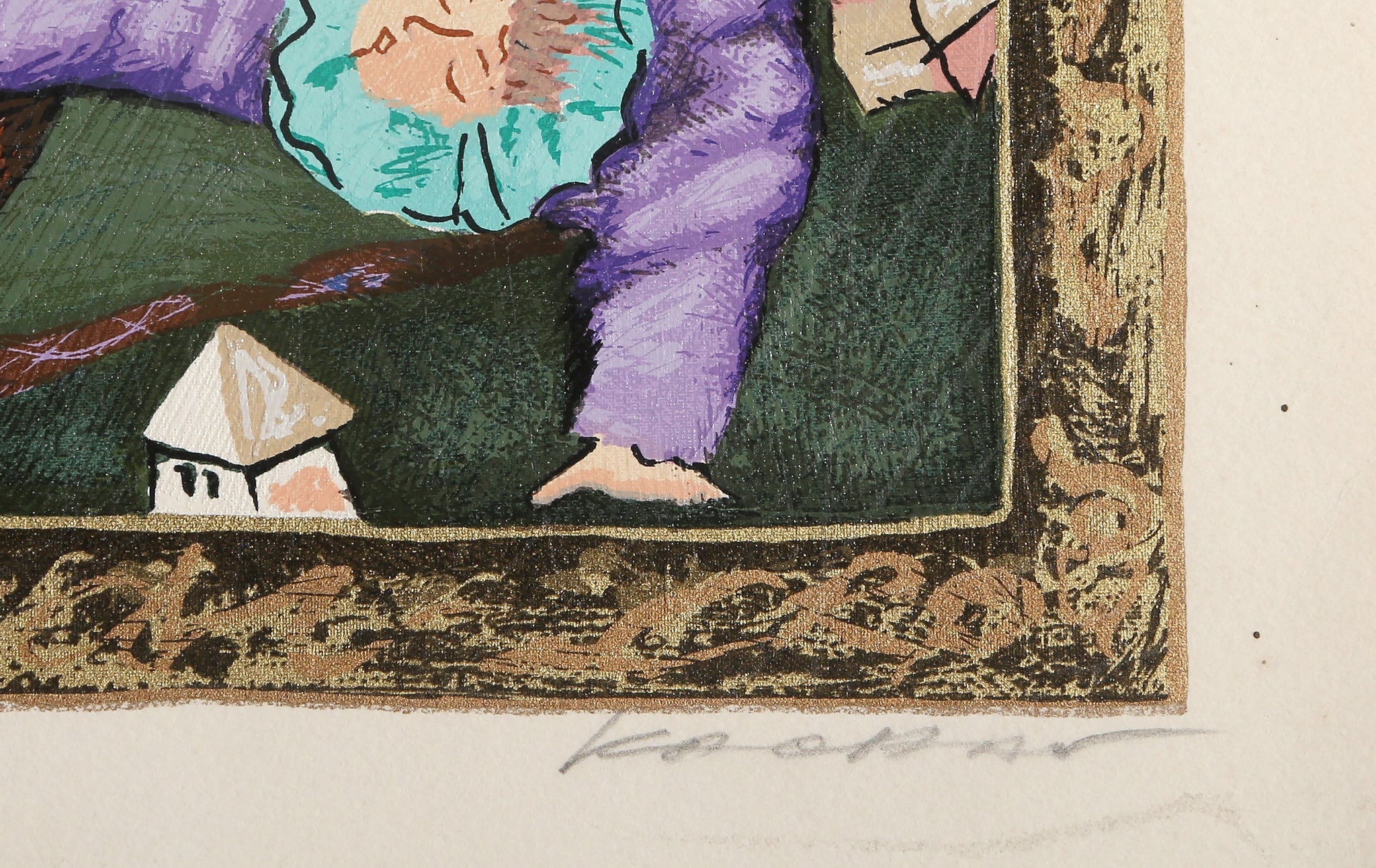 Carnival is a vibrant hand-signed screenprint that celebrates folk art traditions through its depiction of dancing figures and doves in a lush green valley landscape. This pop art and music art influenced piece captures the joyful spirit of a town carnival with its dynamic composition of figures in motion, musical elements, and the peaceful presence of doves overhead. The print's bold colors and folk art styling create a festive atmosphere that brings the energy of celebration into any space.