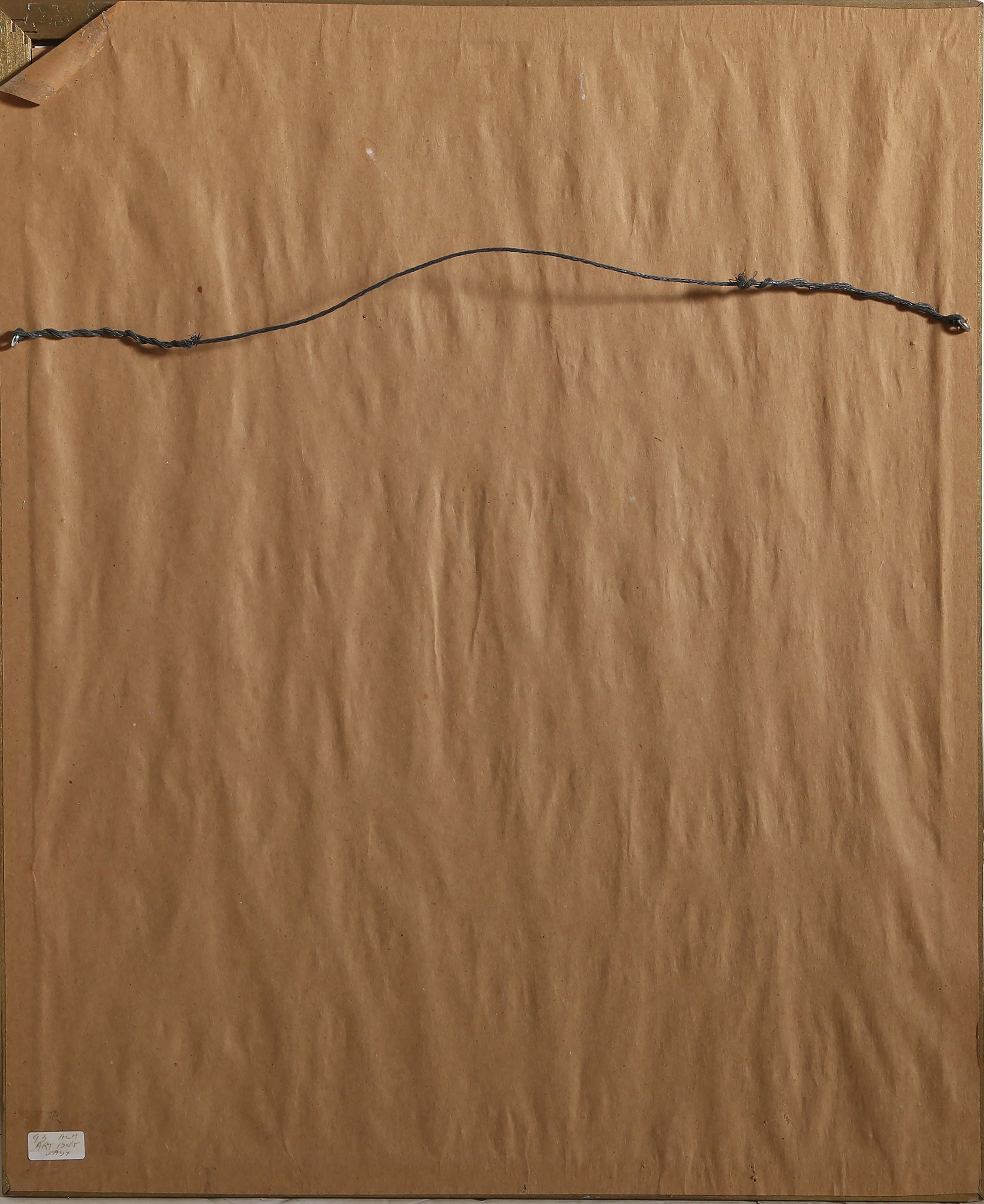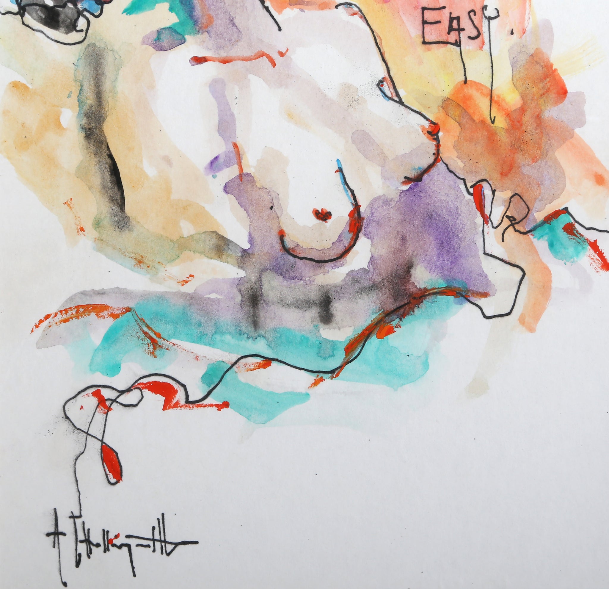 A hand-colored lithograph by African American artist Alvin Carl Hollingsworth. This print shows a nude figure with messy dark hair, tied back with red ribbons. Their head is tilted back as the figure looks softly to the sky. All around is a wash of bright splashes of color.