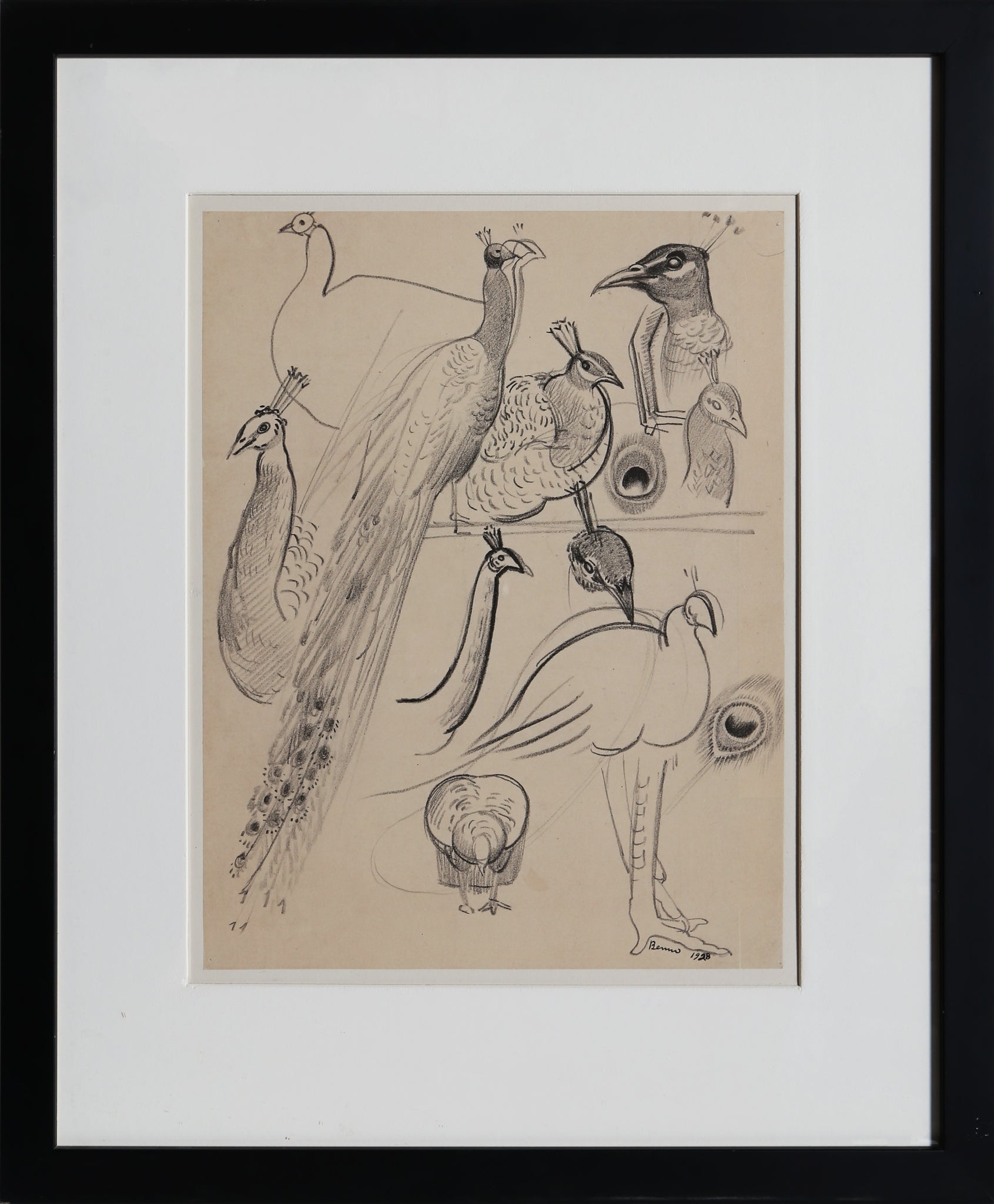 Sketch of birds by cubitst artist Benjamin Benno. The image features several detailed studies of peacocks. By the early 1930s he had established a reputation as a member of the international avant-garde and exhibited with the most significant European artists including Paul Klee, Max Ernst, Wassily Kandinsky, Salvador Dalí, Joan Miró, Hans Arp, and Fernand Léger. Pablo Picasso sponsored Benno’s first one-man show in Paris in 1934.