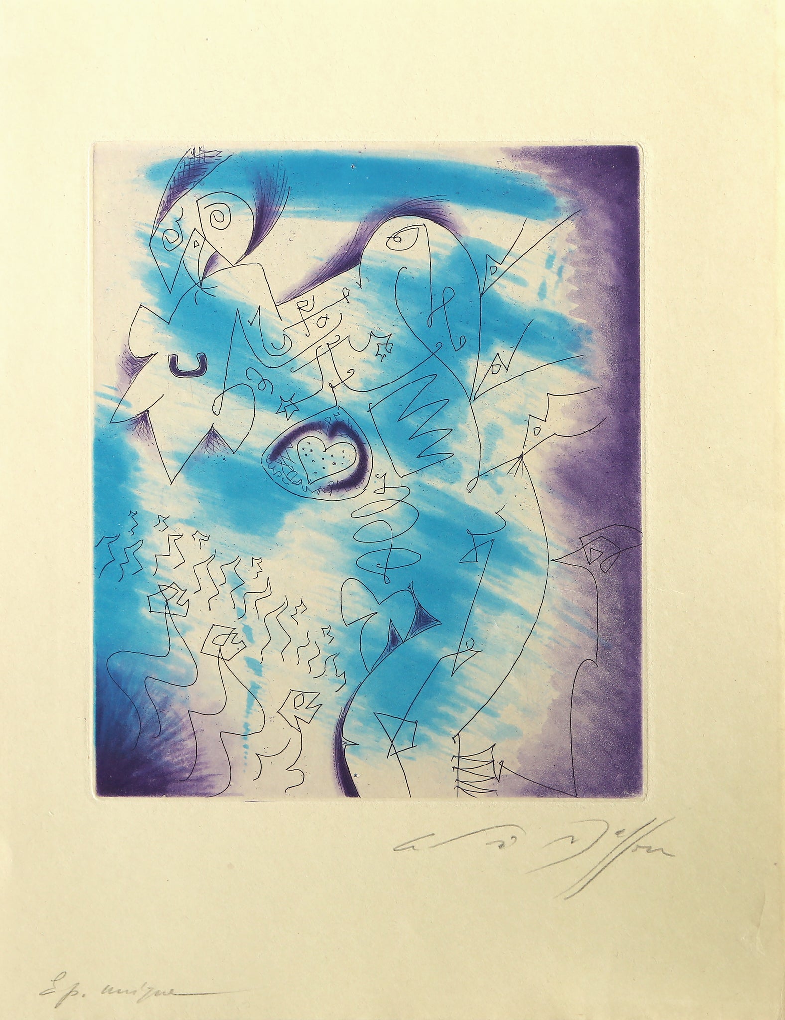 Andre Masson, French (1896 - 1987) - Blue Heart. Year: circa 1968, Medium: Etching and Aquatint, signed in pencil, Image Size: 8 x 6.75 inches, Size: 12.75 x 9.75 in. (32.39 x 24.77 cm), Provenance: From the collection of the late Larry Saphire.