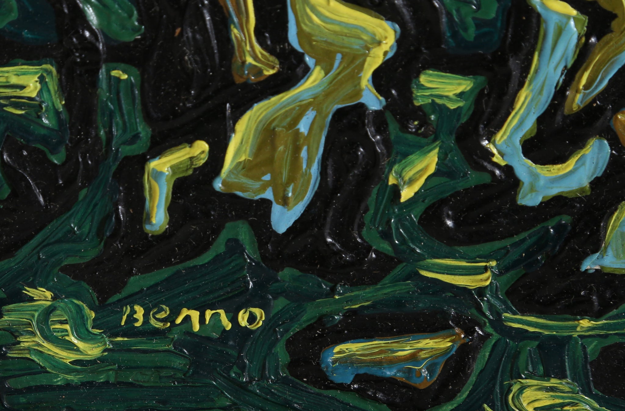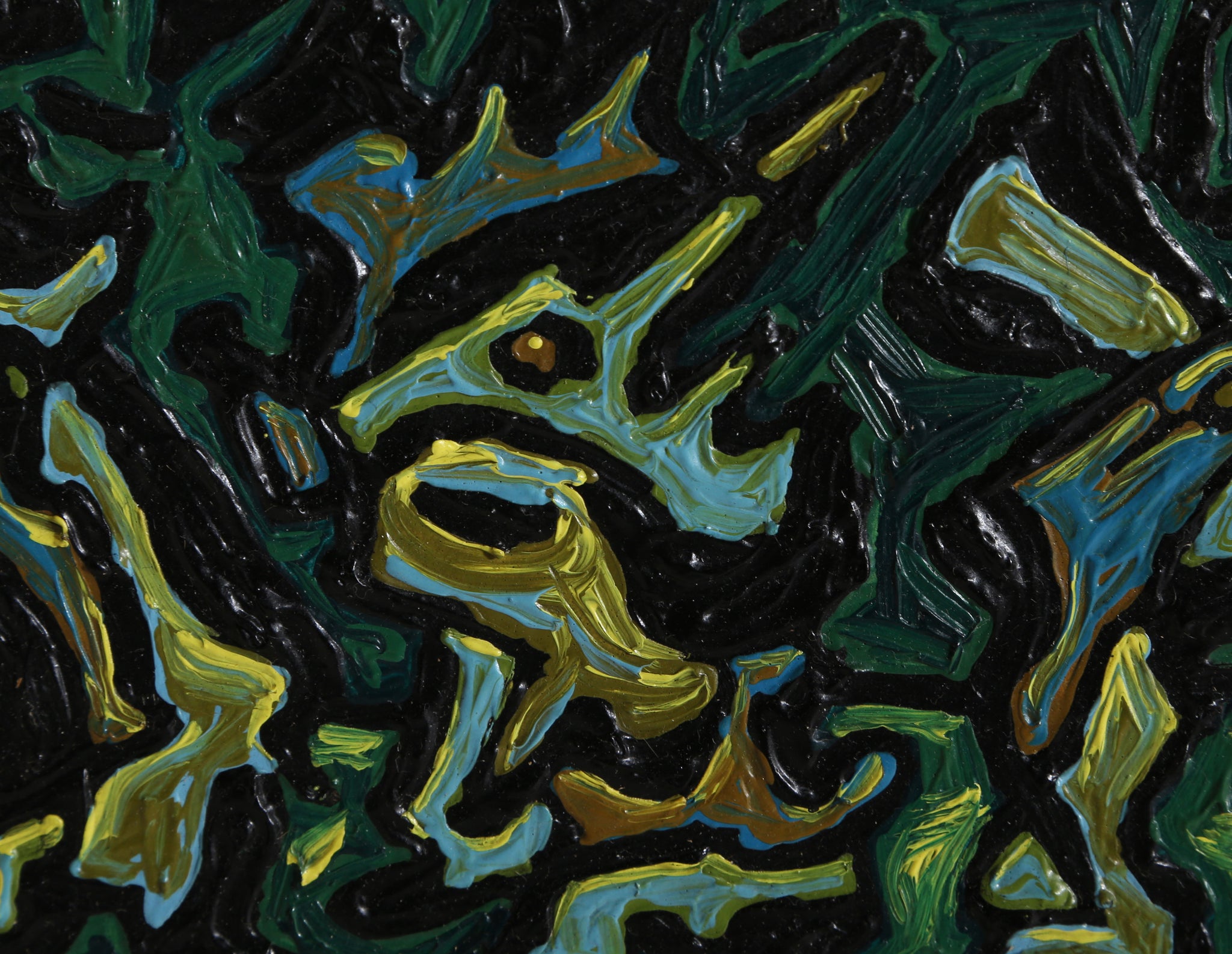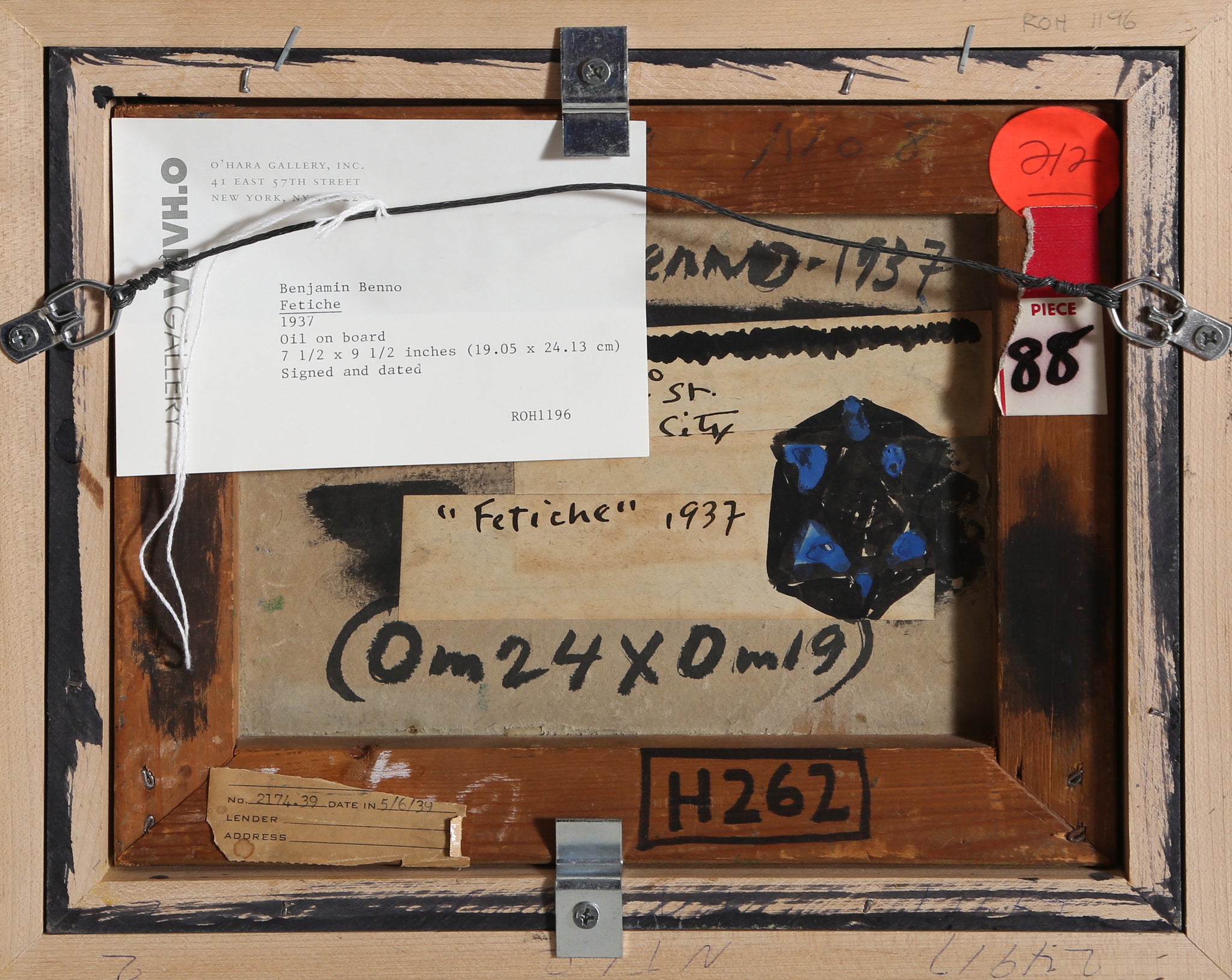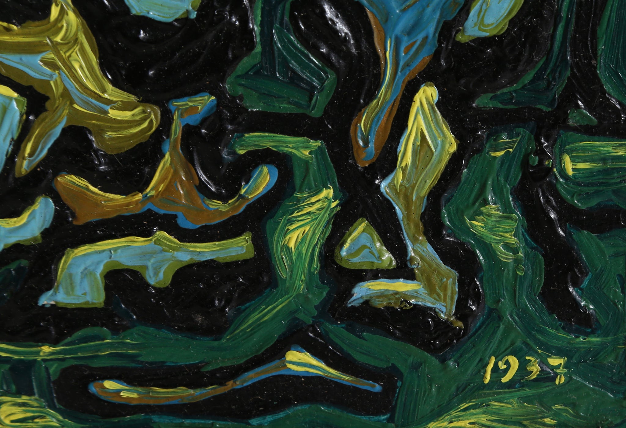Benjamin Benno, American (1901 - 1980) - Fetiche 6. Year: 1937, Medium: Oil on board, signed and dated, Size: 7.5 x 9.5 in. (19.05 x 24.13 cm), Frame Size: 9.75 x 11.75 inches, Description: Set against a deep green background of layered paint and wavy lines, Benjamin Benno's textured composition features an array of unidentifiable figures of varying sizes and shapes. This dimensional abstract work exemplifies the artist's avant-garde style of Modernism that he explored while working in Paris before World War II. By the early 1930s he had established a reputation as a member of the international avant-garde and exhibited with the most significant European artists including Paul Klee, Max Ernst, Wassily Kandinsky, Salvador Dalí, Joan Miró, Hans Arp, and Fernand Léger. Pablo Picasso sponsored Benno’s first one-man show in Paris in 1934.