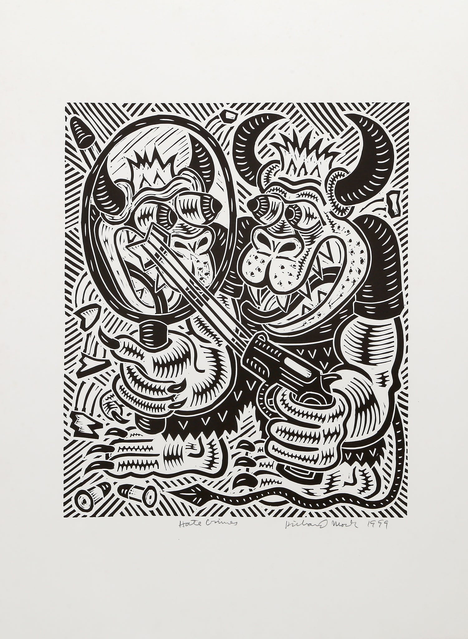 Richard Mock, American (1944 - 2006) - Hate Crimes. Year: 1999, Medium: Linocut on BFK Rives, signed, titled, numbered and dated in pencil, Edition: 80, Image Size: 19.25 x 15.75 inches, Size: 30 x 22.25 in. (76.2 x 56.52 cm)