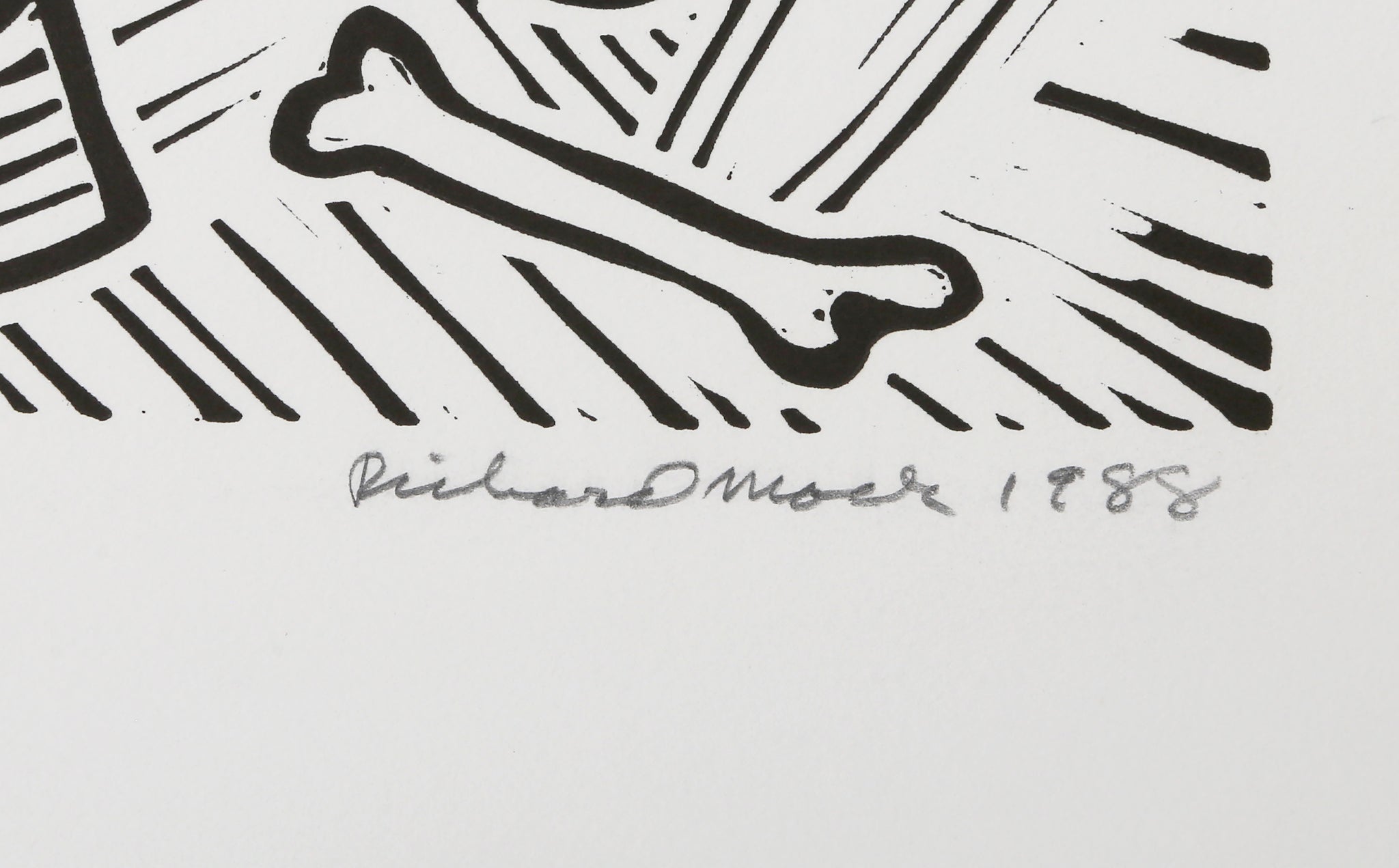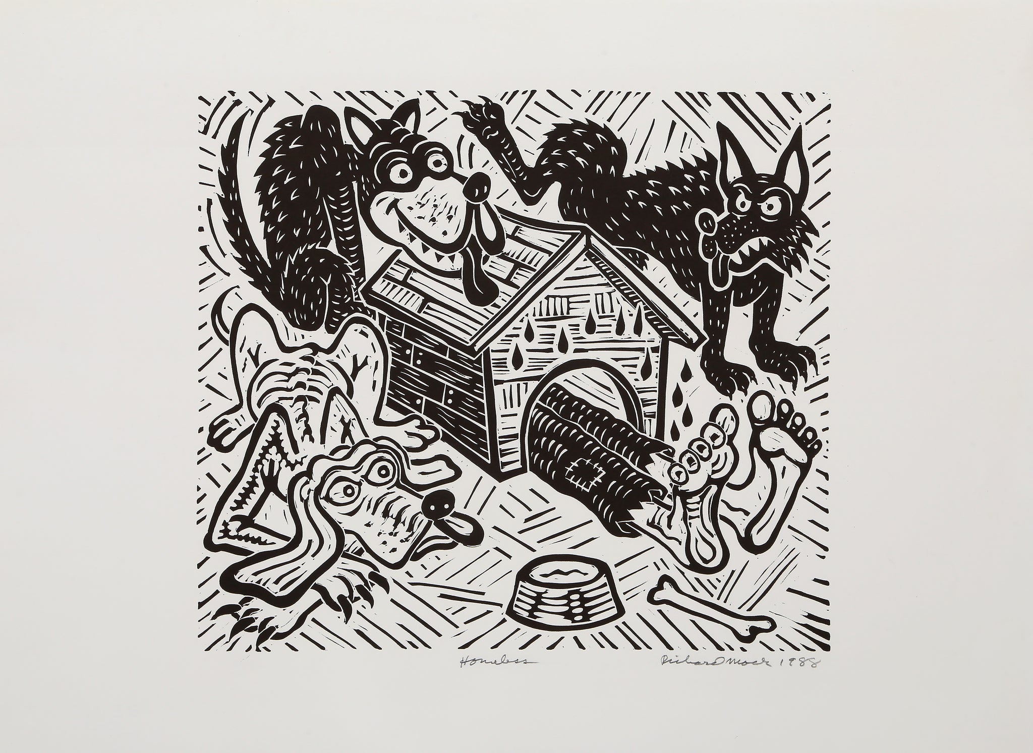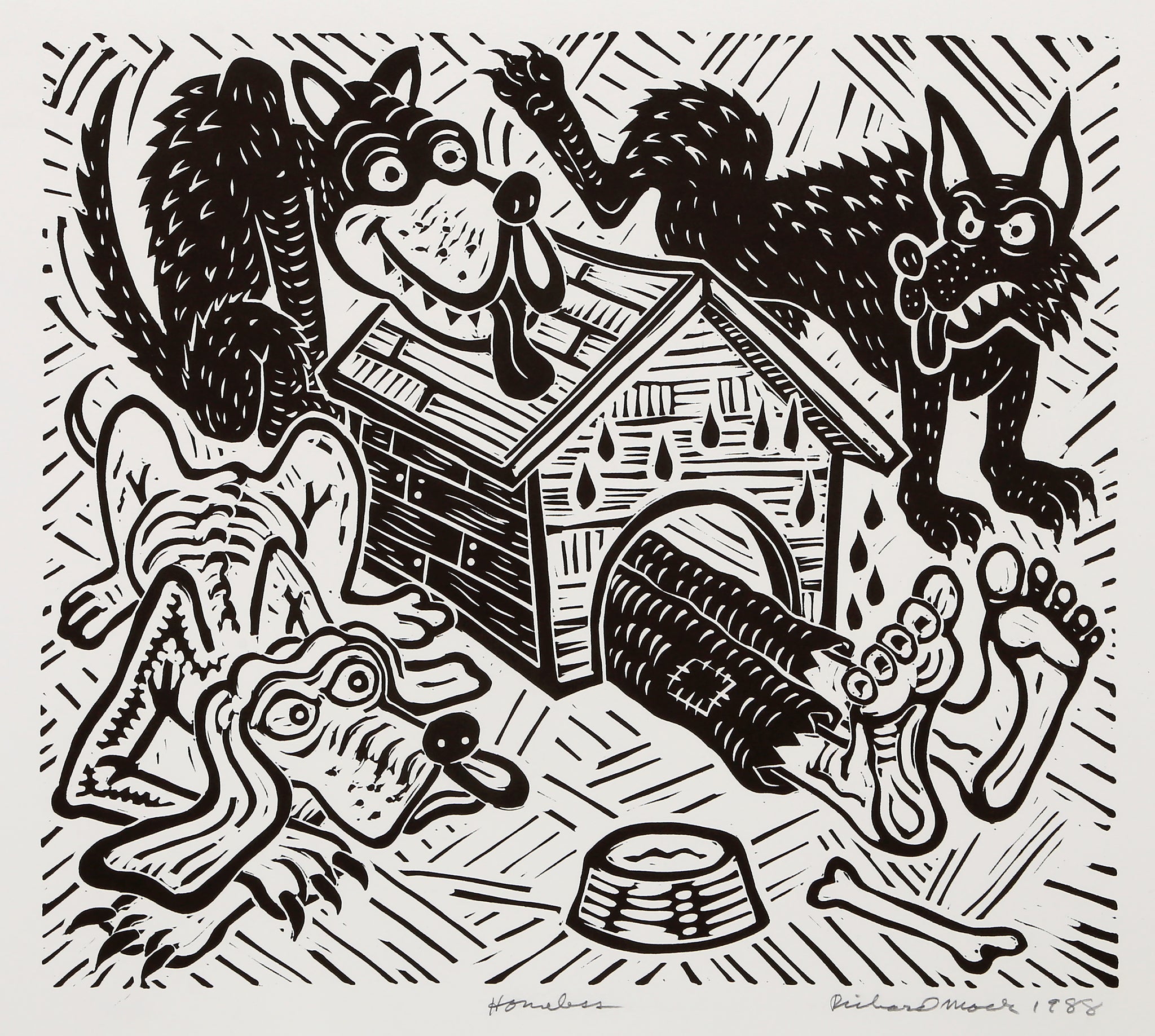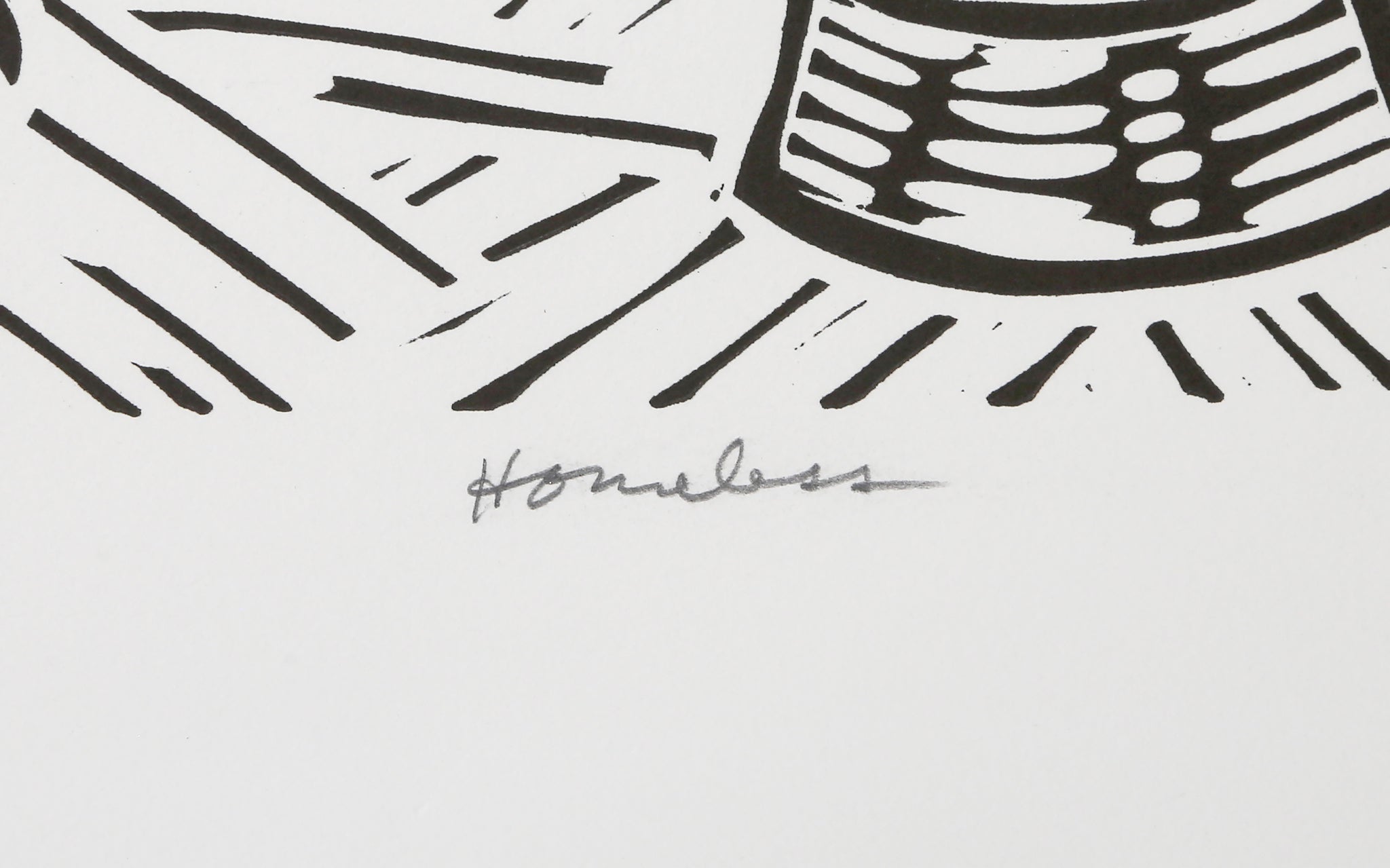 Richard Mock, American (1944 - 2006) - Homeless. Year: 1988, Medium: Linocut on BFK Rives, signed, titled, numbered and dated in pencil, Edition: 80, Image Size: 16 x 18 inches, Size: 22.25 x 30 in. (56.52 x 76.2 cm)