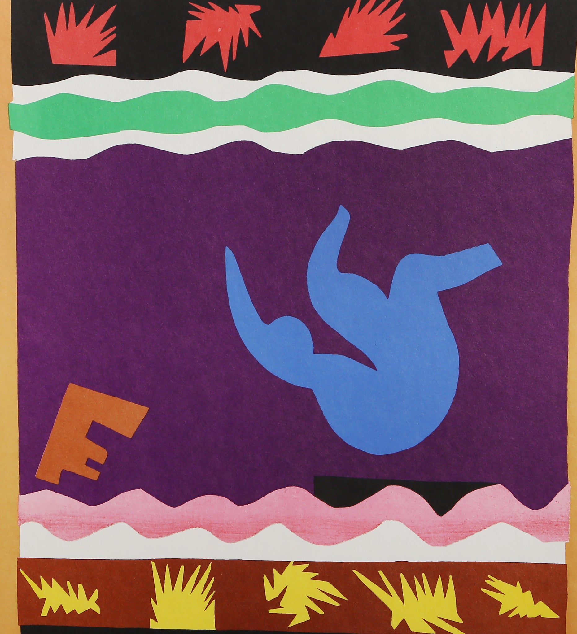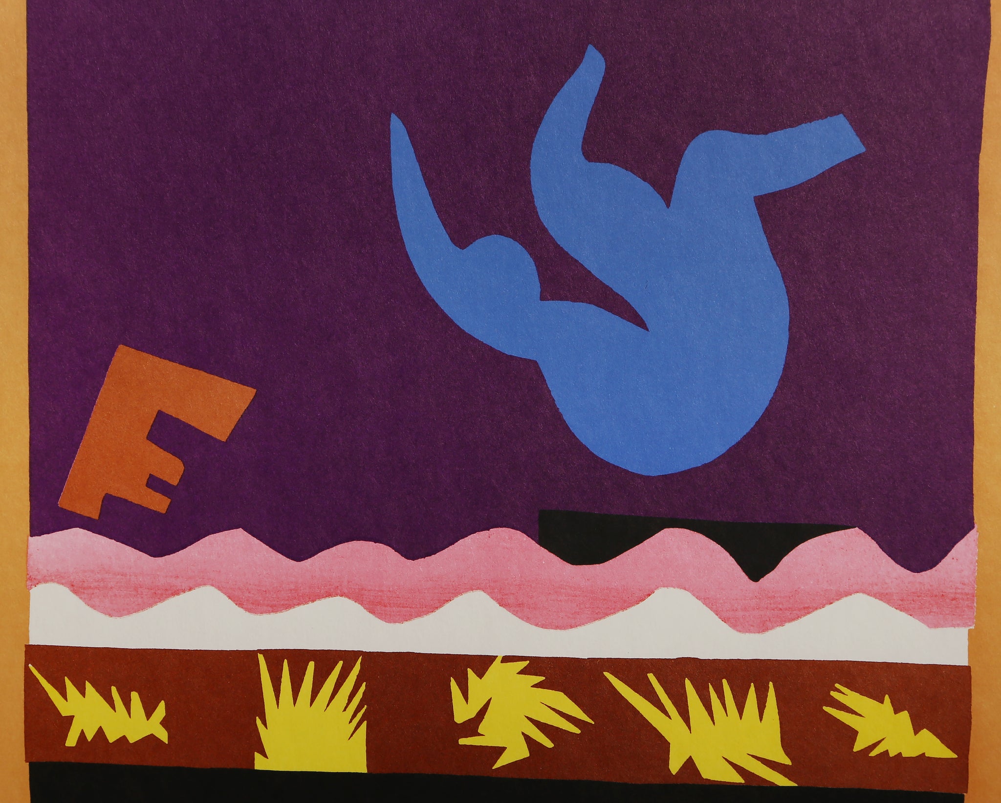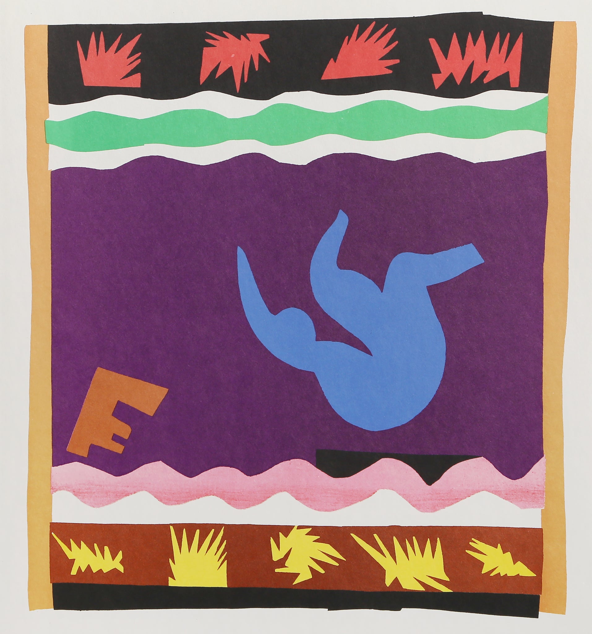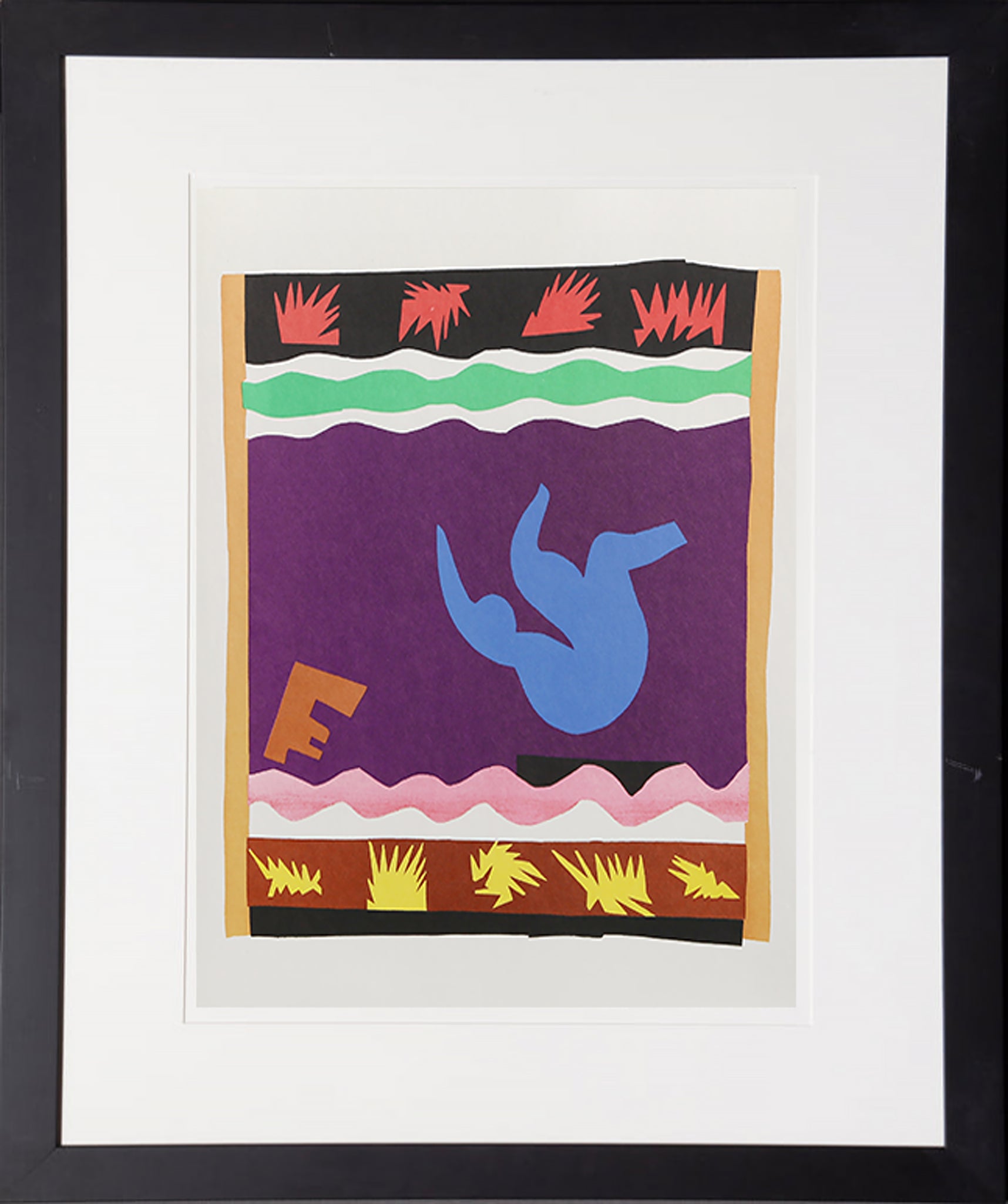 Henri Matisse, After, French (1869 - 1954) - Le Tobogan (Toboggan). Portfolio: Jazz, Year: Of Original: 1947 | Year Printed: 1983, Medium: Lithograph, Image Size: 11.5 x 10.5 inches, Size: 15.25 x 11.75 in. (38.74 x 29.85 cm), Frame Size: 19.25 x 15.75 inches, Printer: Ernst Wartelsteiner, Munich, West Germany, Publisher: George Braziler Inc., Description: This plate is one of twenty made to illustrate Henri Matisse's groundbreaking book "Jazz". Despite its musical title - likely named for the experimental, improvisational nature of its compositions - the book's dominant themes are the circus and theater. The illustrations derive from maquettes of cut and pasted colored papers. From Edition for MoMA 1983 published by George Brazilier. Nicely Framed