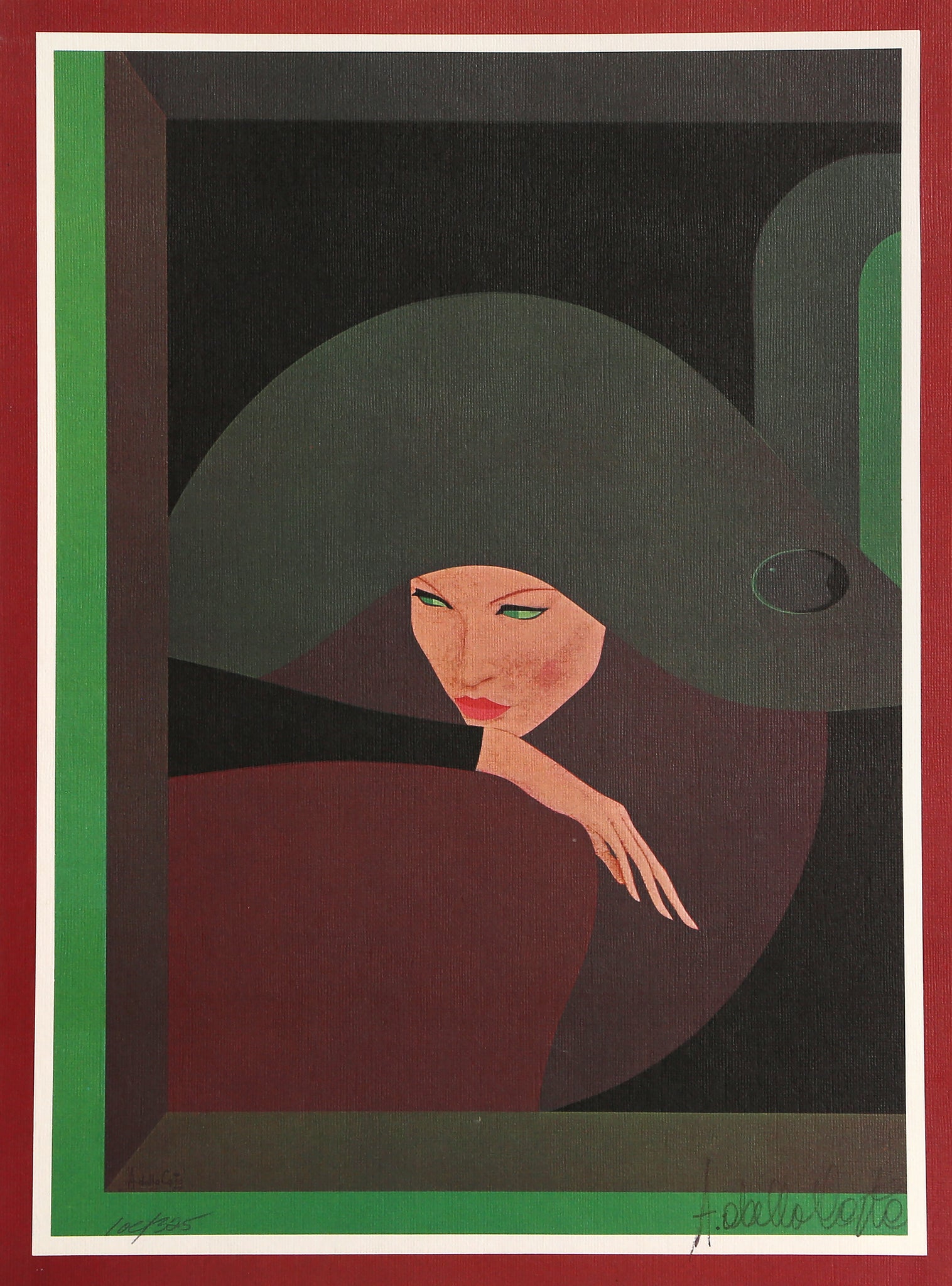Amleto Dalla Costa's hand-signed Art Deco poster presents a seated woman rendered in elegant geometric forms and modern styling. The composition exemplifies the sophisticated simplicity of Art Deco portraiture with its clean lines and decorative sensibility. This stylish print appeals to collectors of Art Deco design and vintage poster art seeking artwork that captures the timeless elegance and graphic sophistication of early 20th-century modernist aesthetics.