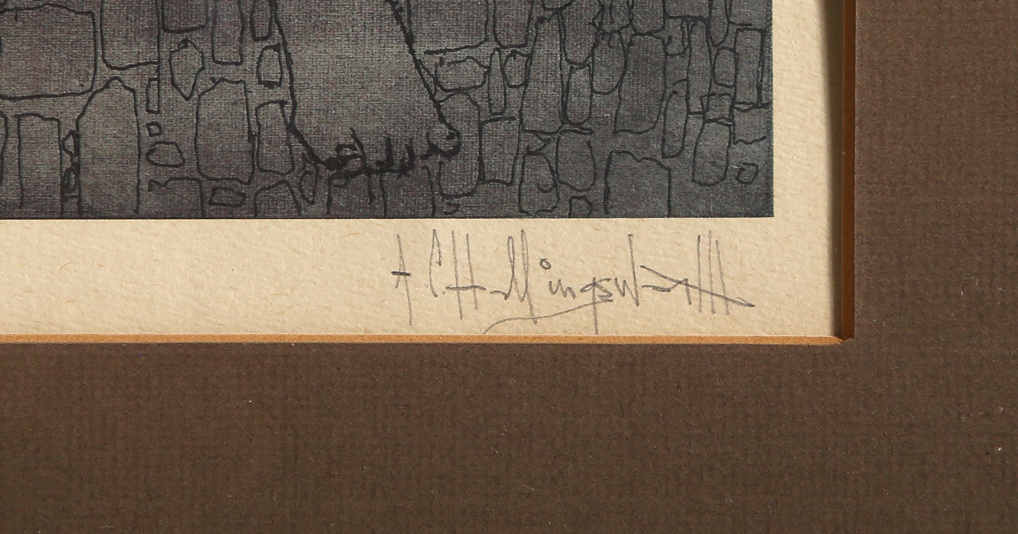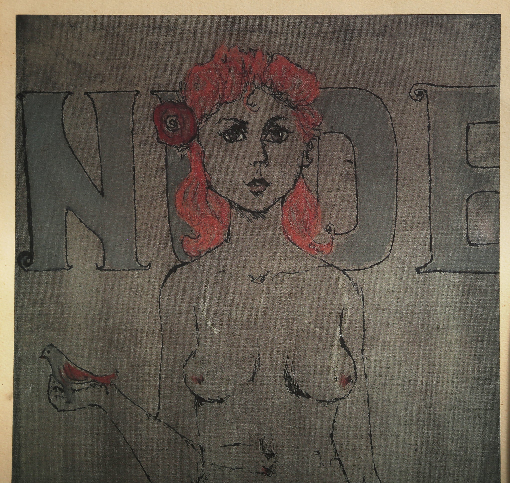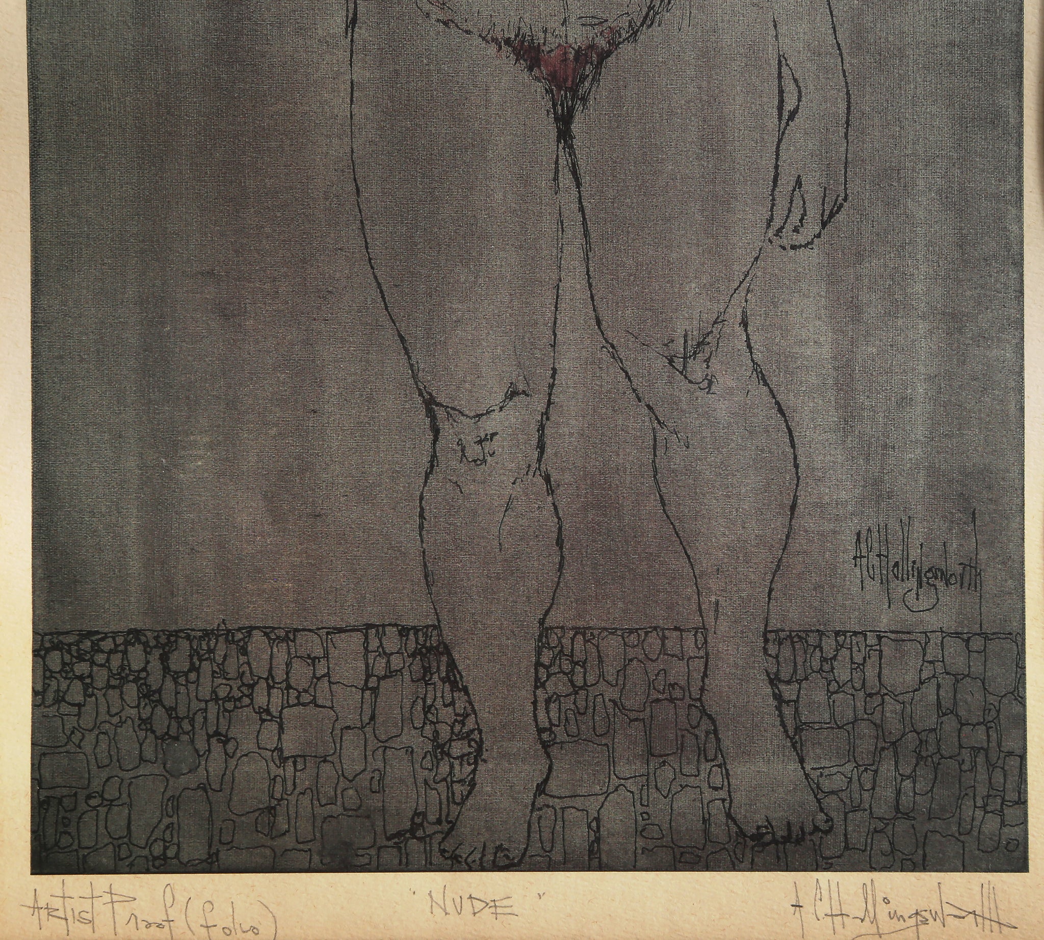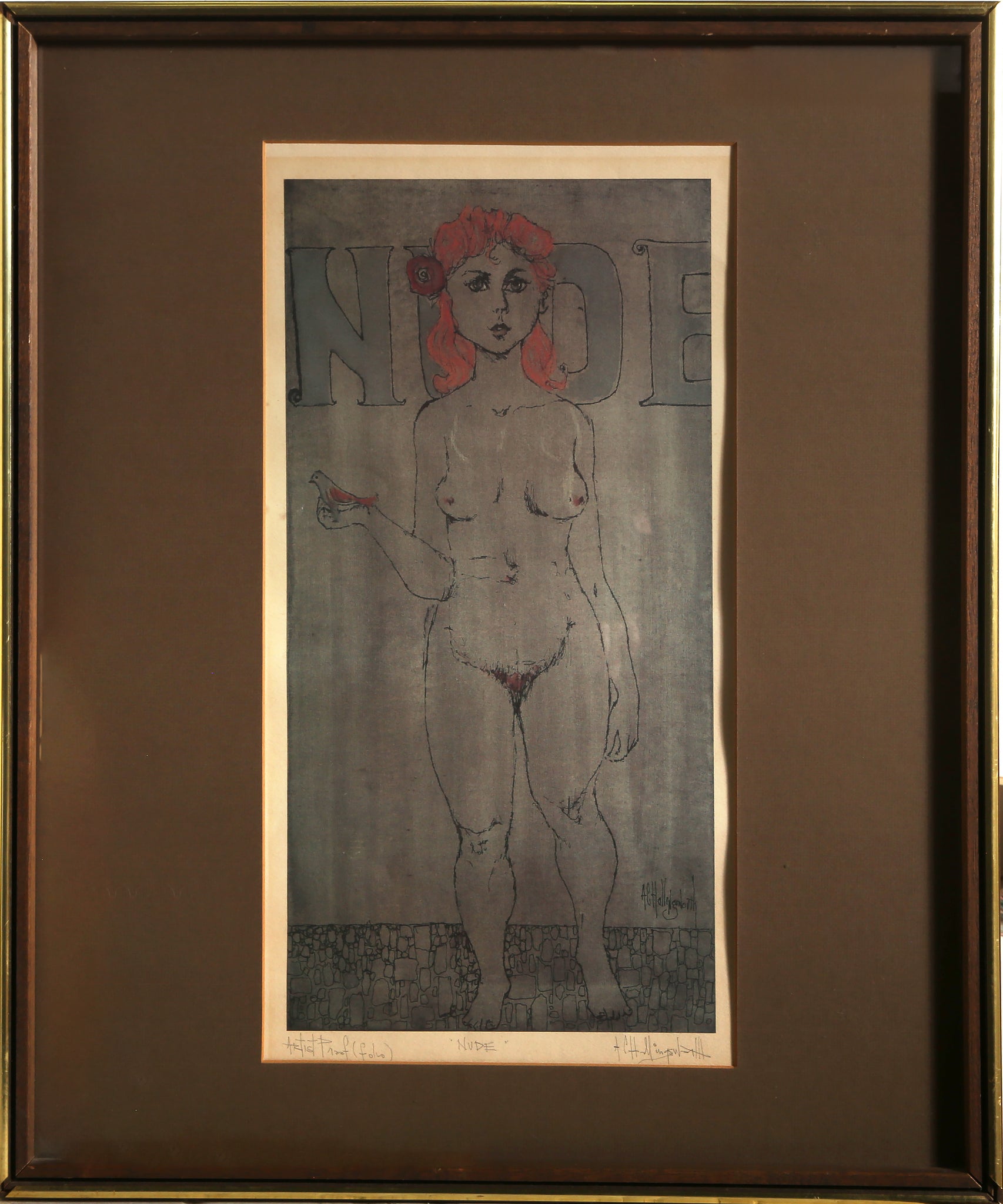 This lithograph by African American artist Alvin Carl Hollingsworth is hand colored and signed, titled, and numbered in pencil. It features a nude, red-headed figure, standing before a wall with large indiscernible text on it. The print is nicely framed.