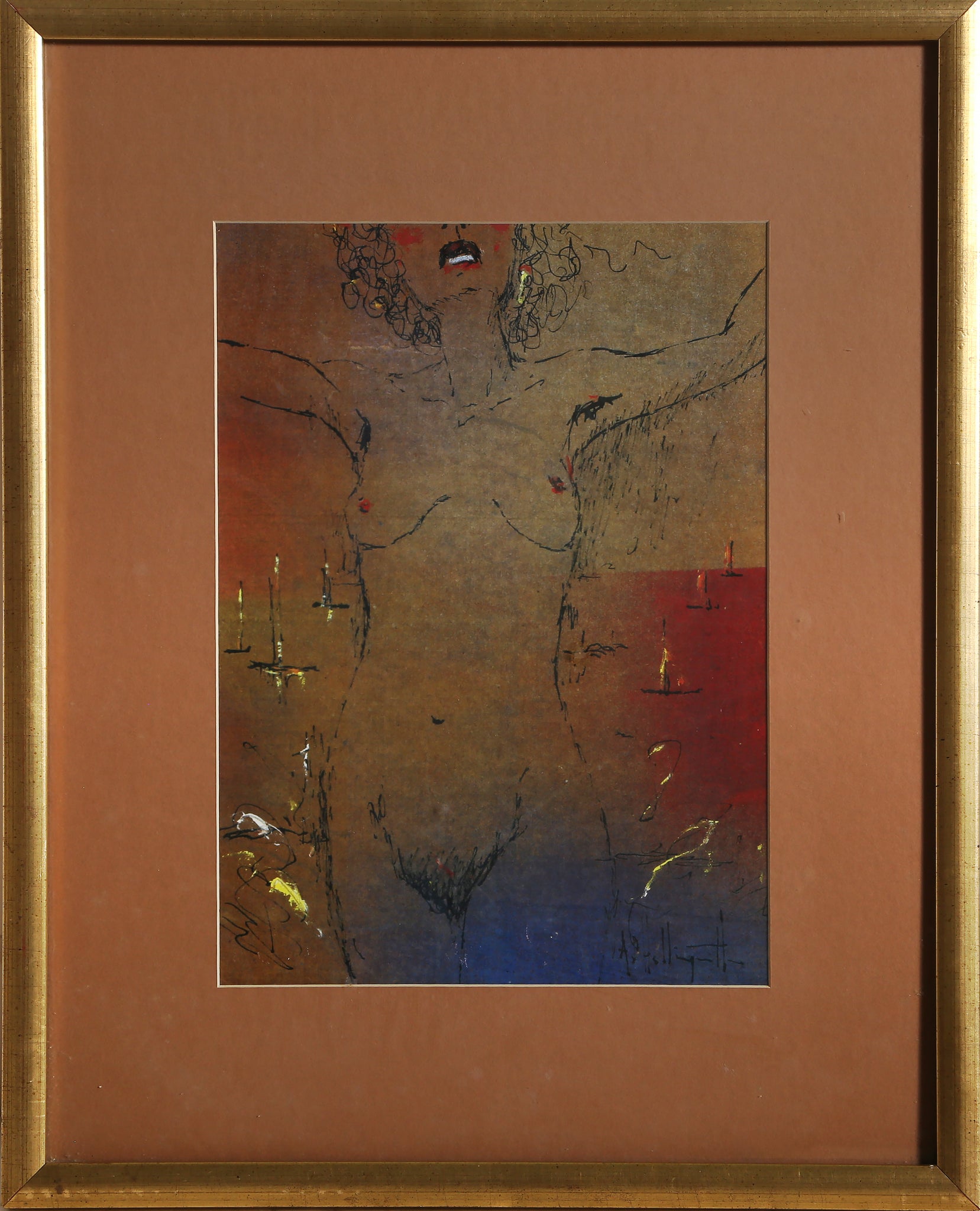 This detailed nude lithograph is by African American artist Alvin Carl Hollingsworth. The composition, signed in the plate lower right, focuses on the torso of a figure and surrounds them with muted primary colors and splashes of bright yellow.
