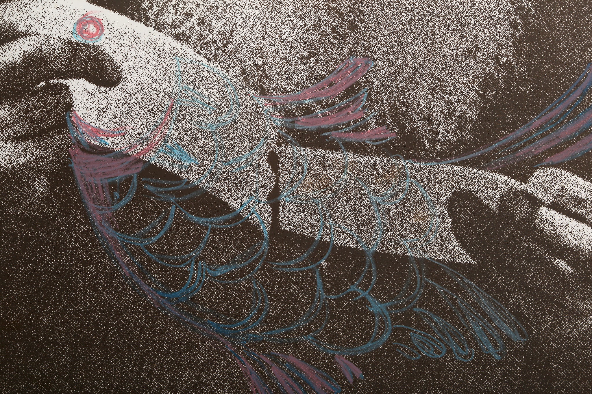 Own this distinctive hand-colored conceptual art monoprint portrait of an elderly man, featuring intricate color pencil work and captivating overlay techniques. This unique print combines traditional drawing methods with contemporary conceptual approaches to create a deeply personal and thought-provoking portrait. The artist's careful hand-coloring adds warmth and dimension to the layered composition. An exceptional piece for collectors of conceptual art, portrait prints, and those who value the intimate quality of hand-colored works that explore themes of age and human experience.