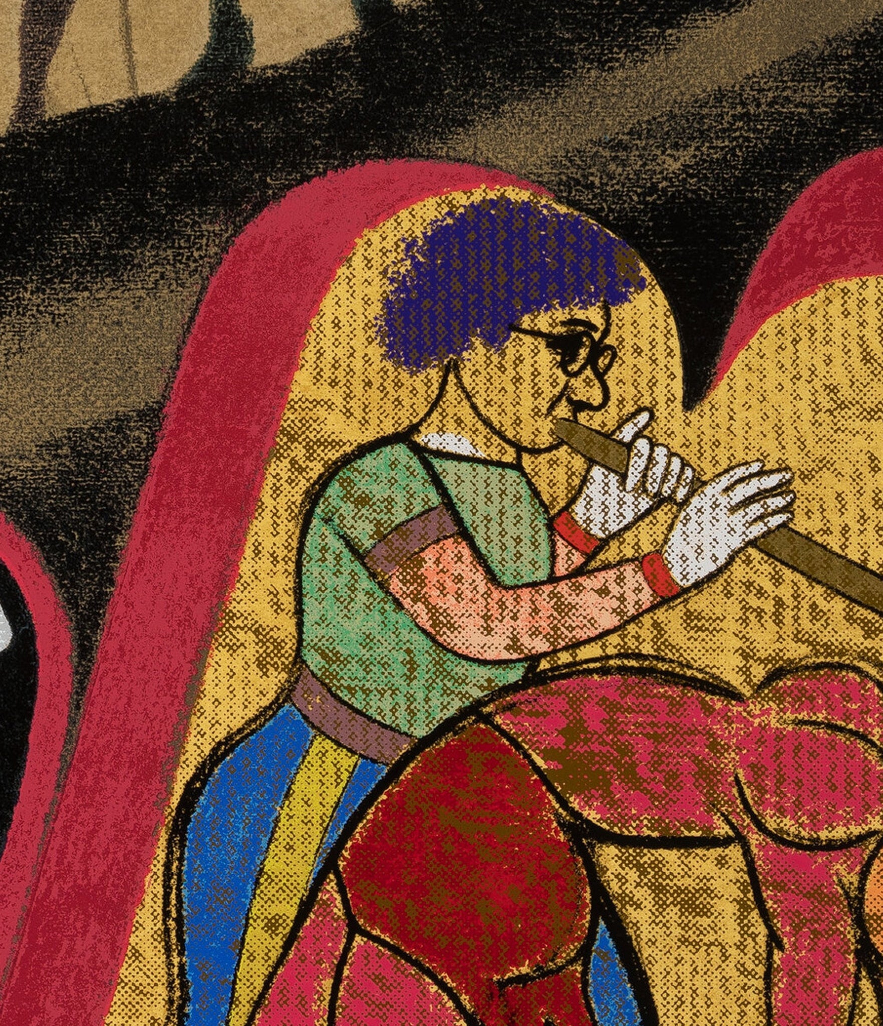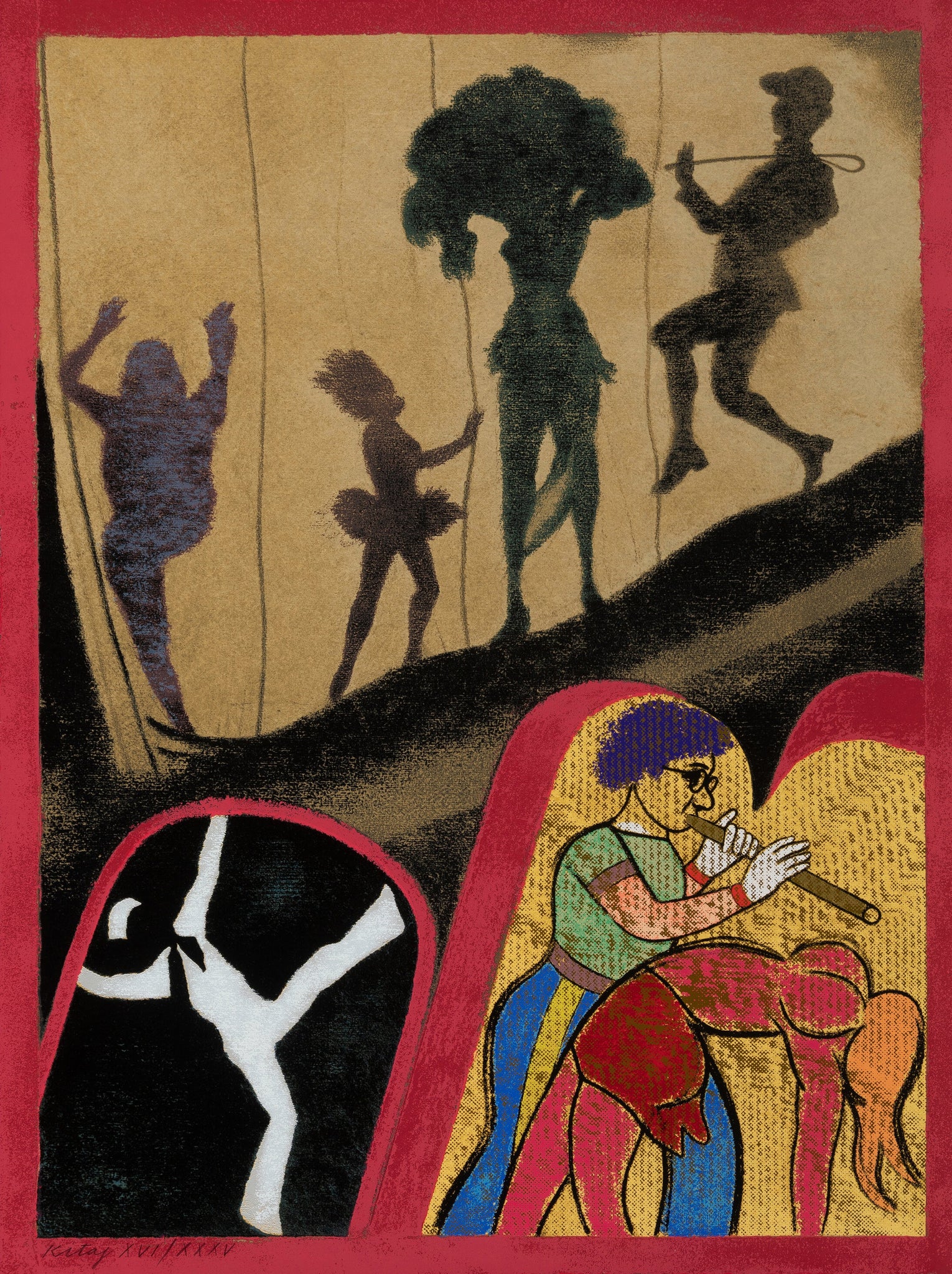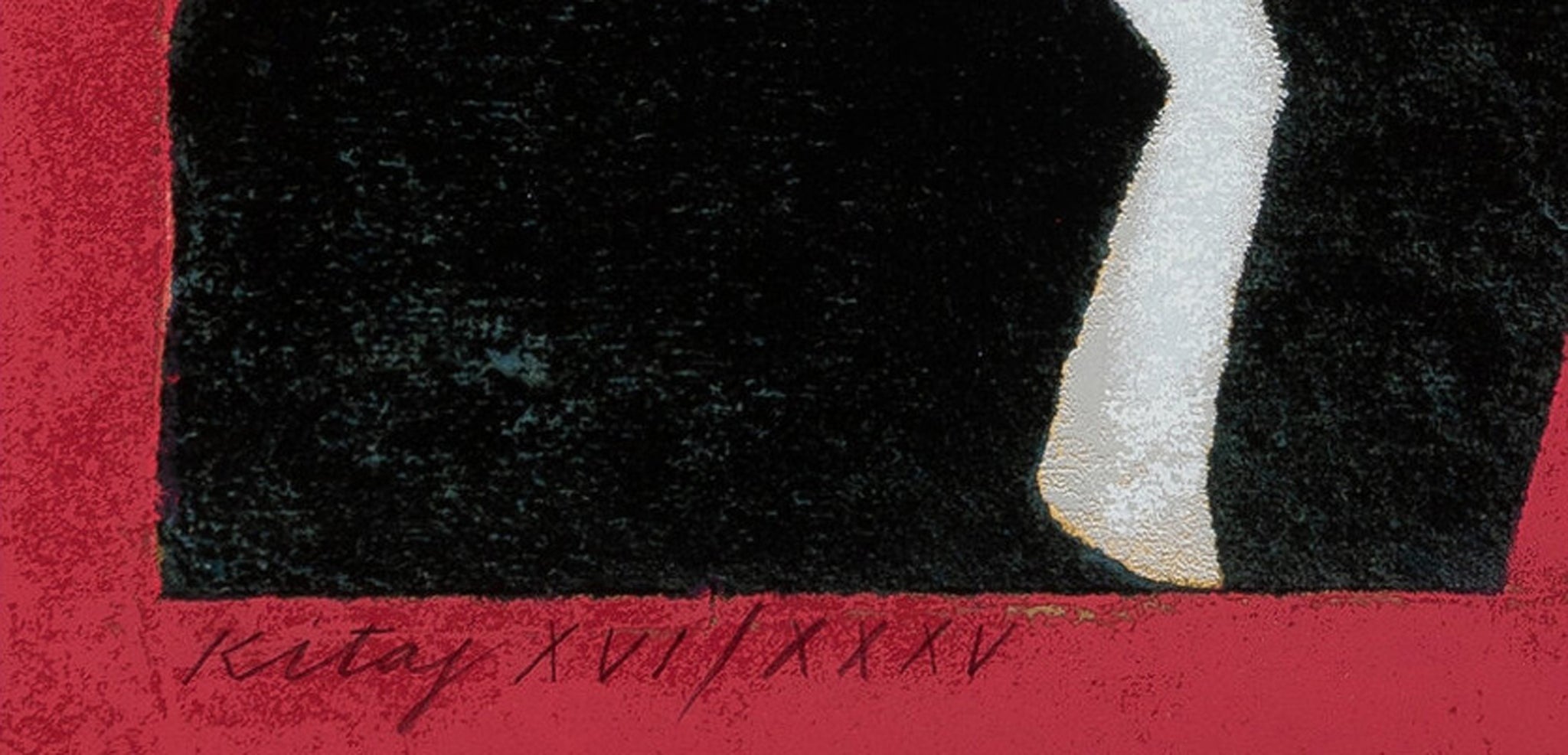 This print by R.B. Kitaj is part of an 8-piece portfolio published by The New York Graphic Society in 1983 and includes works from Red Grooms, Robert Indiana, Alex Katz, R.B. Kitaj, Robert Motherwell, Robert Rauschenberg, Larry Rivers, and James Rosenquist. The portfolio consists of two lithographs, five screenprints, and one mixed media print all on various wove papers, each signed and editioned in pencil along lower edge. This is from the edition of XVI/XXXV.